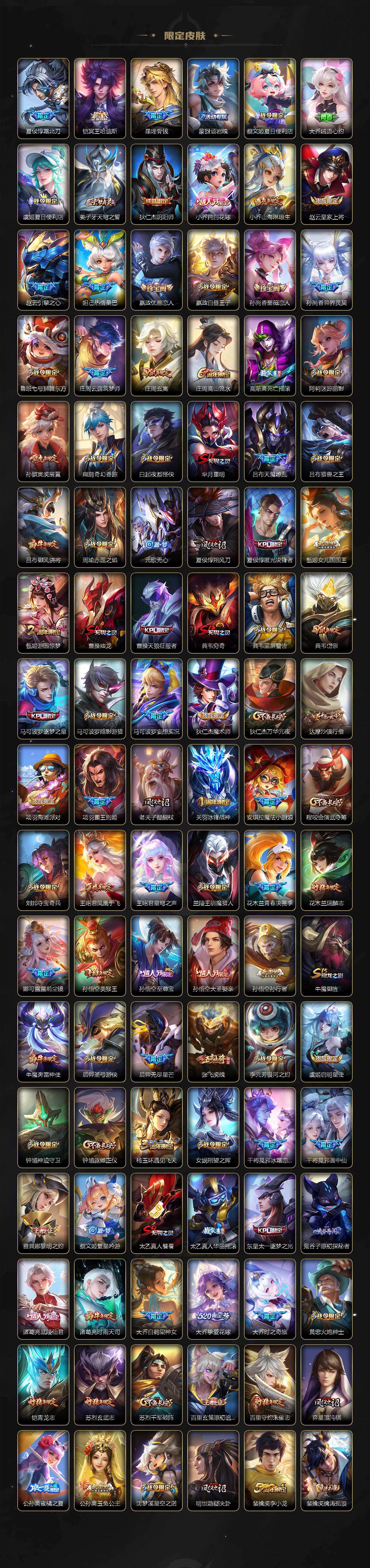 【限定皮肤】:夏侯惇霜北刀,铠冥王哈迪斯,暃埋骨钱,蒙犽顽岩魄,蔡文姬夏日便利店,大乔绒语心约,虞姬夏日便利店,姜子牙天穹之誓,狄仁杰阴阳师,小乔纯白花嫁,小乔山海琳琅生,赵云皇家上将,赵云引擎之心,妲己热情桑巴,嬴政优雅恋人,嬴政白昼王子,孙尚香蔷薇恋人,孙尚香异界灵契,鲁班七号狮舞东方,庄周云端筑梦师,庄周玄嵩,庄周高山流水,高渐离死亡摇滚,阿轲迷踪丽影,