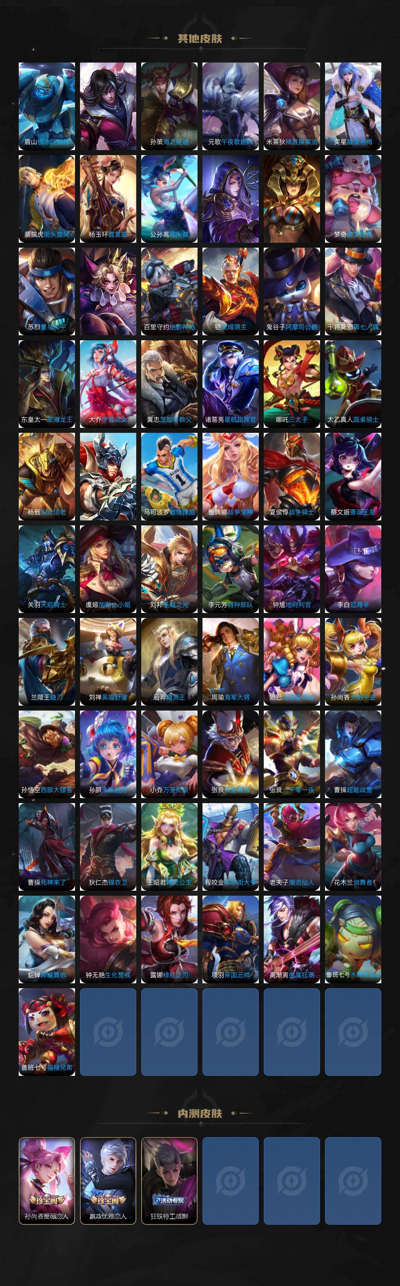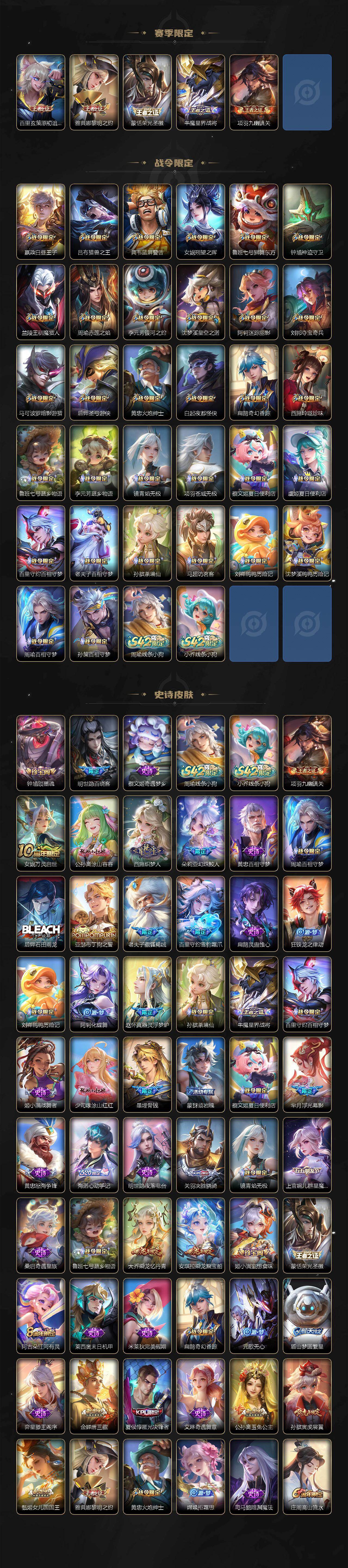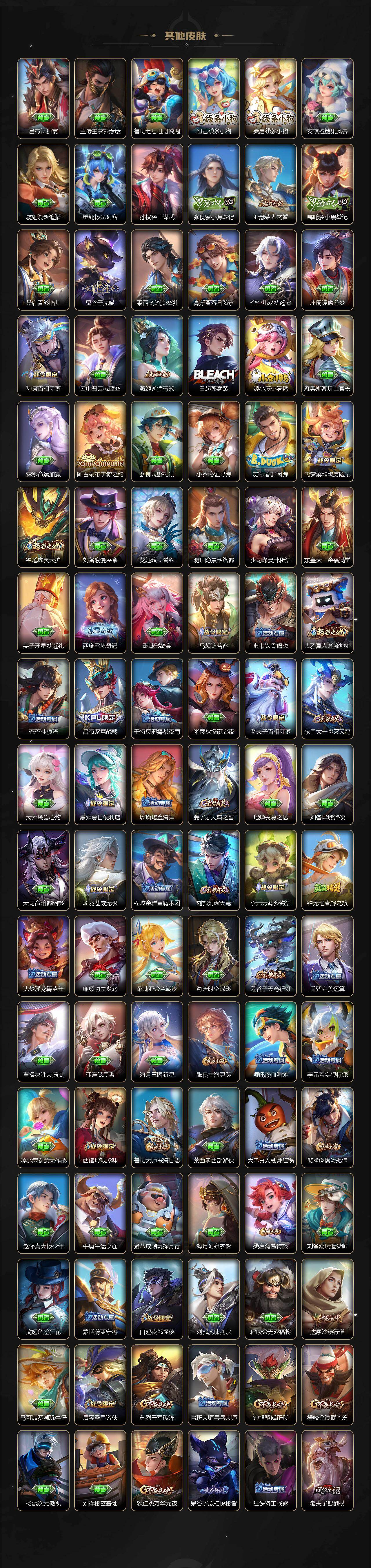 关羽冰锋战神,裴擒虎李小龙,上官婉儿梁祝,牛魔奔雷神使,吕布御风骁将,诸葛亮时雨天司,张飞虎魄,马超神威,庄周玄嵩,典韦岱宗,曹操天狼征服者,伽罗天狼溯光者,马可波罗逐梦之星,东皇太一逐梦之光,铠青龙志,花木兰瑞麟志,苏烈玄武志,百里守约朱雀志,王昭君凤凰于飞,项羽霸王别姬,小乔纯白花嫁,孙悟空大圣娶亲,孙悟空至尊宝,妲己热情桑巴,干将莫邪冰霜恋舞曲,花木兰青春决赛季,公孙离蜜橘之夏,安琪拉魔法小厨娘,赵云引擎之心,孙悟空美猴王,庄周云端筑梦师,大乔白鹤梁神女,猪八戒猪悟能,孙尚香异界灵契,孙悟空孙行者,甄姬女儿国国王,孙膑寅虎·展翼,公孙离玉兔公主,夏侯惇匿光决锋者,后羿无尽星芒,金蝉唐三藏,娜可露露前尘镜,王昭君星穹之声,盾山梦圆繁星,夏侯惇霜北刀,桑启鸣野蒿,王昭君映山客,澜愿照·九州拓,司空震愿照·山河定,妲己愿照·众生和,女娲愿照·千秋盛