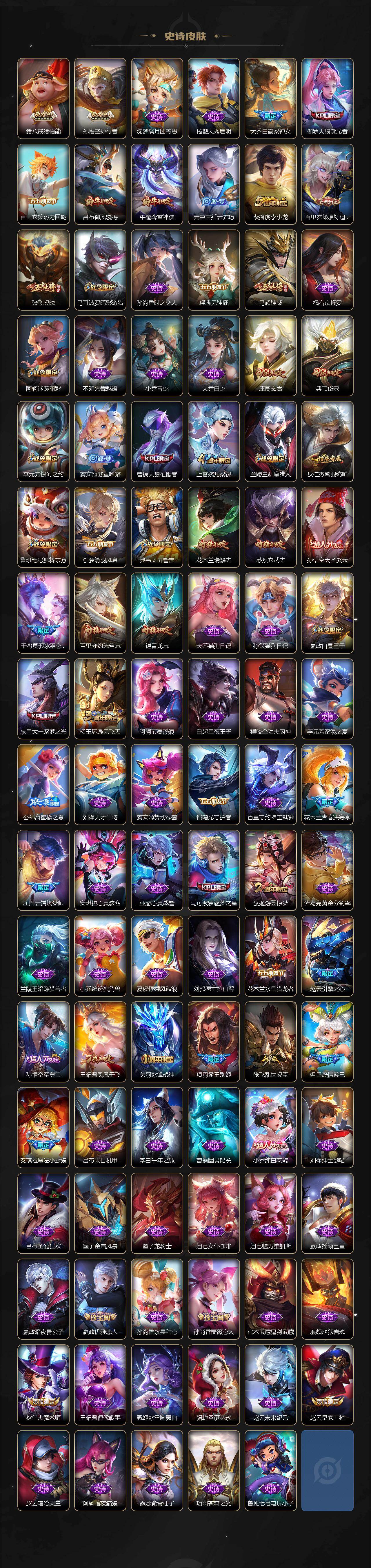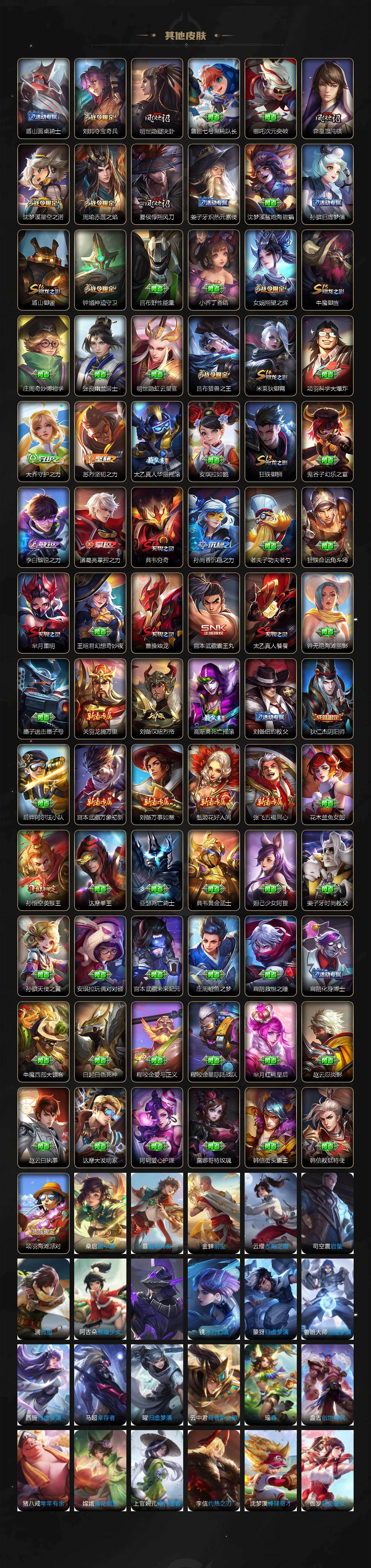 小乔青蛇,大乔白蛇,瑶遇见神鹿,伽罗箭羽风息,李元芳逐浪之夏,不知火舞魅语,大乔猫狗日记,孙策猫狗日记,阿轲节奏热浪,露娜紫霞仙子,诸葛亮黄金分割率,王昭君偶像歌手,项羽苍穹之光,孙尚香时之恋人,阿轲暗夜猫娘,吕布末日机甲,鲁班七号电玩小子,橘右京修罗,墨子龙骑士,嬴政摇滚巨星,刘禅绅士熊喵,刘禅天才门将,白起星夜王子,安琪拉心灵骇客,程咬金功夫厨神,刘邦德古拉伯爵,兰陵王暗隐猎兽者,曹操幽灵船长,宫本武藏鬼剑武藏,司马懿暗渊魔法,亚瑟心灵战警,杨戬天秀·启明,蔡文姬舞动绿茵,廉颇地狱岩魂,小乔缤纷独角兽,夏侯惇乘风破浪,花木兰水晶猎龙者,铠曙光守护者,百里玄策热力回旋,墨子金属风暴,百里玄策原初追逐者,吕布圣诞狂欢,貂蝉圣诞恋歌,百里守约特工魅影,嬴政暗夜贵公子,嫦娥拒霜思,雅典娜黎明之约,李白千年之狐,艾琳奇遇舞章,弈星滕王阁序,莱西奥末日机甲,大乔乘龙·忆丹青,安琪拉乘龙·聚宝船,桑启奇遇星旅,上官婉儿群星魔术团,关羽决胜骁骑,明世隐夜落电台,海诺心动手记,赵怀真器灵·浮梦炉
