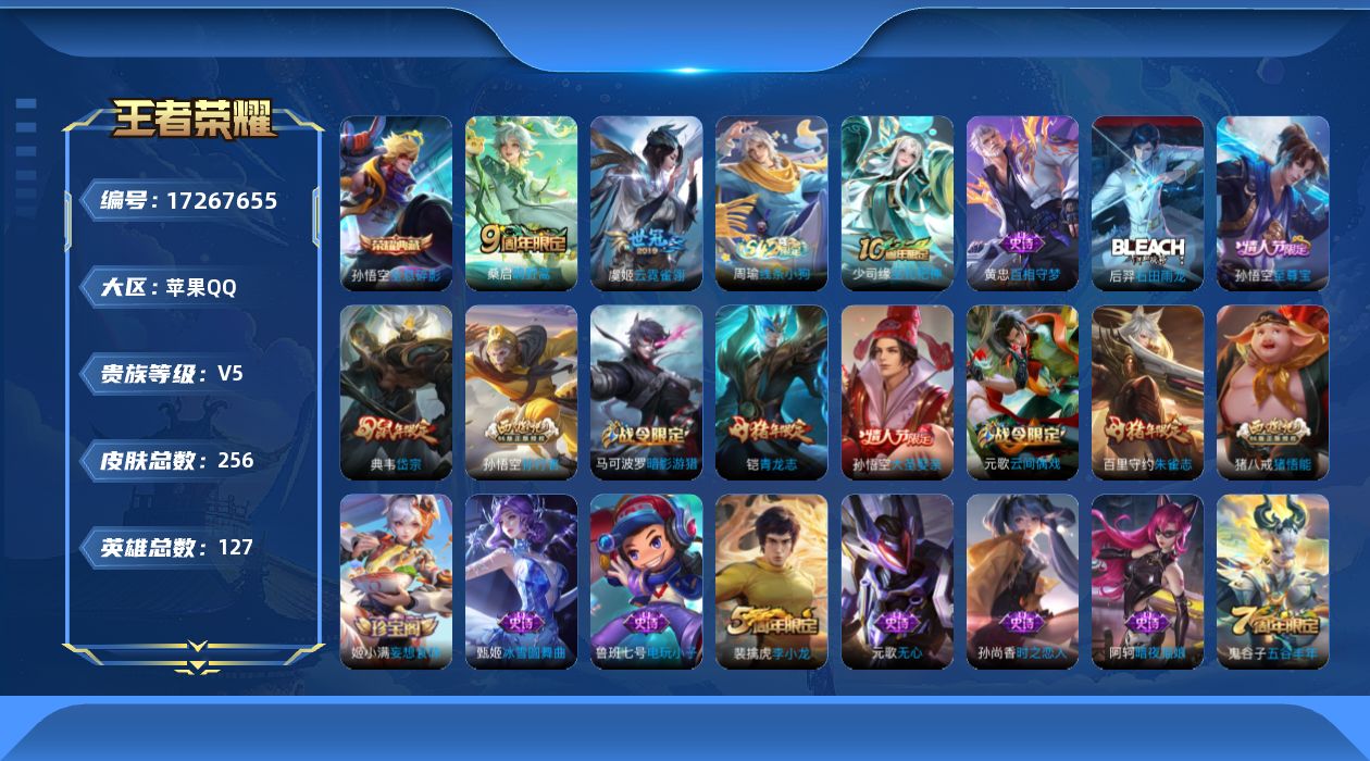 [17267655]苹果Q-V5-至尊星耀IV段位-124英雄-254皮肤-1典藏皮肤-2传说-74史诗