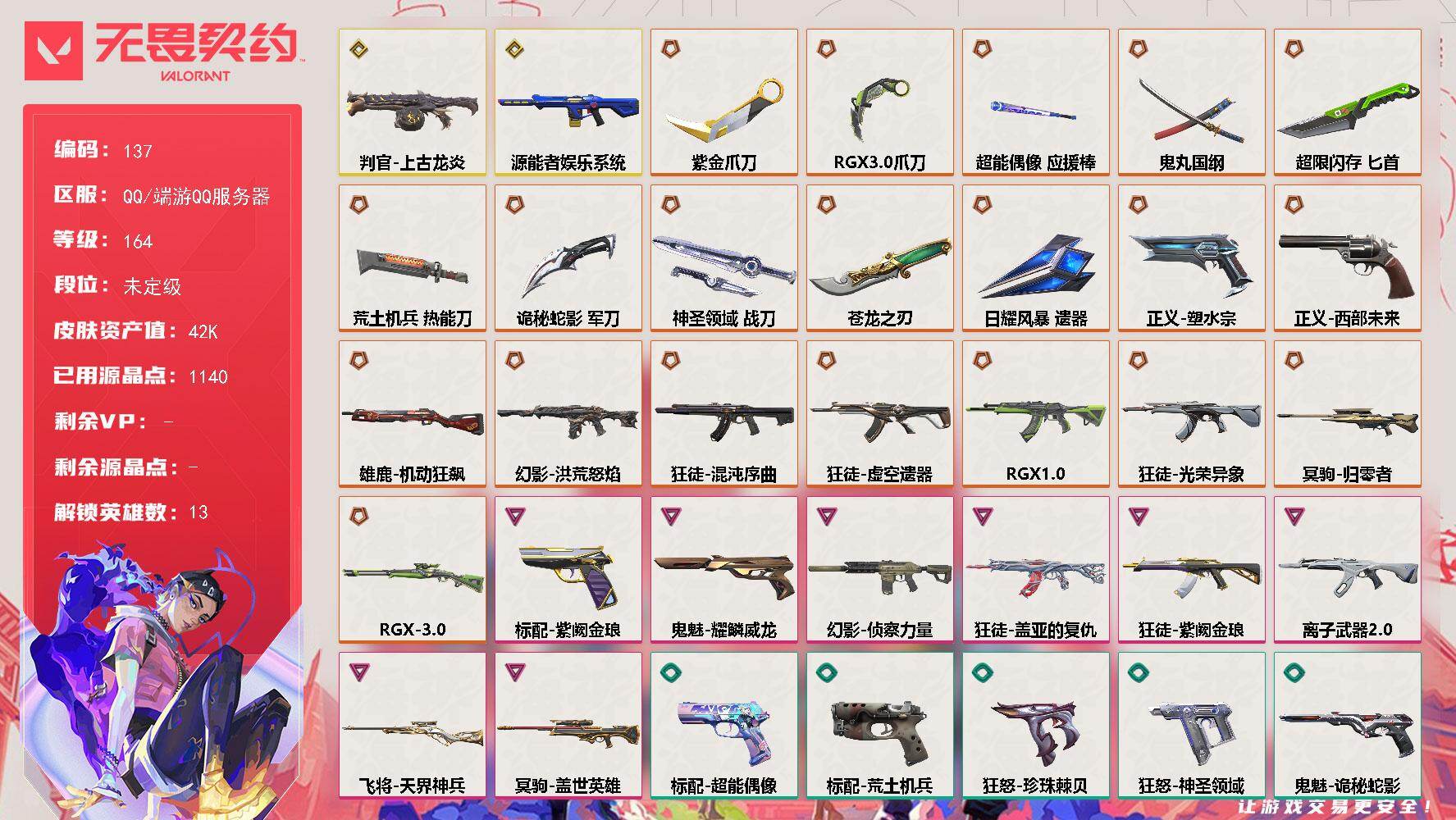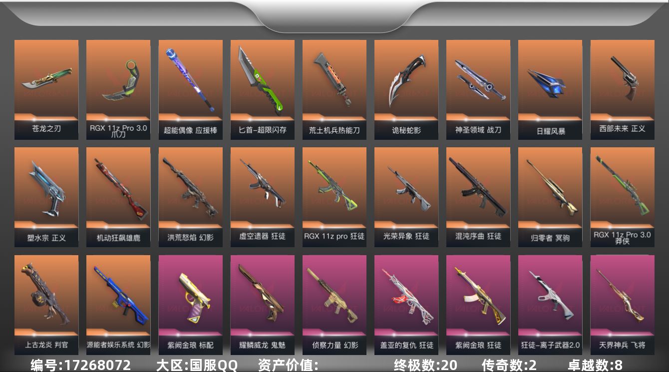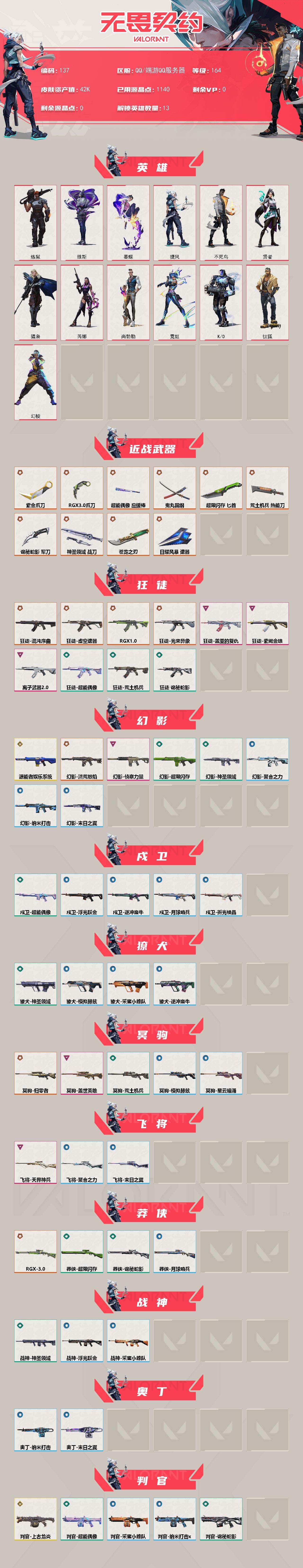 [17268072]【137】【英雄】:幻棱,炼狱,维斯,暮蝶,钛狐,捷风,不死鸟,贤者,猎枭,芮娜,尚勃勒,霓虹,K/O 【近战武器】:近战武器-5周年//公测重制版 苍龙之刃,近战武器-紫金爪刀,近战武器-RGX 11z Pro//3.0 爪刀,近战武器-鬼丸国纲,近战武器-超能偶像 应援棒,近战武器-超限闪存 匕首,近战武器-荒土机兵 热能刀,近战武器-诡秘蛇影 军刀,近战武器-神圣领域 战刀,近战武器-日耀风暴 遗器 【狂徒】:狂徒-混沌序曲,狂徒-虚空遗器,狂徒-RGX 11z Pro,狂徒-光荣异象,狂徒-盖亚的复仇,狂徒-紫阙金琅,狂徒-离子武器//2.0,狂徒-超能偶像,狂徒-荒土机兵,狂徒-诡秘蛇影 【幻影】:幻影-源能者娱乐系统,幻影-洪荒怒焰,幻影-侦察力量,幻影-超限闪存,幻影-神圣领域,幻影-聚合之力,幻影-纳米打击,幻影-末日之翼 【戍卫】:戍卫-超能偶像,戍卫-浮光跃金,戍卫-逆冲蛮牛,戍卫-月球哨兵,戍卫-折光棱晶 【獠犬】:獠犬-神圣领域,獠犬-采蜜小蜂队,獠犬-模拟赫兹,獠犬-逆冲蛮牛 【冥驹】:冥驹-归零者,冥驹-盖世英雄,冥驹-荒土机兵,冥驹-模拟赫兹,冥驹-星云暗涌 【飞将】:飞将-天界神兵,飞将-聚合之力,飞将-末日之翼 【莽侠】:莽侠-RGX 11z Pro//3.0,莽侠-超限闪存,莽侠-诡秘蛇影,莽侠-月球哨兵 【战神】:战神-神圣领域,战神-采蜜小蜂队,战神-浮光跃金 【奥丁】:奥丁-纳米打击,奥丁-末日之翼 【判官】:判官-上古龙炎,判官-超能偶像,判官-诡秘蛇影,判官-采蜜小蜂队,判官-纳米打击x 【雄鹿】:雄鹿-机动狂飙,雄鹿-复古浪潮,雄鹿-模拟赫兹,雄鹿-逆冲蛮牛,雄鹿-月球哨兵 【骇灵】:骇灵-荒土机兵,骇灵-浮光跃金,骇灵-星云暗涌 【蜂刺】:蜂刺-超限闪存,蜂刺-聚合之力,蜂刺-星云暗涌,蜂刺-折光棱晶 【标配】:标配-紫阙金琅,标配-超能偶像,标配-荒土机兵,标配-浮光跃金,标配-折光棱晶 【正义】:正义-塑水宗,正义-西部未来,正义-超限闪存,正义-纳米打击,正义-月球哨兵 【鬼魅】:鬼魅-耀鳞威龙,鬼魅-诡秘蛇影,鬼魅-采蜜小蜂队,鬼魅-模拟赫兹,鬼魅-星云暗涌 【狂怒】:狂怒-珍珠棘贝,狂怒-神圣领域,狂怒-聚合之力,狂怒-逆冲蛮牛 【短炮】:短炮-深海水族,短炮-末日之翼 【卡面】:终章:激斗汉堡 卡面,进