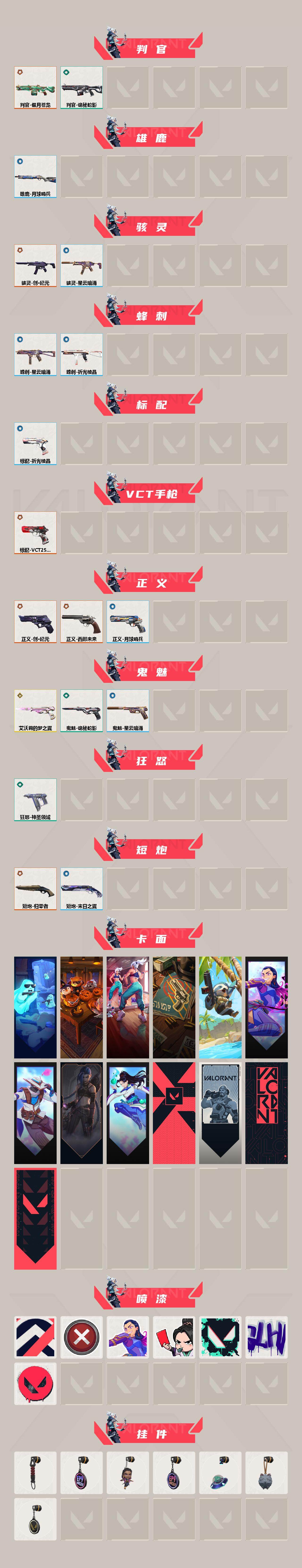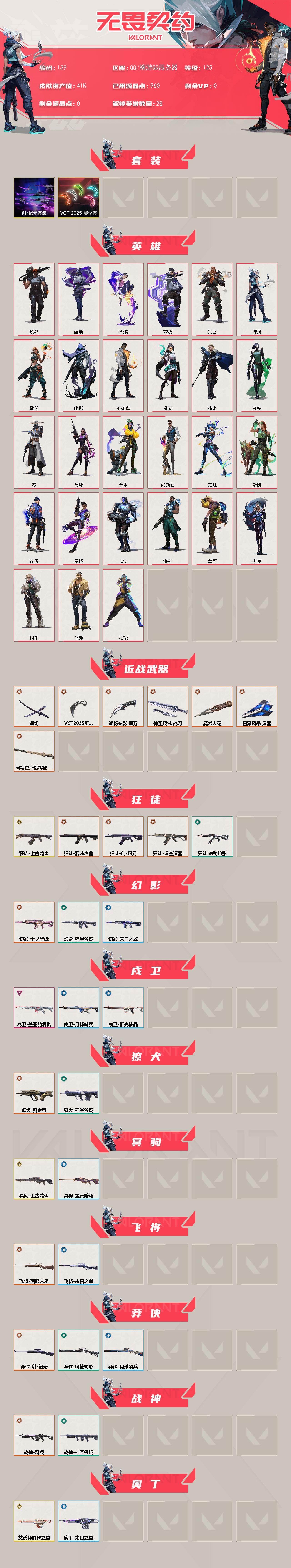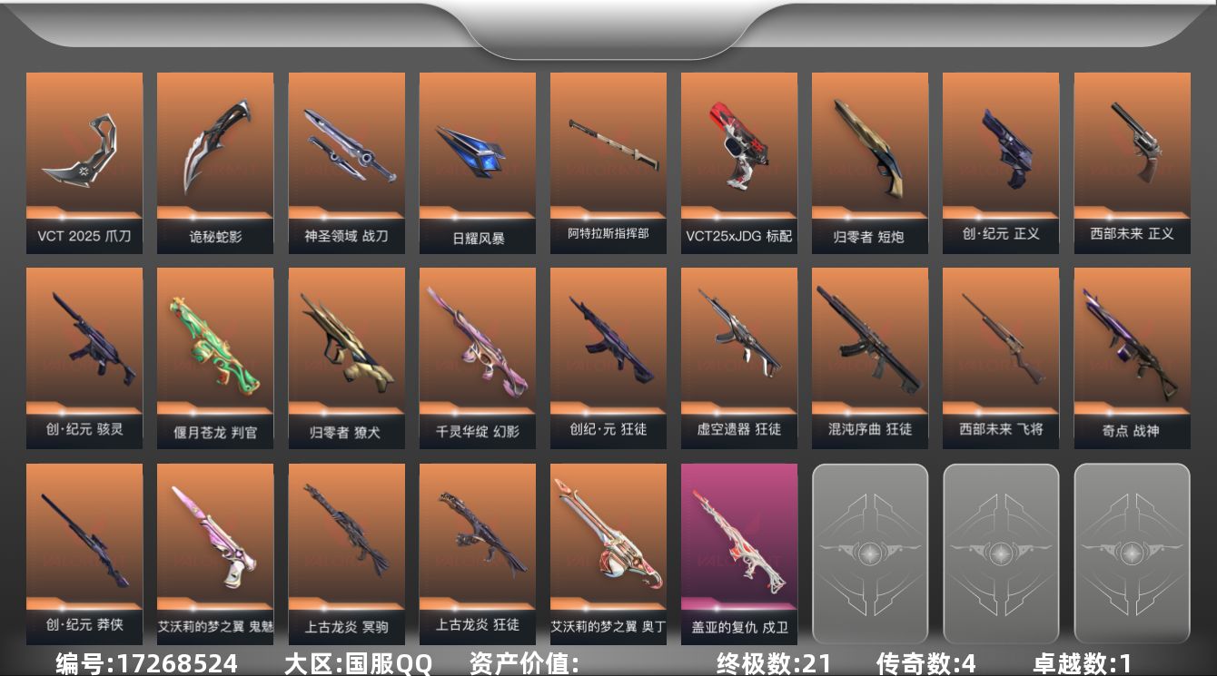 [17268524]【139】【套装】:VCT 2025 赛季套装,创·纪元套装 【英雄】:幻棱,炼狱,维斯,暮蝶,钛狐,壹决,铁臂,捷风,雷兹,幽影,不死鸟,贤者,猎枭,蝰蛇,零,芮娜,奇乐,尚勃勒,霓虹,斯凯,夜露,星礈,K/O,海神,盖可,黑梦,钢锁 【近战武器】:近战武器-魔术火花,近战武器-VCT 2025 爪刀,近战武器-镭切,近战武器-诡秘蛇影 军刀,近战武器-神圣领域 战刀,近战武器-日耀风暴 遗器,近战武器-阿特拉斯指挥部 甩棍,近战武器-魔术火花 【狂徒】:狂徒-上古龙炎,狂徒-混沌序曲,狂徒-创·纪元,狂徒-虚空遗器,狂徒-诡秘蛇影 【幻影】:幻影-千灵华绽,幻影-神圣领域,幻影-末日之翼 【戍卫】:戍卫-盖亚的复仇,戍卫-月球哨兵,戍卫-折光棱晶 【獠犬】:獠犬-归零者,獠犬-神圣领域 【冥驹】:冥驹-上古龙炎,冥驹-星云暗涌 【飞将】:飞将-西部未来,飞将-末日之翼 【莽侠】:莽侠-创·纪元,莽侠-诡秘蛇影,莽侠-月球哨兵 【战神】:战神-奇点,战神-神圣领域 【奥丁】:奥丁-艾沃莉的梦之翼,奥丁-末日之翼 【判官】:判官-偃月苍龙,判官-诡秘蛇影 【雄鹿】:雄鹿-月球哨兵 【骇灵】:骇灵-创·纪元,骇灵-星云暗涌 【蜂刺】:蜂刺-星云暗涌,蜂刺-折光棱晶 【标配】:标配-折光棱晶 【VCT手枪】:标配-VCT25 x JDG 【正义】:正义-创·纪元,正义-西部未来,正义-月球哨兵 【鬼魅】:鬼魅-艾沃莉的梦之翼,鬼魅-诡秘蛇影,鬼魅-星云暗涌 【狂怒】:狂怒-神圣领域 【短炮】:短炮-归零者,短炮-末日之翼 【卡面】:精灵大战 卡面,南瓜盛典 卡面,热舞环节 卡面,正义的化身 卡面,树懒大作战 卡面,无畏契约GO!第一卷:芮娜 卡面,无畏契约GO!第一卷:零 卡面,《双城之战》金克丝 卡面,无畏契约GO!第一卷:贤者 卡面,代号红色 卡面,新兵报到 卡面,V契约 卡面,无畏契约 卡面 【喷漆】:控场勿近 喷漆,买装还是存钱 喷漆,无畏契约GO!第一卷:芮娜 喷漆,红牌退场 喷漆,胜利属于无畏契约 喷漆,GLHF 喷漆,无畏契约 喷漆 【挂饰】:伞绳 挂饰,第九季//第三幕 纪念币 挂饰,无畏契约GO!第一卷 芮娜 挂饰,第九季//第二幕 纪念币 挂饰,天外飞客 挂饰,《双城之战》魄罗 挂饰,无畏契约 纪念币 挂饰
