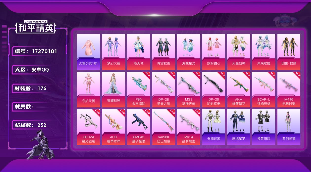 [17270181]安卓 手Q-11粉装-15特效枪-0载具-3粉色飞行器-81760热力值-15王牌印记-176套装-252枪皮
