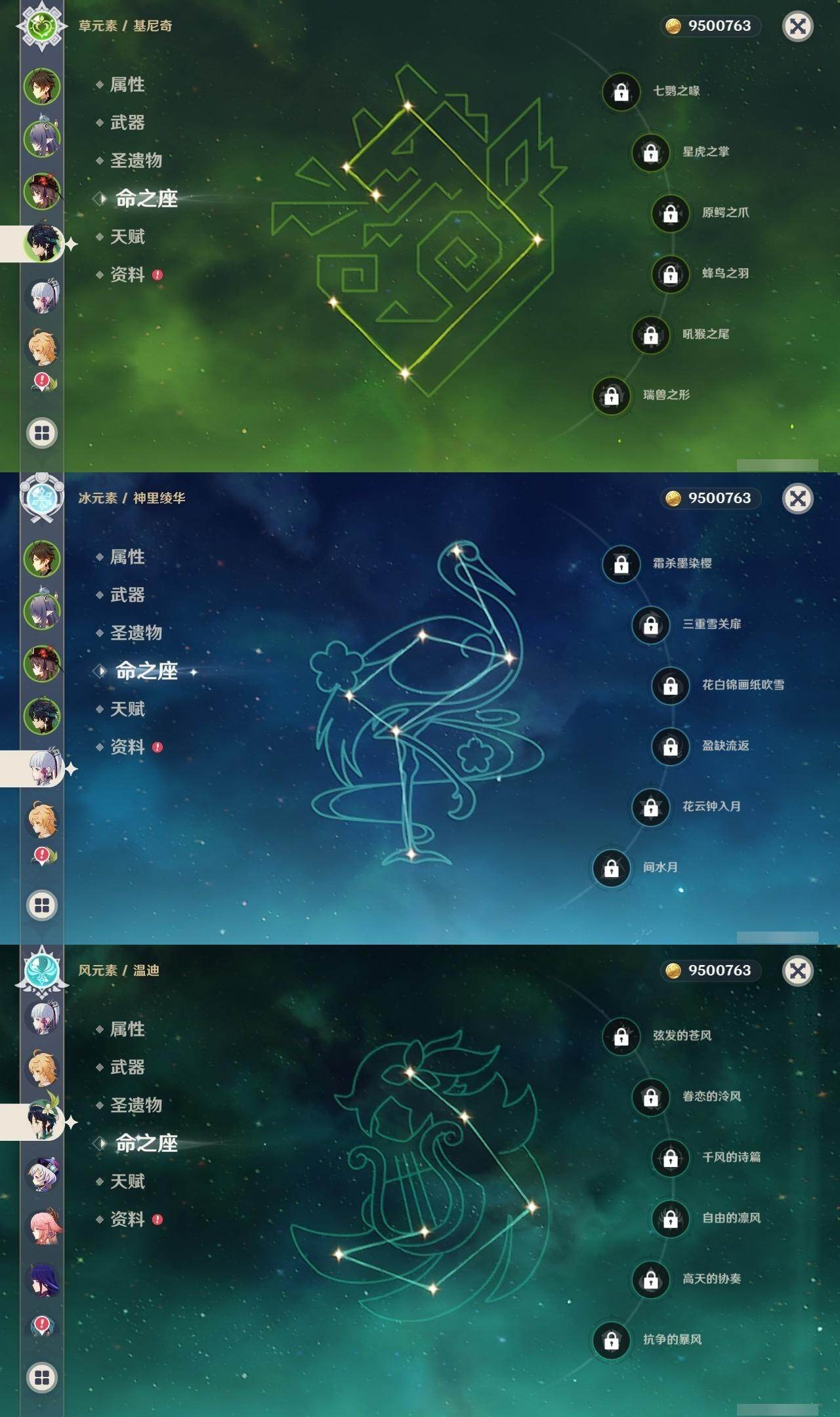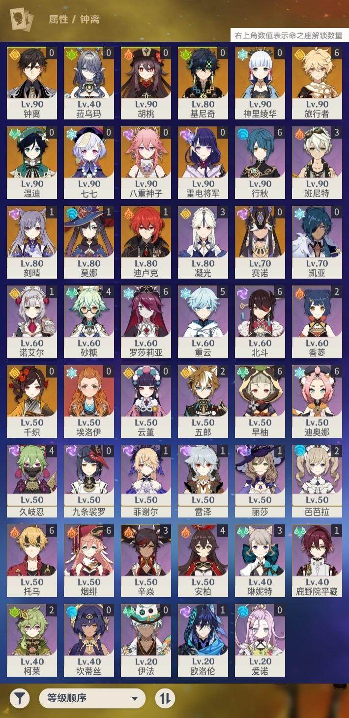 - [16420026]58级/30黄/女主/20个五星角色/6个五星武器 0命阿蕾奇诺,0命娜维娅,0命迪希雅,0命纳西妲,0命妮露,0命提纳里,0命神里绫人,0命荒泷一斗,0命枫原万叶,0命神里绫华,0命钟离,0命胡桃,0命魈,0命可莉,0命刻晴,0命七七,3命琴,0命莫娜,1命迪卢克,0命梦见月瑞希,精1飞雷之弦振,精1雾切之回光,精1和璞鸢,精1天空之脊,精1阿莫斯之弓,精1狼的末路