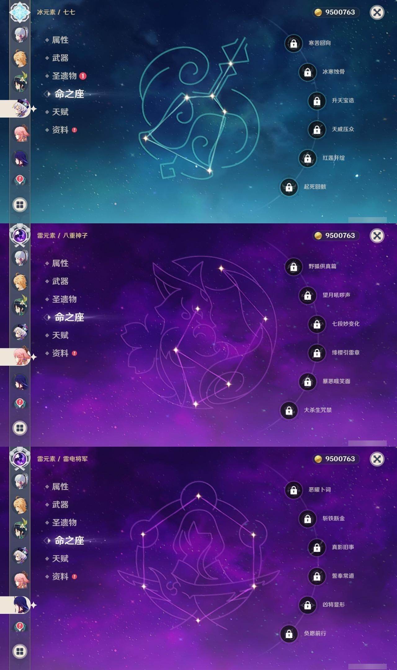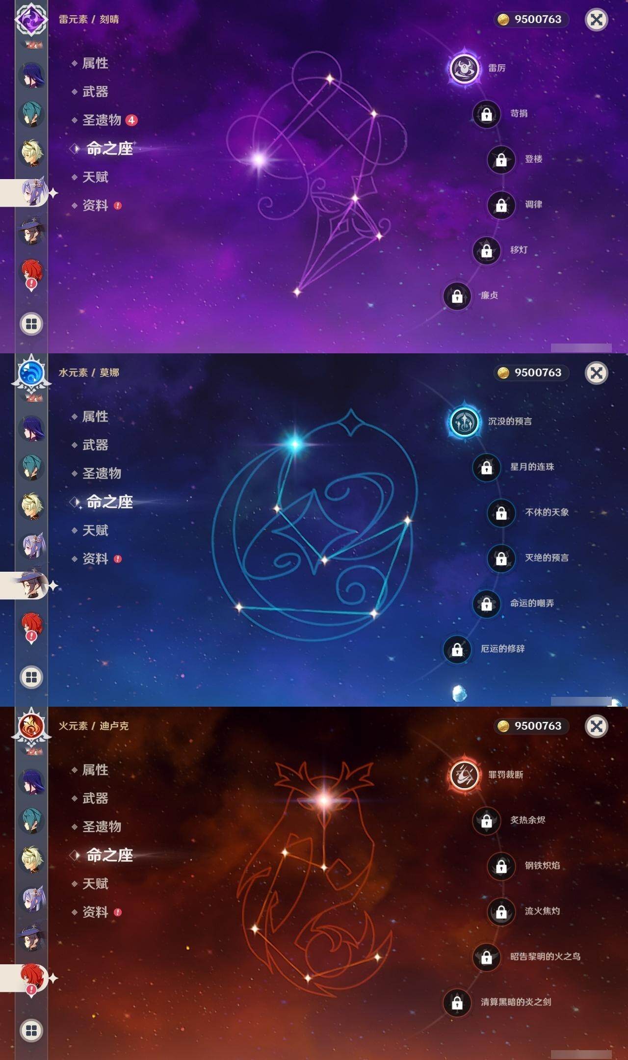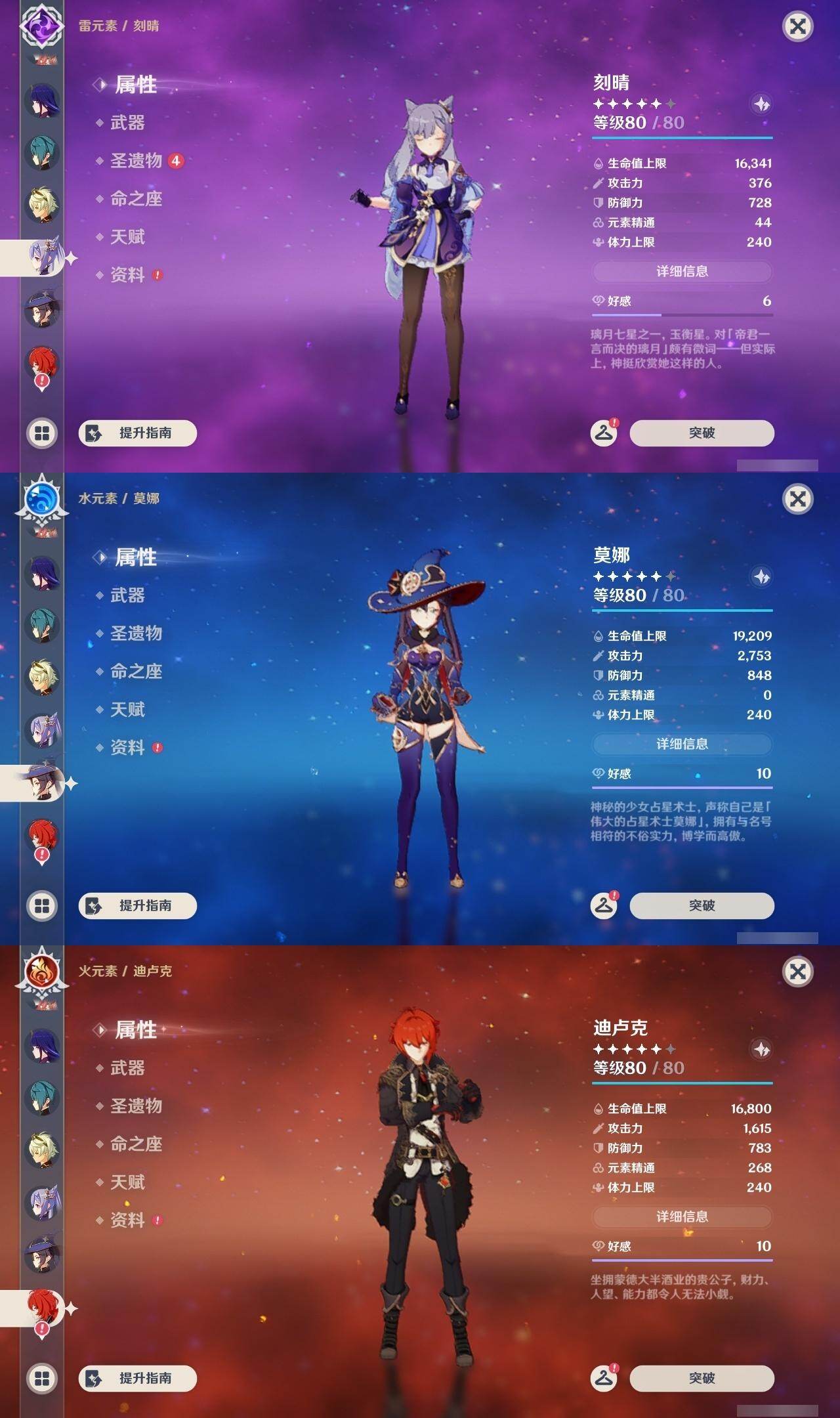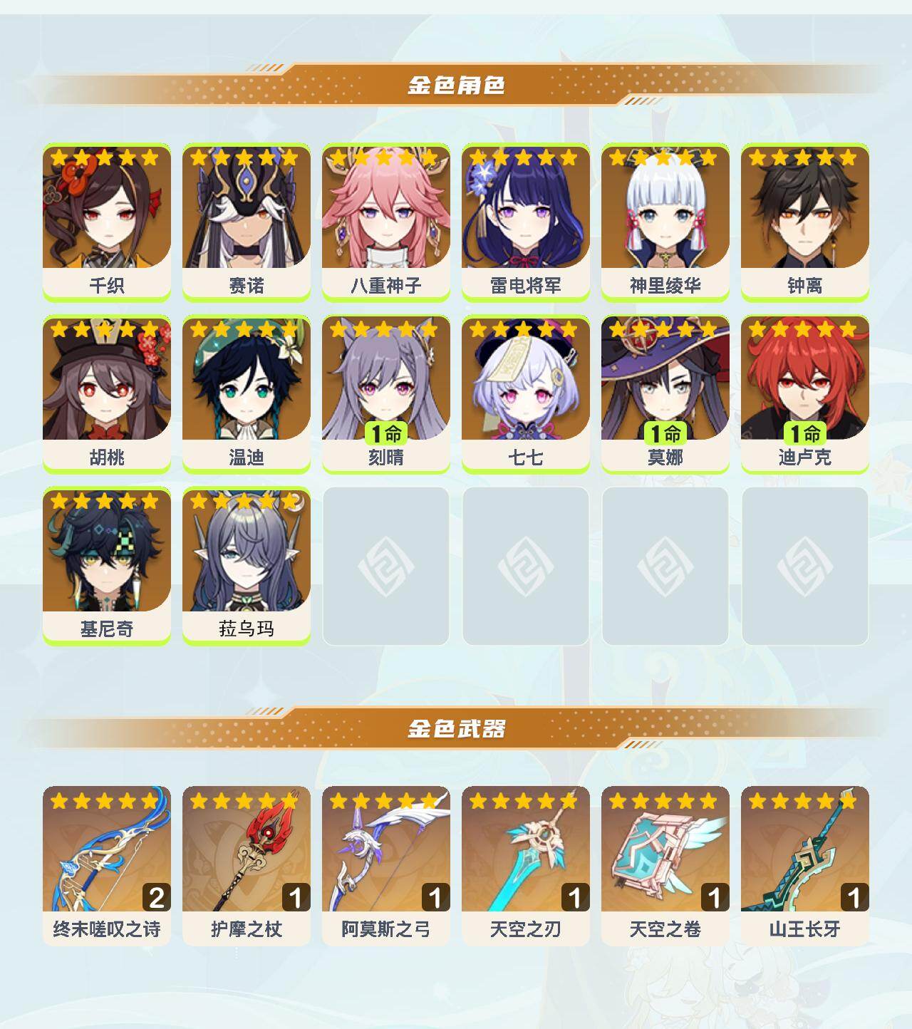 0命千织,0命赛诺,0命八重神子,0命雷电将军,0命神里绫华,0命钟离,0命胡桃,0命温迪,1命刻晴,0命七七,1命莫娜,1命迪卢克,0命基尼奇,0命菈乌玛,精2终末嗟叹之诗,精1护摩之杖,精1阿莫斯之弓,精1天空之刃,精1天空之卷,精1山王长牙