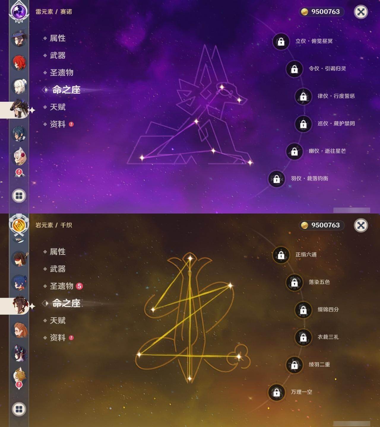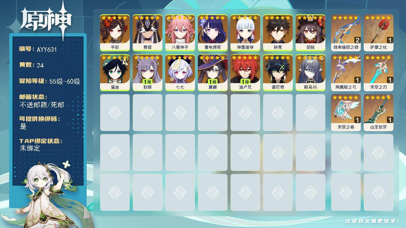 [17271422]58级/24黄/男主/14个五星角色/6个五星武器 0命千织,0命赛诺,0命八重神子,0命雷电将军,0命神里绫华,0命钟离,0命胡桃,0命温迪,1命刻晴,0命七七,1命莫娜,1命迪卢克,0命基尼奇,0命菈乌玛,精2终末嗟叹之诗,精1护摩之杖,精1阿莫斯之弓,精1天空之刃,精1天空之卷,精1山王长牙