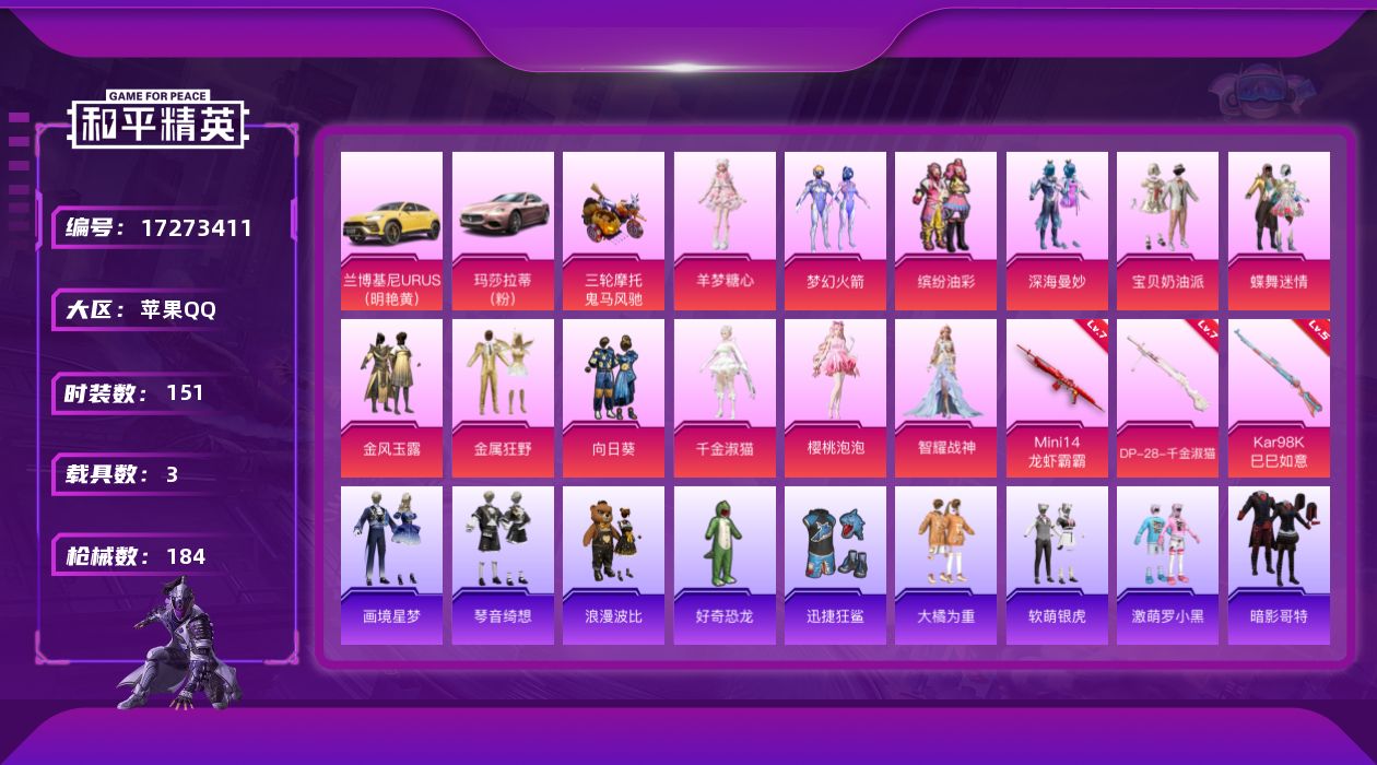 [17273411]苹果 手Q-12粉装-5特效枪-3载具-4粉色飞行器-70938热力值-4王牌印记-151套装-184枪皮