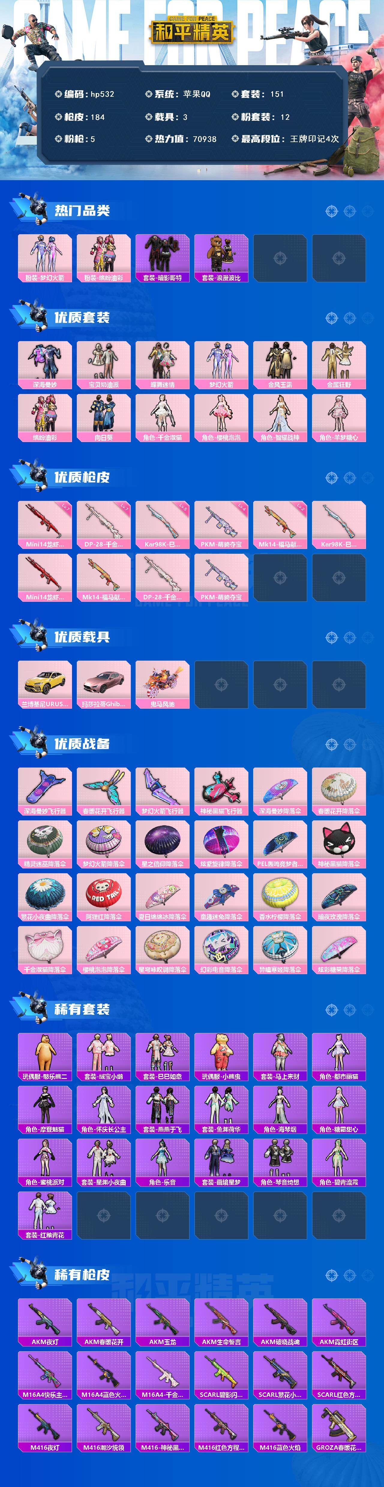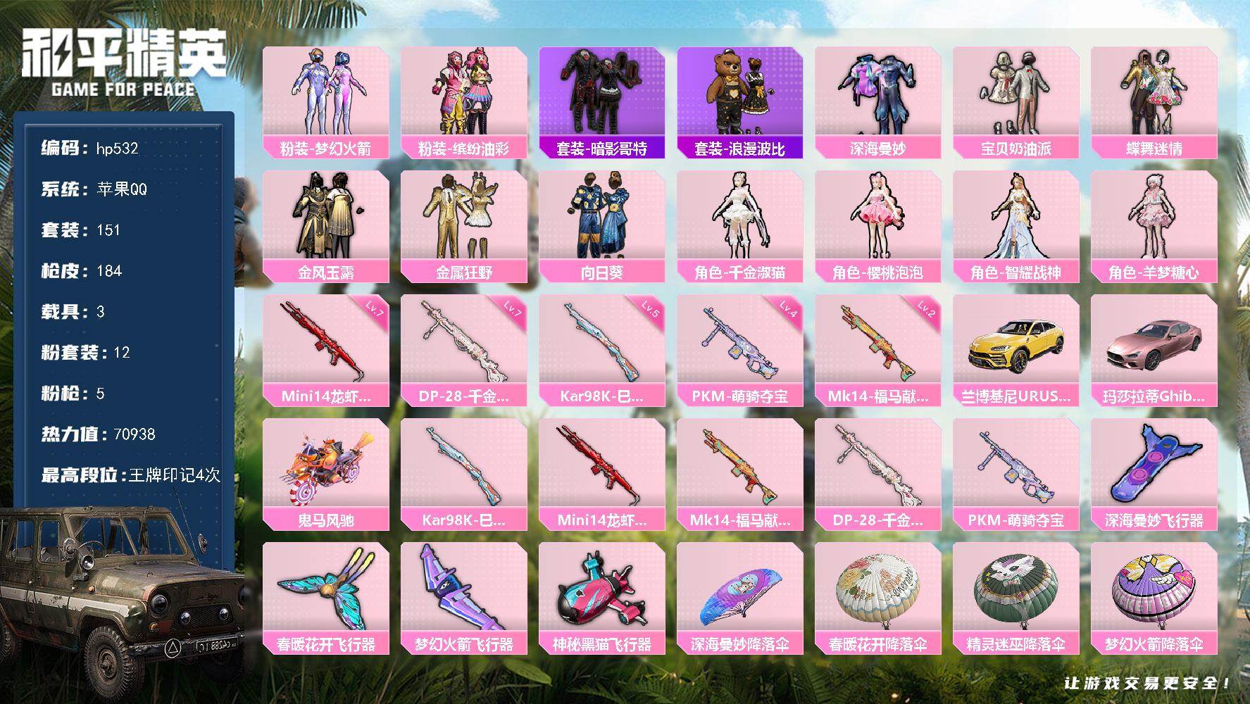 [17273411]苹果 手Q-12粉装-5特效枪-3载具-4粉色飞行器-70938热力值-4王牌印记-151套装-184枪皮 【热门品类】:粉装-梦幻火箭,粉装-缤纷油彩,套装-暗影哥特,套装-浪漫波比 【粉色套装】:粉装-深海曼妙,粉装-宝贝奶油派,粉装-蝶舞迷情,粉装-梦幻火箭,粉装-金风玉露,粉装-金属狂野,粉装-缤纷油彩,粉装-向日葵,角色-千金淑猫,角色-樱桃泡泡,角色-智耀战神,角色-羊梦糖心 【粉色枪皮等级】:Kar98K-巳巳如意(五级),Mini14-龙虾霸霸(七级),Mk14-福马献瑞(二级),DP-28-千金淑猫(七级),PKM-萌骑夺宝(四级) 【粉色载具】:兰博基尼URUS(明艳黄),玛莎拉蒂Ghibli(粉),鬼马风驰 【粉色枪皮】:Kar98K-巳巳如意,Mini14-龙虾霸霸,Mk14-福马献瑞,DP-28-千金淑猫,PKM-萌骑夺宝 【粉色飞行器】:深海曼妙飞行器,春暖花开飞行器,梦幻火箭飞行器,神秘黑猫飞行器 【粉色降落伞】:深海曼妙降落伞,春暖花开降落伞,精灵迷巫降落伞,梦幻火箭降落伞,星之信仰降落伞,炫紫旋律降落伞,PEL轰鸣竞梦者降落伞,神秘黑猫降落伞,繁花小夜曲降落伞,阿狸红降落伞,夏日绵绵冰降落伞,童趣迷兔降落伞,香水柠檬降落伞,暗夜玫瑰降落伞,千金淑猫降落伞,樱桃泡泡降落伞,星穹咏叹调降落伞,幻彩电音降落伞,异瞳寒姬降落伞,炫彩糖果降落伞 【稀有套装】:玩偶服-憨乐熊二,套装-绒宝小鹅,套装-巳巳如意,玩偶服-小熊虫,套装-马上来财,角色-都市丽猫,角色-摩登魅猫,角色-怀庆长公主,套装-燕燕于飞,套装-鱼渊荷华,角色-海琴烟,角色-糖霜甜心,角色-蜜桃派对,套装-星渊小夜曲,角色-乐音,套装-画境星梦,套装-琴音绮想,角色-碧青流霞,套装-红釉青花 【稀有枪皮】:AKM-夜灯,AKM-春暖花开,AKM-玉龙,AKM-生命誓言,AKM-破晓战魂,AKM-霓虹街区,M16A4-快乐主宰,M16A4-蓝色火焰,M16A4-千金淑猫,SCAR-L-碧影闪光,SCAR-L-繁花小夜曲,SCAR-L-红色方程式,M416-夜灯,M416-潮汐统领,M416-神秘黑猫,M416-红色方程式,M416-蓝色火焰,GROZA-春暖花开,GROZA-治愈之星,GROZA-黑色刀锋,AUG-冰川粉黛,AUG-耀粉歌者,QBZ-彩虹符号,QBZ-神秘黑猫,