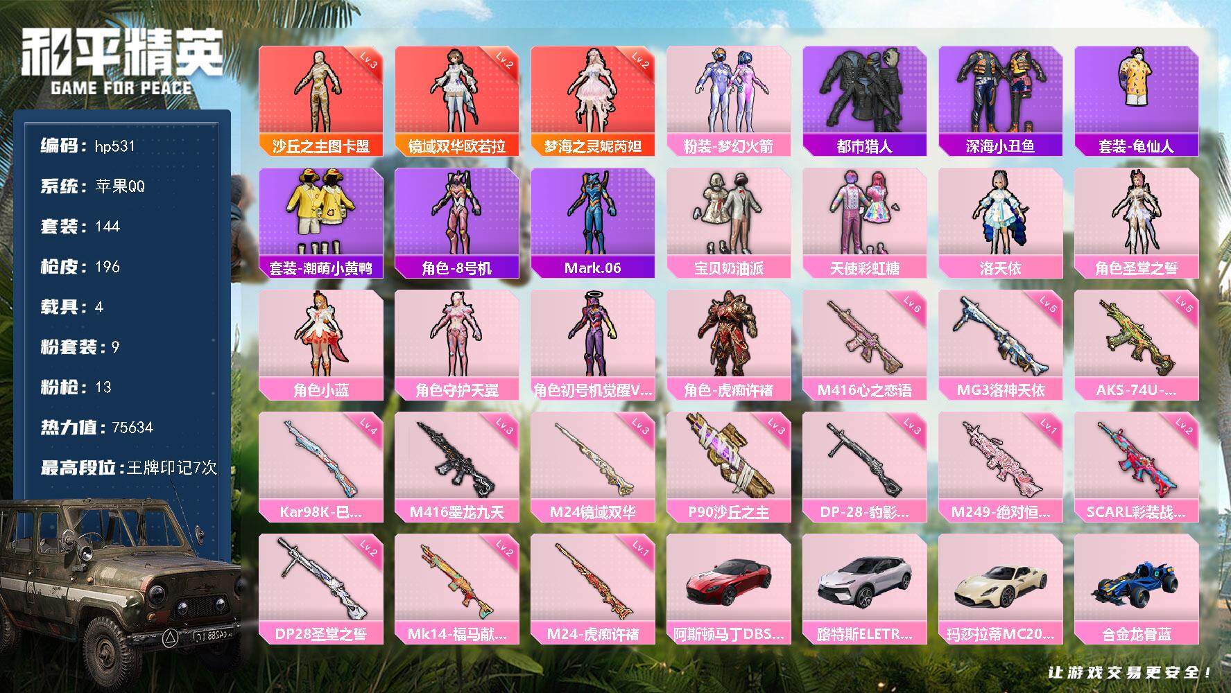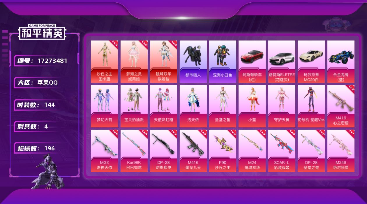 [17273481]苹果 手Q-3神装-9粉装-13特效枪-4载具-7粉色飞行器-75634热力值-7王牌印记-144套装-196枪皮