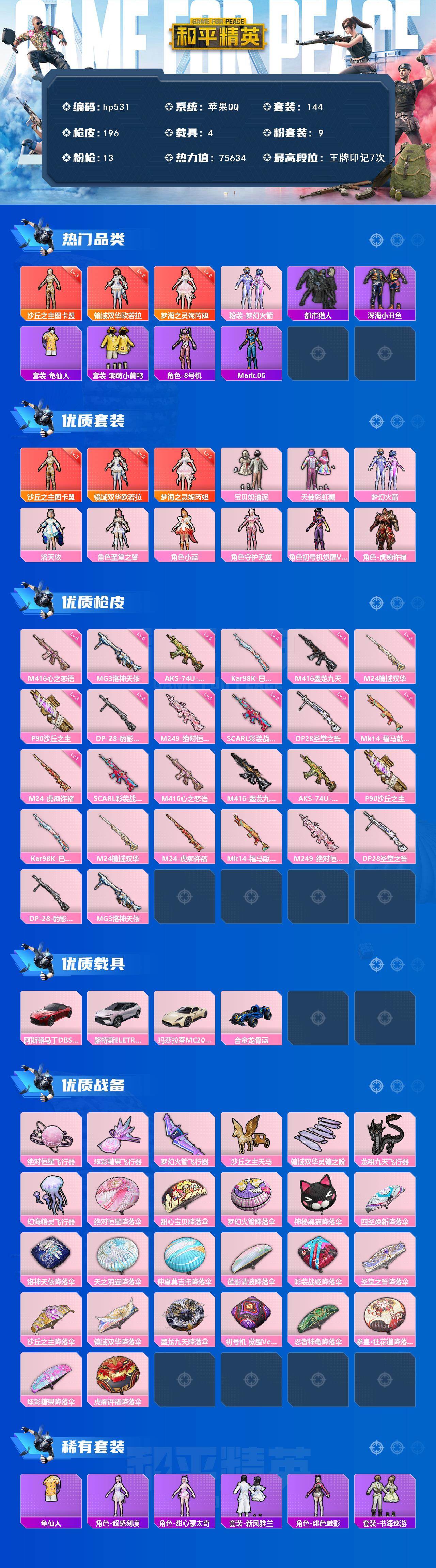 [17273481]苹果 手Q-3神装-9粉装-13特效枪-4载具-7粉色飞行器-75634热力值-7王牌印记-144套装-196枪皮 【红色神装等级】:梦海之灵-妮芮妲(二级),镜域双华-欧若拉(二级),沙丘之主-图卡盟(三级) 【红色角色神装】:梦海之灵-妮芮妲,镜域双华-欧若拉,沙丘之主-图卡盟 【热门品类】:粉装-梦幻火箭,套装-都市猎人,套装-深海小丑鱼,套装-龟仙人,套装-潮萌小黄鸭,角色-8号机,角色-Mark.06 【粉色套装】:粉装-宝贝奶油派,粉装-天使彩虹糖,粉装-梦幻火箭,角色-洛天依,角色-圣堂之誓,角色-小蓝,角色-守护天翼,角色-初号机 觉醒Ver.,角色-虎痴许褚 【粉色枪皮等级】:SCAR-L-彩装战姬(二级),M416-心之恋语(六级),M416-墨龙九天(三级),AKS-74U-森灵之息(五级),P90-沙丘之主(三级),Kar98K-巳巳如意(四级),M24-镜域双华(三级),M24-虎痴许褚(一级),Mk14-福马献瑞(二级),M249-绝对恒星(一级),DP-28-圣堂之誓(二级),DP-28-豹影疾电(三级),MG3-洛神天依(五级) 【粉色载具】:阿斯顿马丁DBS(红),路特斯ELETRE(花绽灰),玛莎拉蒂MC20(星石白),合金龙骨(蓝) 【粉色枪皮】:SCAR-L-彩装战姬,M416-心之恋语,M416-墨龙九天,AKS-74U-森灵之息,P90-沙丘之主,Kar98K-巳巳如意,M24-镜域双华,M24-虎痴许褚,Mk14-福马献瑞,M249-绝对恒星,DP-28-圣堂之誓,DP-28-豹影疾电,MG3-洛神天依 【粉色飞行器】:绝对恒星飞行器,炫彩糖果飞行器,梦幻火箭飞行器,沙丘之主天马,镜域双华-灵镜之阶,龙翔九天飞行器,幻海精灵飞行器 【粉色降落伞】:绝对恒星降落伞,甜心宝贝降落伞,梦幻火箭降落伞,神秘黑猫降落伞,四圣焕新降落伞,洛神天依降落伞,天之羽翼降落伞,仲夏莫吉托降落伞,莲影清波降落伞,彩装战姬降落伞,圣堂之誓降落伞,沙丘之主降落伞,镜域双华降落伞,墨龙九天降落伞,初号机 觉醒Ver.降落伞,忍者神龟降落伞,拳皇·狂花道降落伞,炫彩糖果降落伞,虎痴许褚降落伞 【稀有套装】:套装-龟仙人,角色-超感刻度,角色-甜心蒙太奇,套装-雪国风尚,套装-炫彩糖果,套装-新风雅兰,角色-绯色魅影,套装-书海巡游,套装-画境星梦,