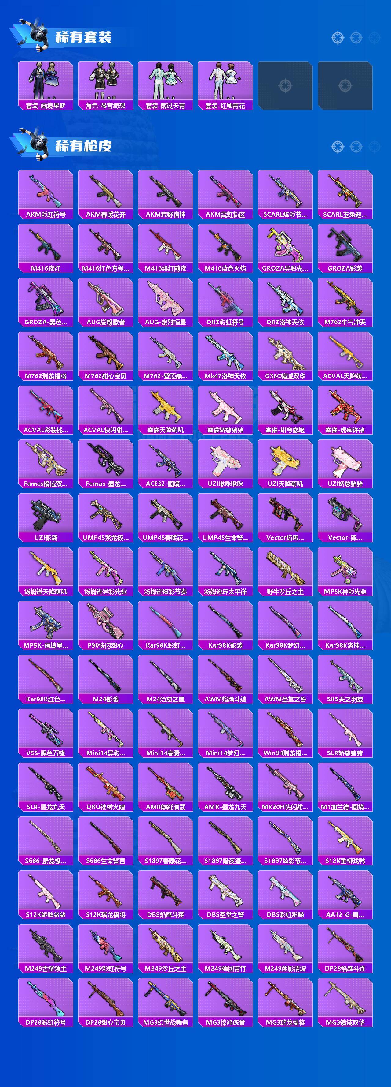 【粉色枪皮】:SCAR-L-彩装战姬,M416-心之恋语,M416-墨龙九天,AKS-74U-森灵之息,P90-沙丘之主,Kar98K-巳巳如意,M24-镜域双华,M24-虎痴许褚,Mk14-福马献瑞,M249-绝对恒星,DP-28-圣堂之誓,DP-28-豹影疾电,MG3-洛神天依