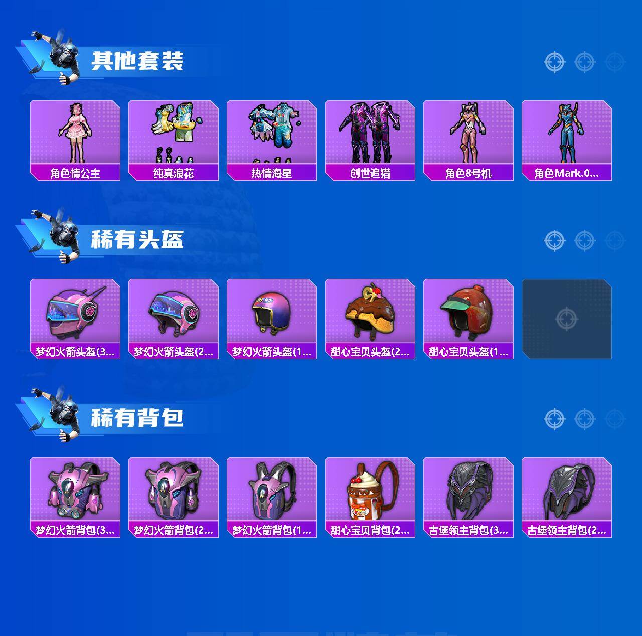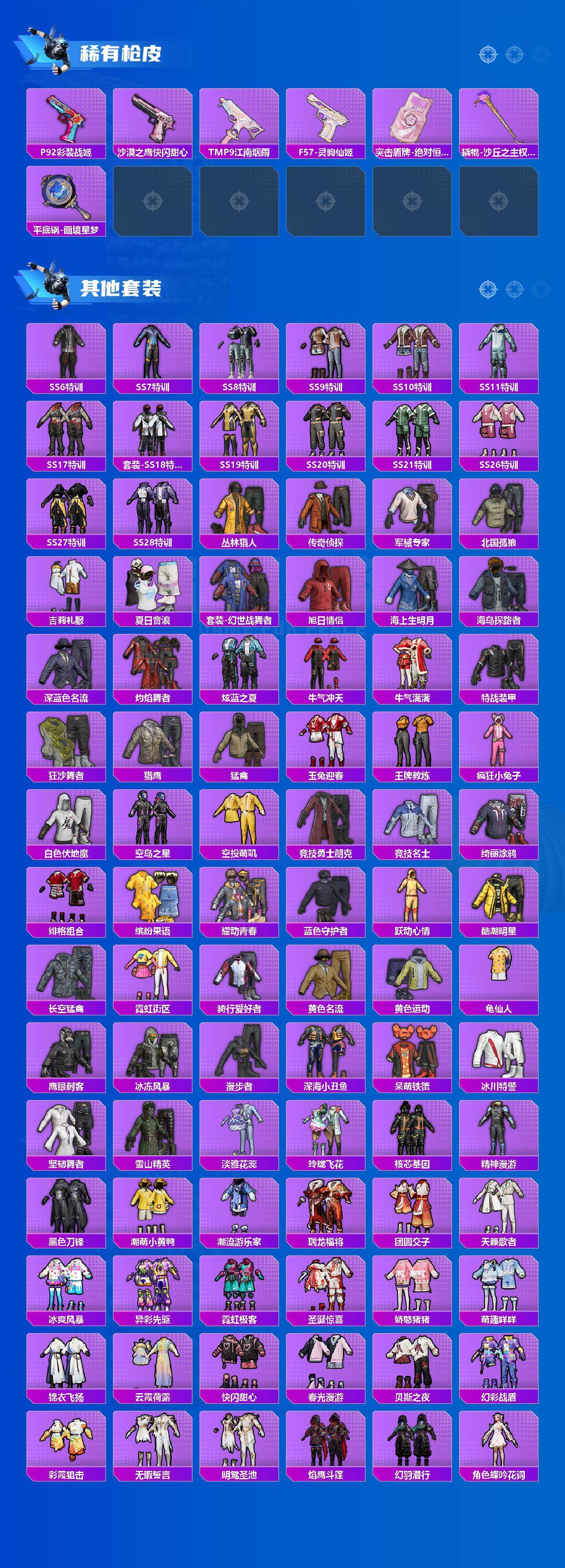 【稀有套装】:套装-龟仙人,角色-超感刻度,角色-甜心蒙太奇,套装-雪国风尚,套装-炫彩糖果,套装-新风雅兰,角色-绯色魅影,套装-书海巡游,套装-画境星梦,