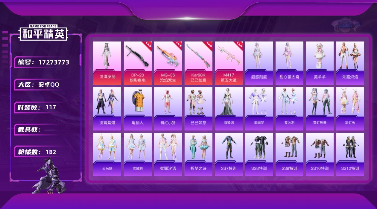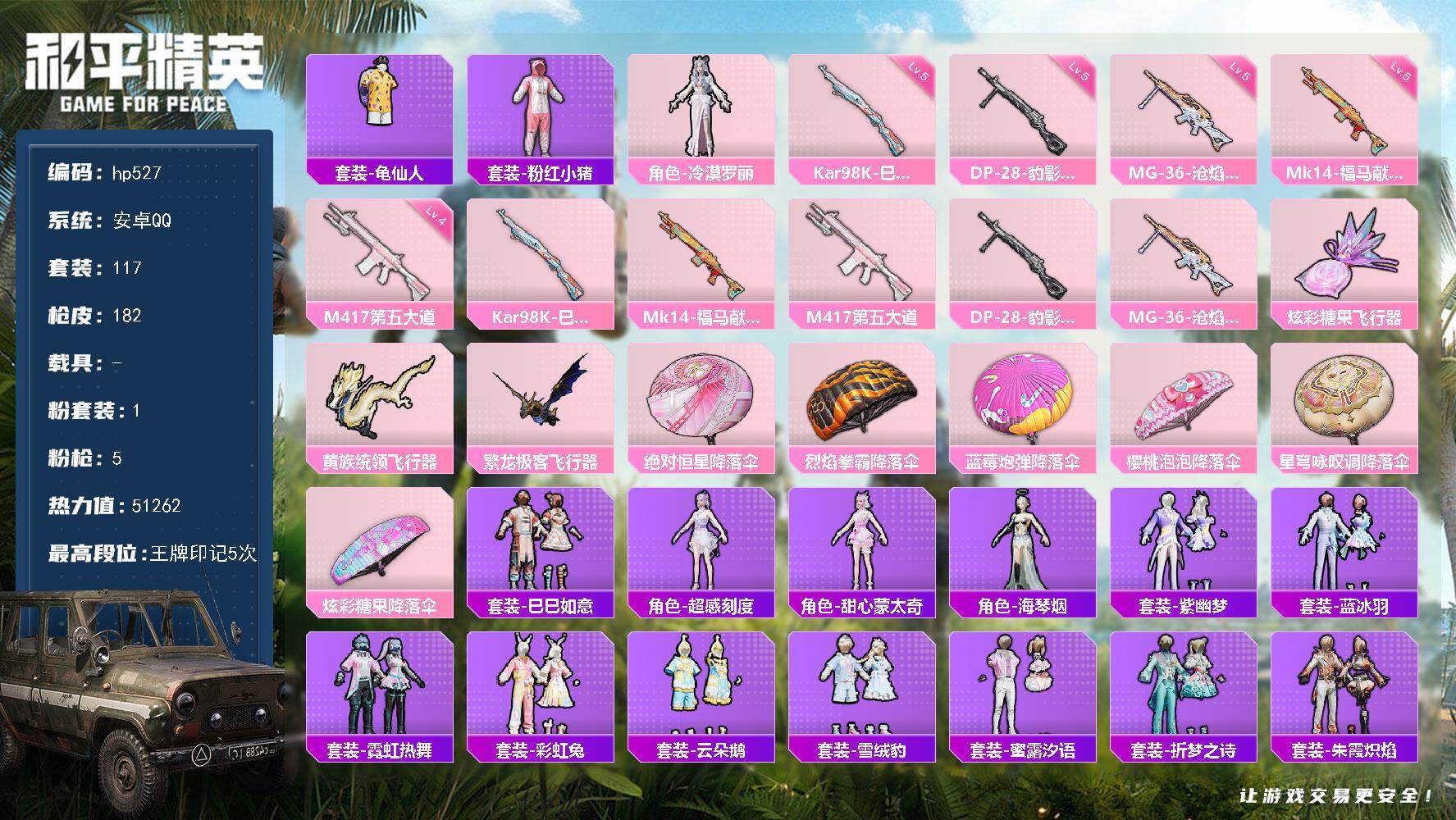 [17273773]安卓 手Q-1粉装-5特效枪-0载具-3粉色飞行器-51262热力值-5王牌印记-117套装-182枪皮