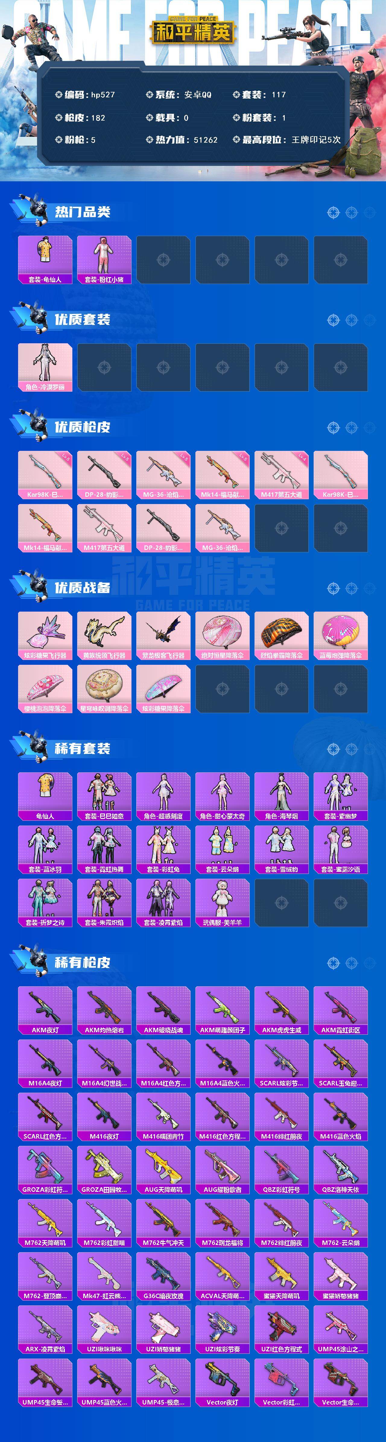 [17273773]安卓 手Q-1粉装-5特效枪-0载具-3粉色飞行器-51262热力值-5王牌印记-117套装-182枪皮 【热门品类】:套装-龟仙人,套装-粉红小猪 【粉色套装】:角色-冷漠罗丽 【粉色枪皮等级】:Kar98K-巳巳如意(五级),Mk14-福马献瑞(五级),M417-第五大道(四级),DP-28-豹影疾电(五级),MG-36-沧焰双生(五级) 【粉色枪皮】:Kar98K-巳巳如意,Mk14-福马献瑞,M417-第五大道,DP-28-豹影疾电,MG-36-沧焰双生 【粉色飞行器】:炫彩糖果飞行器,黄族统领飞行器,繁龙极客飞行器 【粉色降落伞】:绝对恒星降落伞,烈焰拳霸降落伞,蓝莓炮弹降落伞,樱桃泡泡降落伞,星穹咏叹调降落伞,炫彩糖果降落伞 【稀有套装】:套装-龟仙人,套装-巳巳如意,角色-超感刻度,角色-甜心蒙太奇,套装-雪国风尚,套装-炫彩糖果,角色-海琴烟,套装-紫幽梦,套装-蓝冰羽,套装-霓虹热舞,套装-彩虹兔,套装-云朵鹅,套装-雪绒豹,套装-蜜露汐语,套装-折梦之诗,套装-朱霞炽焰,套装-凌霄紫焰,玩偶服-美羊羊 【稀有枪皮】:AUG-冰晶雪宝,AKM-夜灯,AKM-灼热熔岩,AKM-破晓战魂,AKM-萌趣颜团子,AKM-虎虎生威,AKM-霓虹街区,M16A4-夜灯,M16A4-幻世战舞者,M16A4-红色方程式,M16A4-蓝色火焰,SCAR-L-炫彩节奏,SCAR-L-玉兔迎春,SCAR-L-红色方程式,M416-夜灯,M416-糯团青竹,M416-红色方程式,M416-绯红前夜,M416-蓝色火焰,GROZA-彩虹符号,GROZA-田园牧歌,AUG-天降萌叽,AUG-耀粉歌者,QBZ-彩虹符号,QBZ-洛神天依,M762-天降萌叽,M762-彩虹甜喵,M762-牛气冲天,M762-瑞龙福将,M762-绯红前夜,M762-云朵鹅,M762-登顶巅峰,Mk47-虹云熊熊,G36C-暗夜玫瑰,AC-VAL-天降萌叽,蜜獾-天降萌叽,蜜獾-娇憨猪猪,ARX-凌霄紫焰,UZI-啾咪啾咪,UZI-娇憨猪猪,UZI-炫彩节奏,UZI-红色方程式,UMP45-涂山之恋,UMP45-生命誓言,UMP45-蓝色火焰,UMP45-极意拳锋,Vector-夜灯,Vector-彩虹符号,Vector-生命誓言,Vector-田园牧歌,汤姆逊-耀粉歌者,汤姆逊-智耀战神,野牛-