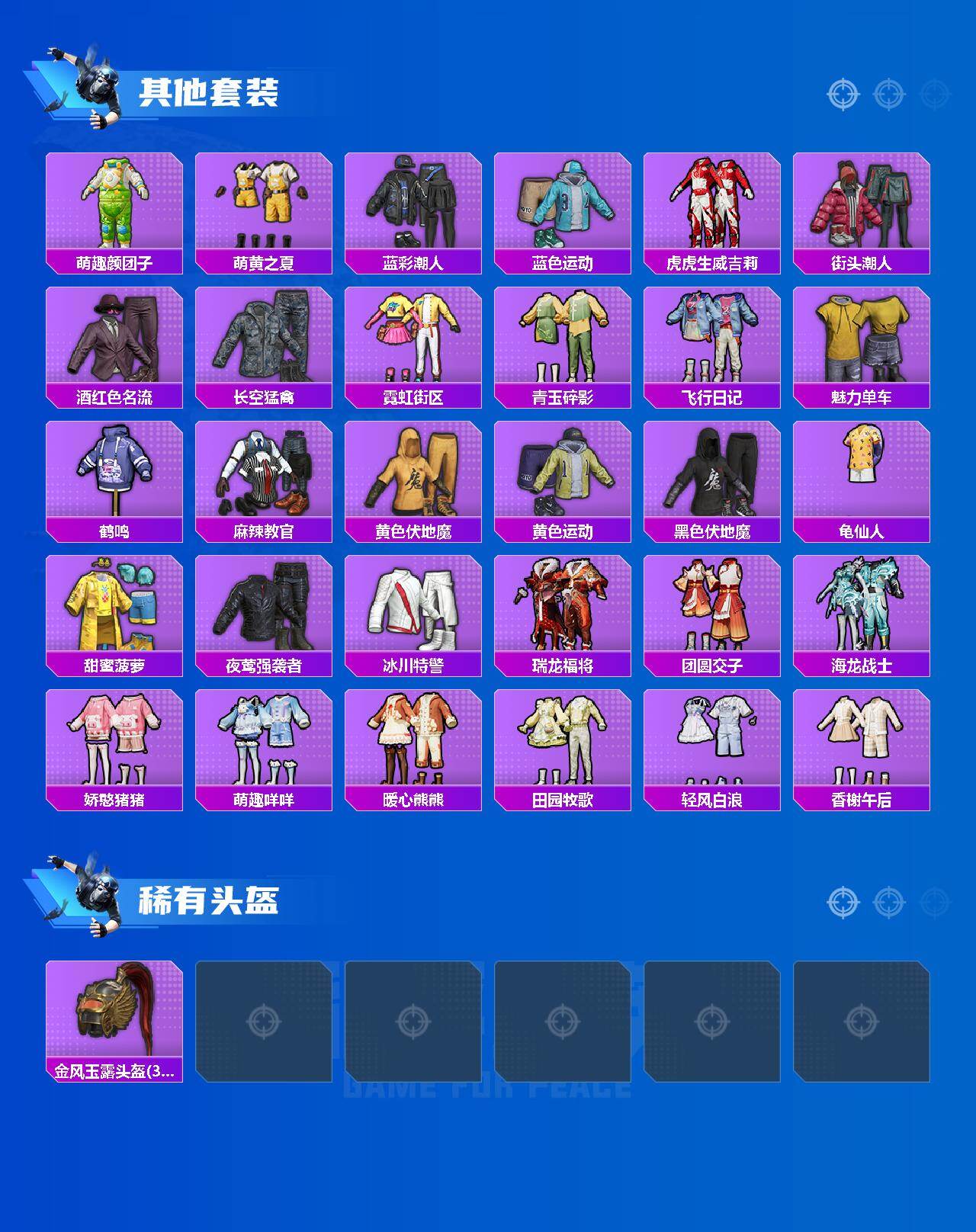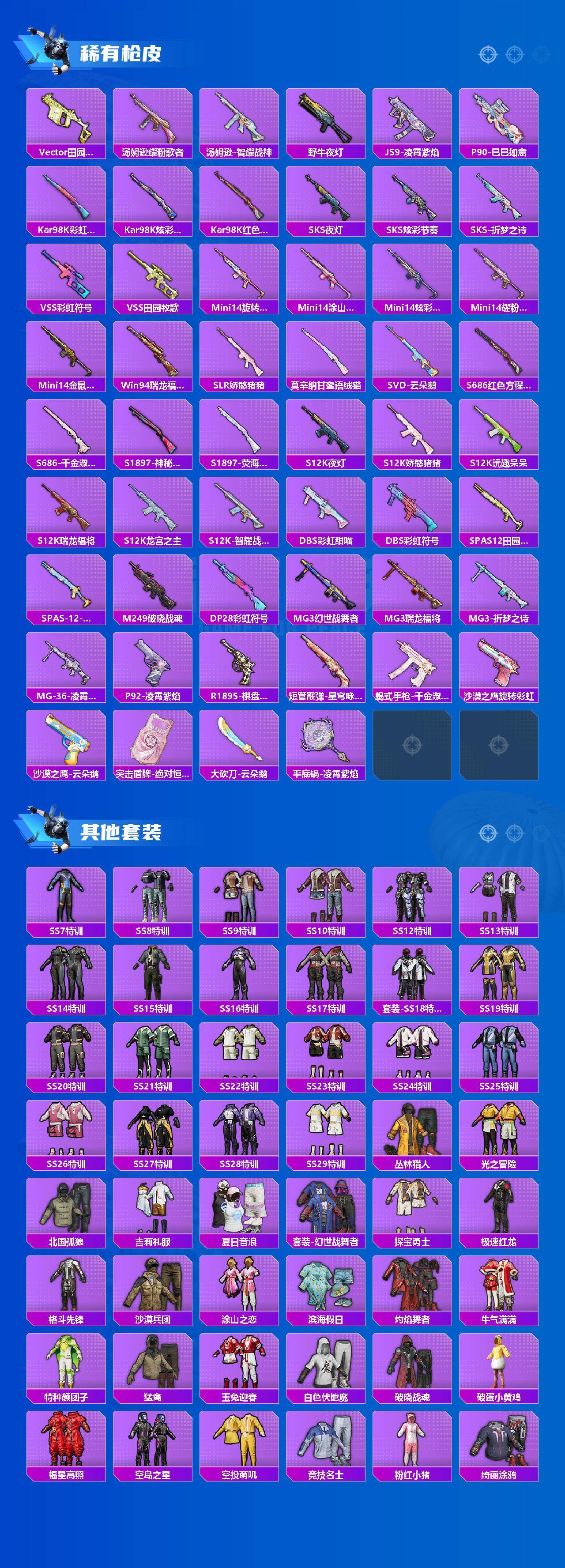 【稀有枪皮】:AUG-冰晶雪宝,AKM-夜灯,AKM-灼热熔岩,AKM-破晓战魂,AKM-萌趣颜团子,AKM-虎虎生威,AKM-霓虹街区,M16A4-夜灯,M16A4-幻世战舞者,M16A4-红色方程式,M16A4-蓝色火焰,SCAR-L-炫彩节奏,SCAR-L-玉兔迎春,SCAR-L-红色方程式,M416-夜灯,M416-糯团青竹,M416-红色方程式,M416-绯红前夜,M416-蓝色火焰,GROZA-彩虹符号,GROZA-田园牧歌,AUG-天降萌叽,AUG-耀粉歌者,QBZ-彩虹符号,QBZ-洛神天依,M762-天降萌叽,M762-彩虹甜喵,M762-牛气冲天,M762-瑞龙福将,M762-绯红前夜,M762-云朵鹅,M762-登顶巅峰,Mk47-虹云熊熊,G36C-暗夜玫瑰,AC-VAL-天降萌叽,蜜獾-天降萌叽,蜜獾-娇憨猪猪,ARX-凌霄紫焰,UZI-啾咪啾咪,UZI-娇憨猪猪,UZI-炫彩节奏,UZI-红色方程式,UMP45-涂山之恋,UMP45-生命誓言,UMP45-蓝色火焰,UMP45-极意拳锋,Vector-夜灯,Vector-彩虹符号,Vector-生命誓言,Vector-田园牧歌,汤姆逊-耀粉歌者,汤姆逊-智耀战神,野牛-