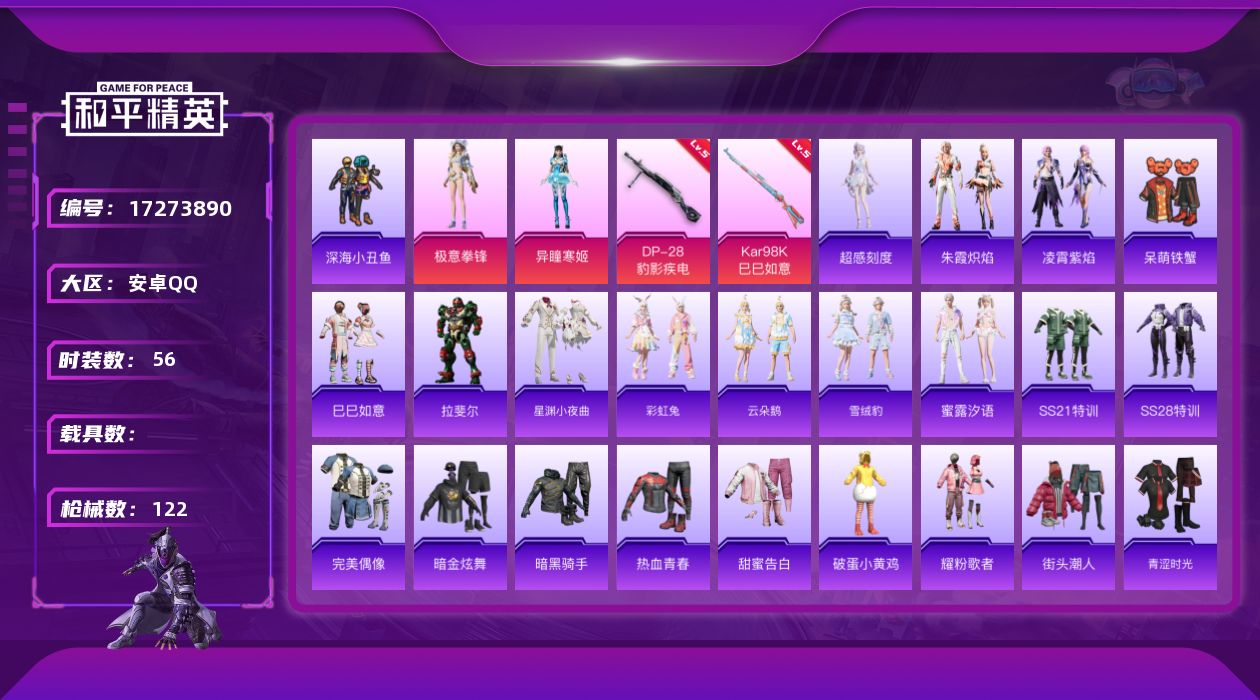 [17273890]安卓 手Q-2粉装-4特效枪-0载具-2粉色飞行器-28158热力值-2王牌印记-56套装-122枪皮