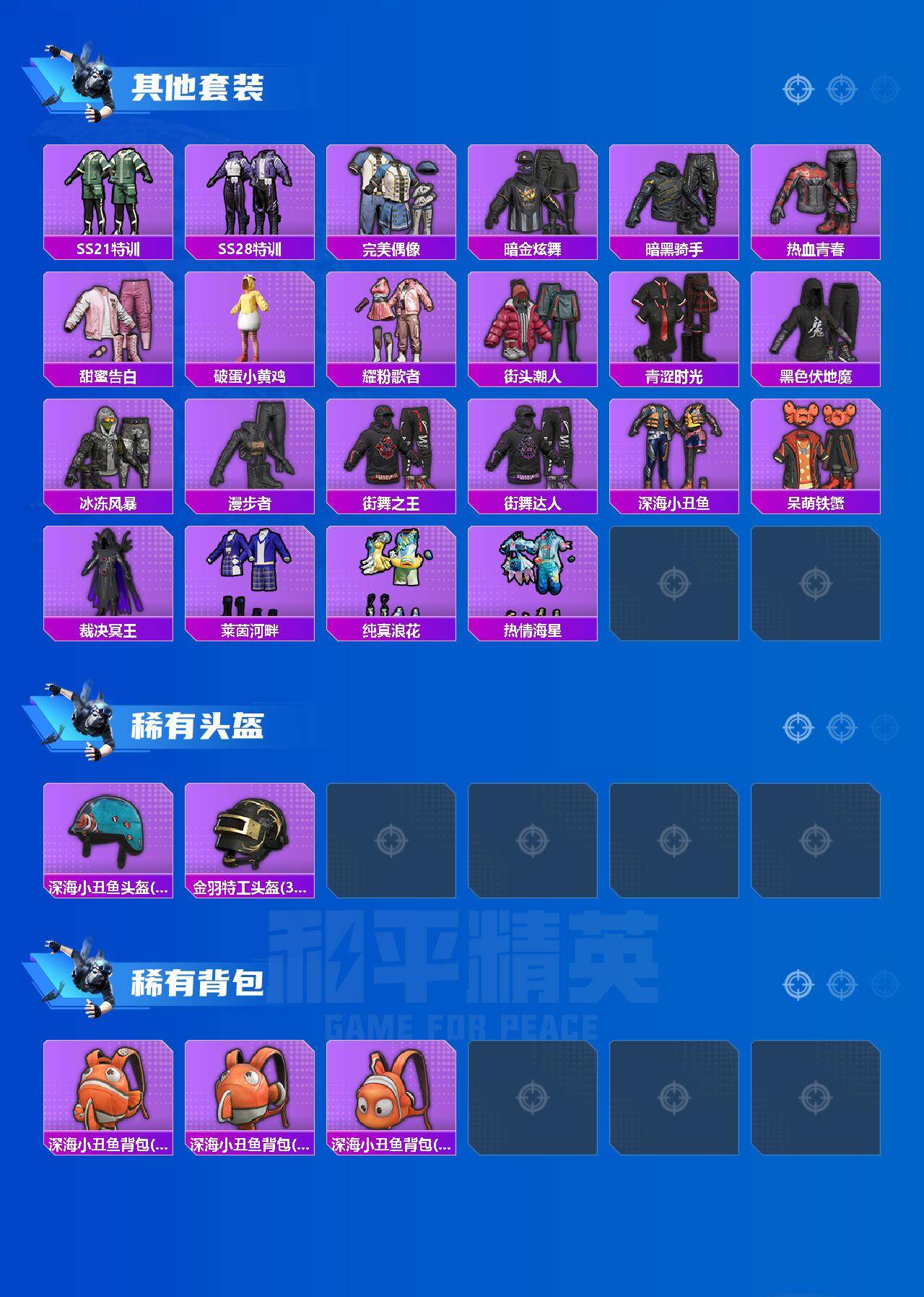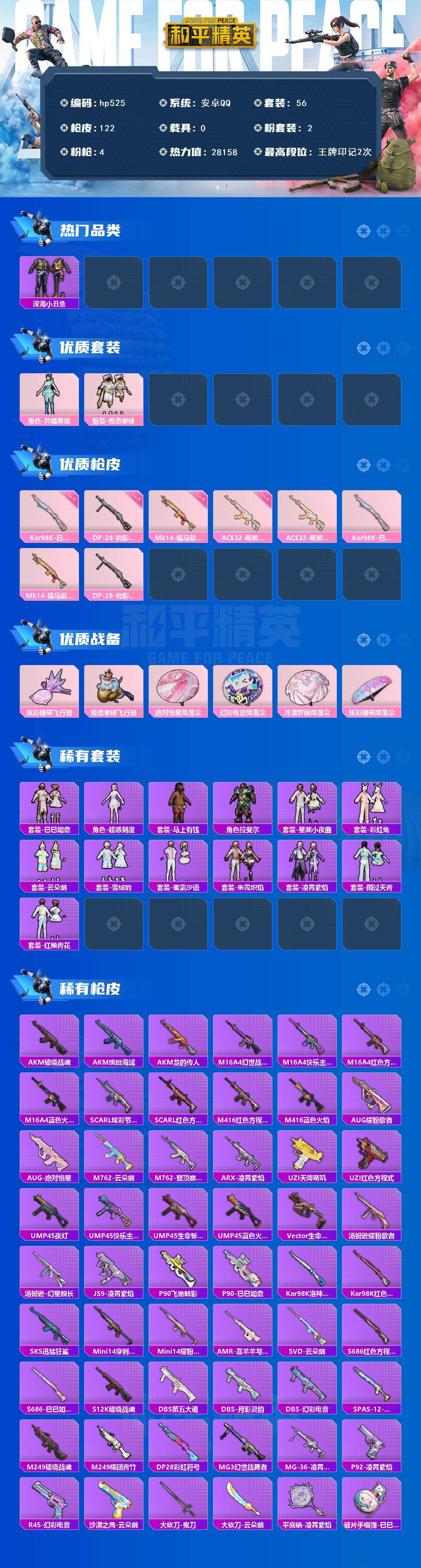 [17273890]安卓 手Q-2粉装-4特效枪-0载具-2粉色飞行器-28158热力值-2王牌印记-56套装-122枪皮 【热门品类】:套装-深海小丑鱼 【粉色套装】:角色-异瞳寒姬,粉装-极意拳锋 【粉色枪皮等级】:ACE32-萌骑漫游(五级),Kar98K-巳巳如意(五级),Mk14-福马献瑞(五级),DP-28-豹影疾电(五级) 【粉色枪皮】:ACE32-萌骑漫游,Kar98K-巳巳如意,Mk14-福马献瑞,DP-28-豹影疾电 【粉色飞行器】:炫彩糖果飞行器,极意拳锋飞行器 【粉色降落伞】:绝对恒星降落伞,幻彩电音降落伞,冷漠罗丽降落伞,炫彩糖果降落伞 【稀有套装】:套装-巳巳如意,角色-超感刻度,套装-雪国风尚,套装-炫彩糖果,套装-马上有钱,角色-拉斐尔,套装-星渊小夜曲,套装-彩虹兔,套装-云朵鹅,套装-雪绒豹,套装-蜜露汐语,套装-朱霞炽焰,套装-凌霄紫焰,套装-雨过天青,套装-红釉青花 【稀有枪皮】:AUG-冰晶雪宝,AKM-破晓战魂,AKM-缤纷海域,AKM-龙的传人,M16A4-幻世战舞者,M16A4-快乐主宰,M16A4-红色方程式,M16A4-蓝色火焰,SCAR-L-炫彩节奏,SCAR-L-红色方程式,M416-红色方程式,M416-蓝色火焰,AUG-耀粉歌者,AUG-绝对恒星,M762-云朵鹅,M762-登顶巅峰,ARX-凌霄紫焰,UZI-天降萌叽,UZI-红色方程式,UMP45-夜灯,UMP45-快乐主宰,UMP45-生命誓言,UMP45-蓝色火焰,Vector-生命誓言,汤姆逊-耀粉歌者,汤姆逊-幻星舰长,JS9-凌霄紫焰,P90-飞驰魅影,P90-巳巳如意,Kar98K-洛神天依,Kar98K-红色方程式,SKS-迅猛狂鲨,Mini14-穿刺龙虾,Mini14-耀粉歌者,AMR-喜羊羊与灰太狼,SVD-云朵鹅,S686-红色方程式,S686-巳巳如意,S12K-破晓战魂,DBS-第五大道,DBS-幻彩电音,DBS-月影灵韵,SPAS-12-云朵鹅,M249-破晓战魂,M249-糯团青竹,DP-28-彩虹符号,MG3-幻世战舞者,MG-36-凌霄紫焰,P92-凌霄紫焰,R45-幻彩电音,沙漠之鹰-云朵鹅,大砍刀-云朵鹅,大砍刀-鬼刀,平底锅-凌霄紫焰,破片手榴弹-巳巳如意 【其他套装】:套装-SS21特训,套装-SS28特训,套装-完美偶像,套装-暗