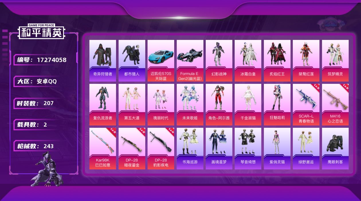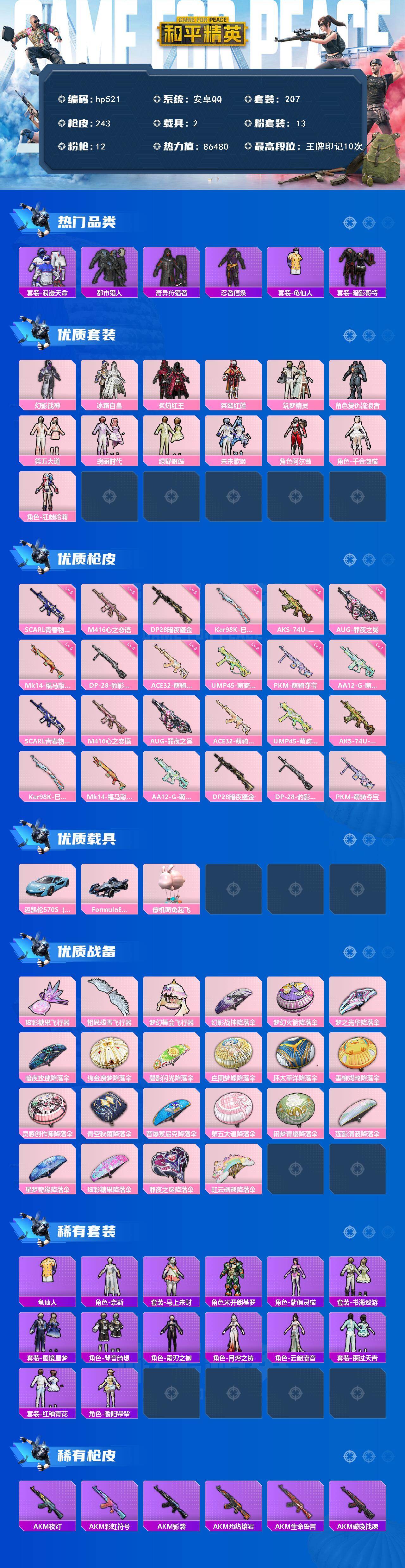 [17274058]安卓 手Q-13粉装-12特效枪-2载具-4粉色飞行器-86480热力值-10王牌印记-207套装-243枪皮 【热门品类】:套装-浪漫天命,套装-都市猎人,套装-奇异狩猎者,套装-忍者信条,套装-龟仙人,套装-暗影哥特 【粉色套装】:粉装-幻影战神,粉装-冰霜白皇,粉装-炙焰红王,粉装-桀骜红莲,粉装-筑梦精灵,角色-复仇流浪者,粉装-第五大道,粉装-瑰丽时代,粉装-绿野邂逅,粉装-未来歌姬,角色-阿尔茜,角色-千金淑猫,角色-狂魅哈莉 【粉色枪皮等级】:SCAR-L-青春物语(五级),M416-心之恋语(五级),AUG-罪夜之冕(五级),ACE32-萌骑漫游(三级),UMP45-萌骑冒险(二级),AKS-74U-森灵之息(五级),Kar98K-巳巳如意(五级),Mk14-福马献瑞(五级),AA12-G-萌骑幻想(一级),DP-28-暗夜鎏金(五级),DP-28-豹影疾电(四级),PKM-萌骑夺宝(一级) 【粉色载具】:迈凯伦570S(天际蓝),Formula E Gen2(幽光蓝),僚机-萌兔起飞 【粉色枪皮】:SCAR-L-青春物语,M416-心之恋语,AUG-罪夜之冕,ACE32-萌骑漫游,UMP45-萌骑冒险,AKS-74U-森灵之息,Kar98K-巳巳如意,Mk14-福马献瑞,AA12-G-萌骑幻想,DP-28-暗夜鎏金,DP-28-豹影疾电,PKM-萌骑夺宝 【粉色飞行器】:炫彩糖果飞行器,相思残雪飞行器,梦幻舞会飞行器 【粉色降落伞】:幻影战神降落伞,梦幻火箭降落伞,梦之光华降落伞,暗夜玫瑰降落伞,绚金瑰梦降落伞,碧影闪光降落伞,庄周梦蝶降落伞,环太平洋降落伞,垂柳戏鸭降落伞,灵感创作师降落伞,青空秋雨降落伞,音爆索尼克降落伞,第五大道降落伞,闲梦青缨降落伞,莲影清波降落伞,星梦奇缘降落伞,炫彩糖果降落伞,罪夜之冕降落伞,虹云熊熊降落伞 【稀有套装】:套装-龟仙人,角色-奈斯,套装-马上来财,角色-米开朗基罗,角色-紫俏灵猫,套装-书海巡游,套装-画境星梦,套装-琴音绮想,角色-霜刃之御,角色-月烬之祷,角色-云韶流音,套装-雨过天青,套装-红釉青花,角色-暖阳柴柴 【稀有枪皮】:AKM-夜灯,AKM-彩虹符号,AKM-影袭,AKM-灼热熔岩,AKM-生命誓言,AKM-破晓战魂,AKM-筑梦精灵,AKM-萌趣颜团子,AKM-虎虎生威,AKM-龙的传