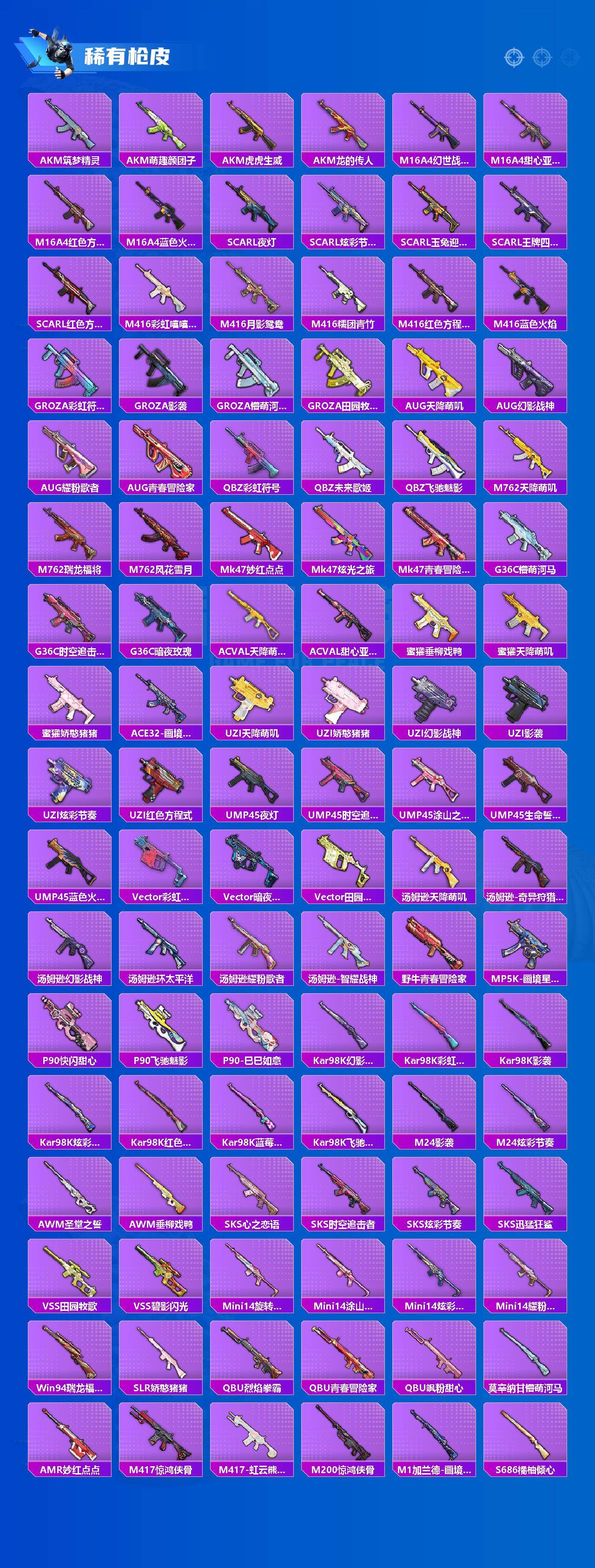 【粉色枪皮】:SCAR-L-青春物语,M416-心之恋语,AUG-罪夜之冕,ACE32-萌骑漫游,UMP45-萌骑冒险,AKS-74U-森灵之息,Kar98K-巳巳如意,Mk14-福马献瑞,AA12-G-萌骑幻想,DP-28-暗夜鎏金,DP-28-豹影疾电,PKM-萌骑夺宝