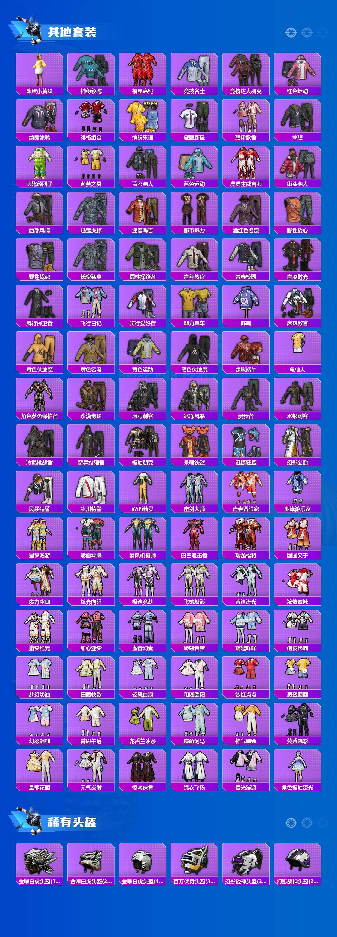 套装-都市猎人,套装-奇异狩猎者,套装-幻影战神,套装-炙焰红王,套装-桀骜红莲,套装-筑梦精灵,角色-复仇流浪者,套装-第五大道,套装-瑰丽时代,套装-绿野邂逅,套装-未来歌姬,角色-阿尔茜,角色-千金淑猫,套装-鹰眼刺客,套装-呆萌铁蟹,套装-迅捷狂鲨