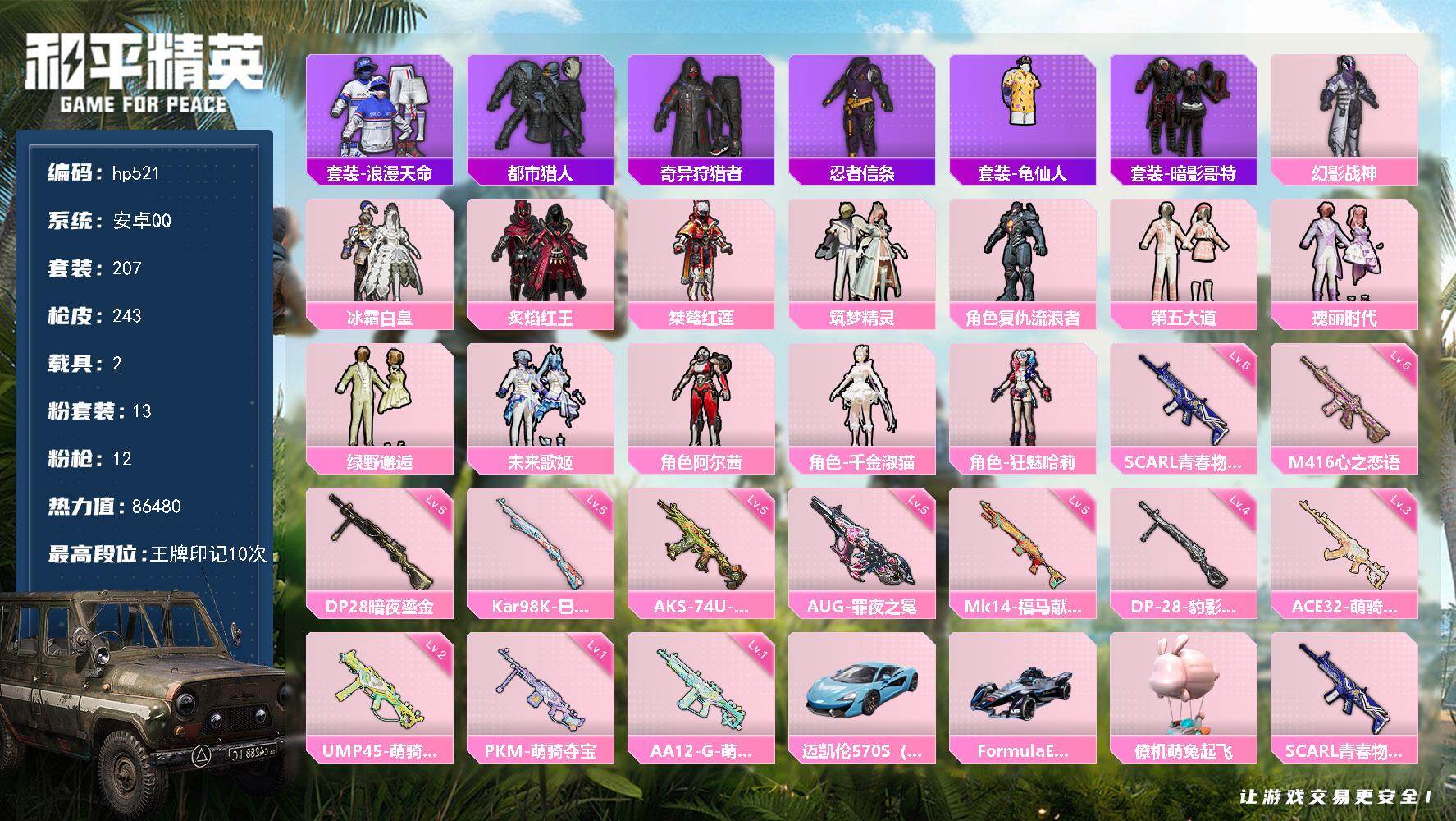 [17274058]安卓 手Q-13粉装-12特效枪-2载具-4粉色飞行器-86480热力值-10王牌印记-207套装-243枪皮