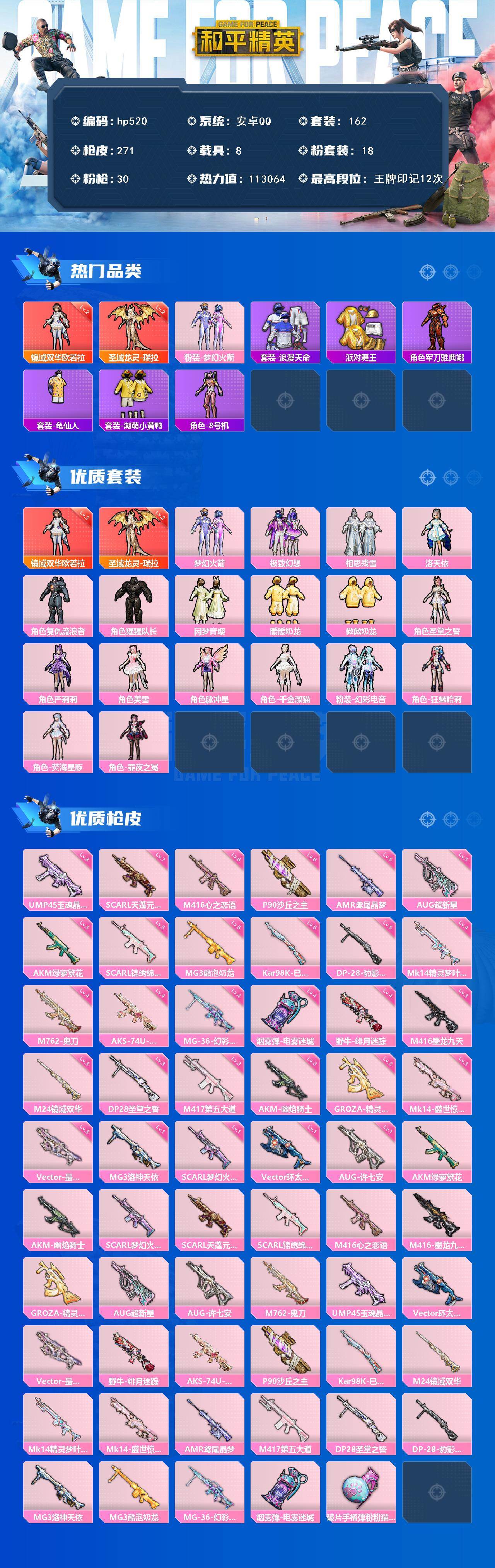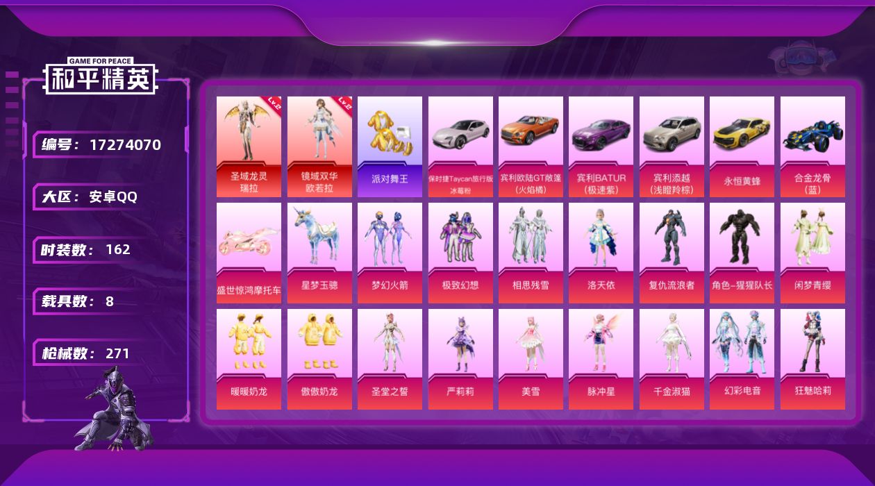 [17274070]安卓 手Q-2神装-18粉装-30特效枪-8载具-15粉色飞行器-113064热力值-12王牌印记-162套装-271枪皮 【红色神装等级】:圣域龙灵-瑞拉(二级),镜域双华-欧若拉(二级) 【红色角色神装】:圣域龙灵-瑞拉,镜域双华-欧若拉 【热门品类】:粉装-梦幻火箭,套装-浪漫天命,套装-派对舞王,角色-军刀雅典娜,套装-龟仙人,套装-潮萌小黄鸭,角色-8号机 【粉色套装】:粉装-梦幻火箭,粉装-极致幻想,粉装-相思残雪,角色-洛天依,角色-复仇流浪者,角色-猩猩队长,粉装-闲梦青缨,粉装-暖暖奶龙,粉装-傲傲奶龙,角色-圣堂之誓,角色-严莉莉,角色-美雪,角色-脉冲星,角色-千金淑猫,粉装-幻彩电音,角色-狂魅哈莉,角色-荧海星豚,角色-罪夜之冕 【粉色枪皮等级】:AKM-绿萝繁花(五级),AKM-幽焰骑士(三级),SCAR-L-梦幻火箭(一级),SCAR-L-天蓬元帅(七级),SCAR-L-锦绣绵绵(五级),M416-心之恋语(六级),M416-墨龙九天(三级),GROZA-精灵之光(三级),AUG-超新星(五级),AUG-许七安(一级),M762-鬼刀(四级),UMP45-玉魂晶魄(八级),Vector-环太平洋(一级),Vector-最终圣卫者(三级),野牛-绯月迷踪(四级),AKS-74U-星穹咏叹调(四级),P90-沙丘之主(六级),Kar98K-巳巳如意(五级),M24-镜域双华(三级),Mk14-精灵梦叶罗丽(四级),Mk14-盛世惊鸿(三级),AMR-鸢尾晶梦(五级),M417-第五大道(三级),DP-28-圣堂之誓(三级),DP-28-豹影疾电(五级),MG3-洛神天依(一级),MG3-酷泡奶龙(五级),MG-36-幻彩电音(四级),烟雾弹-电雾迷城(四级) 【粉色载具】:宾利欧陆GT敞篷(火焰橘),宾利BATUR(极速紫),宾利添越(浅瞪羚棕),保时捷Taycan 旅行版(冰莓粉),永恒黄蜂,合金龙骨(蓝),盛世惊鸿摩托车,空客H135-蔚蓝之翼,星梦玉骢 【粉色枪皮】:AKM-绿萝繁花,AKM-幽焰骑士,SCAR-L-梦幻火箭,SCAR-L-天蓬元帅,SCAR-L-锦绣绵绵,M416-心之恋语,M416-墨龙九天,GROZA-精灵之光,AUG-超新星,AUG-许七安,M762-鬼刀,UMP45-玉魂晶魄,Vector-环太平洋,Vec