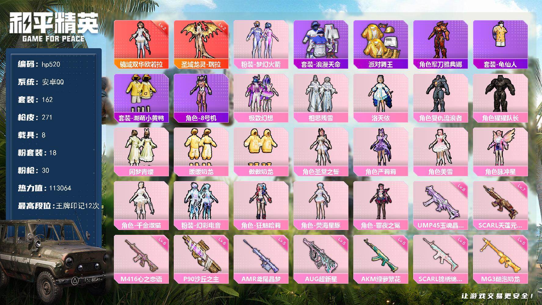 [17274070]安卓 手Q-2神装-18粉装-30特效枪-8载具-15粉色飞行器-113064热力值-12王牌印记-162套装-271枪皮