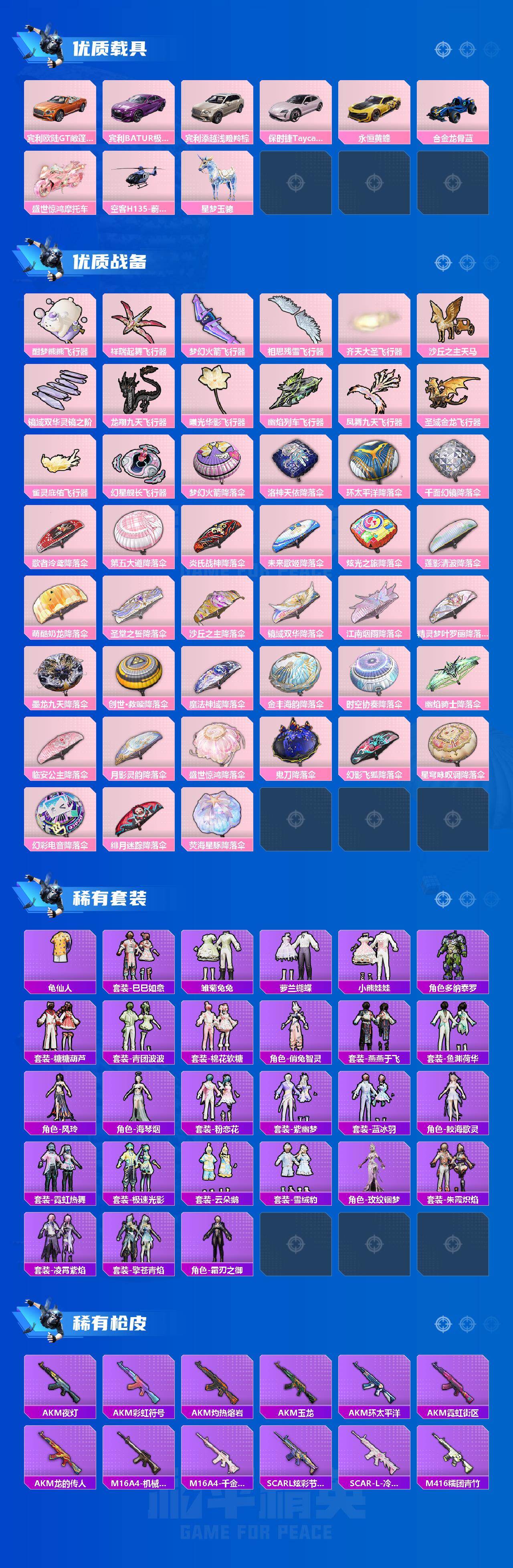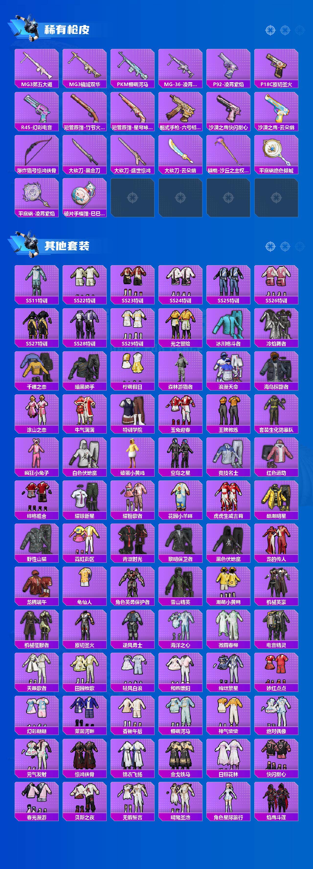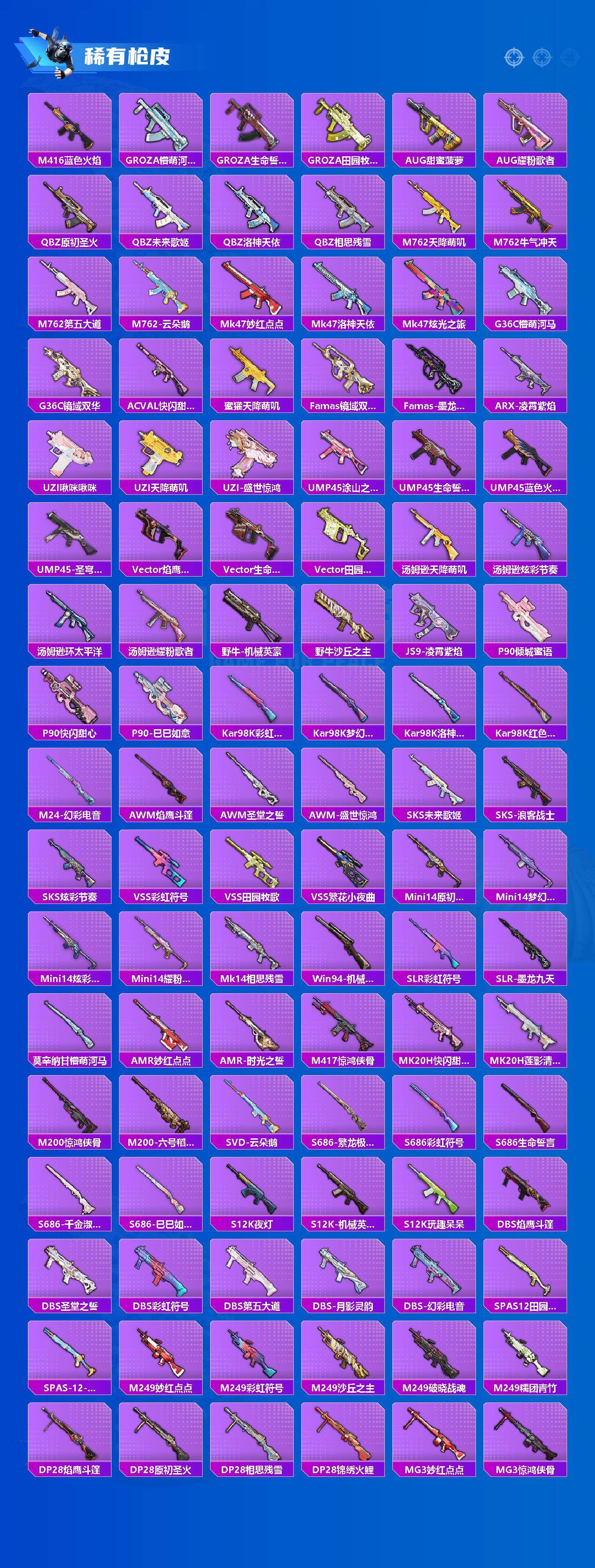 AKM-绿萝繁花,AKM-幽焰骑士,SCAR-L-梦幻火箭,SCAR-L-天蓬元帅,SCAR-L-锦绣绵绵,M416-心之恋语,M416-墨龙九天,GROZA-精灵之光,AUG-超新星,AUG-许七安,M762-鬼刀,UMP45-玉魂晶魄,Vector-环太平洋,P90-沙丘之主,Kar98K-巳巳如意,M24-镜域双华,Mk14-精灵梦叶罗丽,Mk14-盛世惊鸿,AMR-鸢尾晶梦,M417-第五大道,DP-28-圣堂之誓,MG3-洛神天依,MG3-酷泡奶龙,破片手榴弹-粉粉猫爪