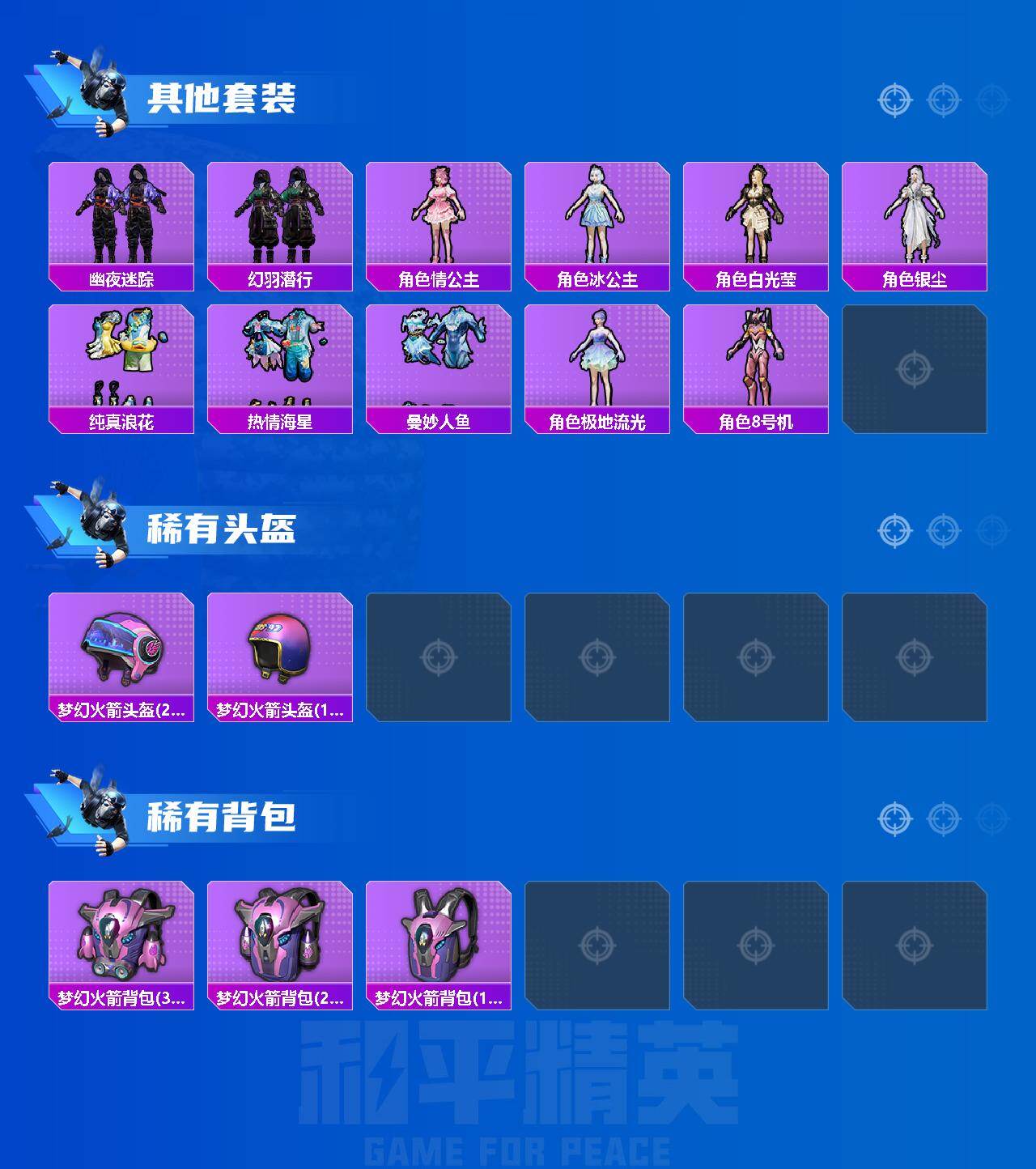 套装-浪漫天命,角色-军刀雅典娜,套装-龟仙人,角色-8号机,套装-破蛋小黄鸡,角色-英勇保护者,套装-雪山精英,套装-机械英豪,海洋之心套装