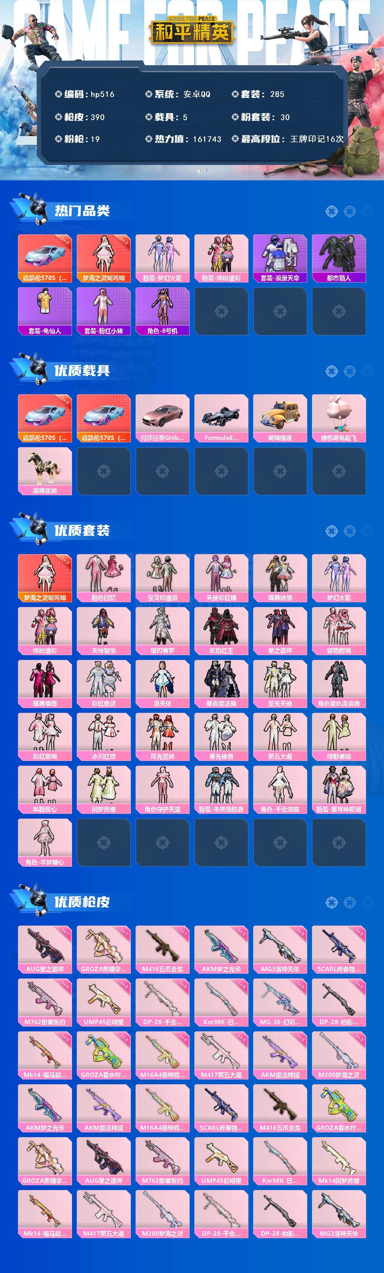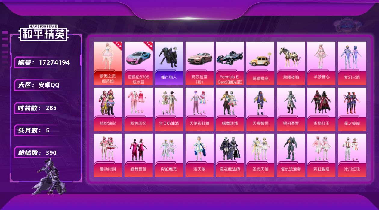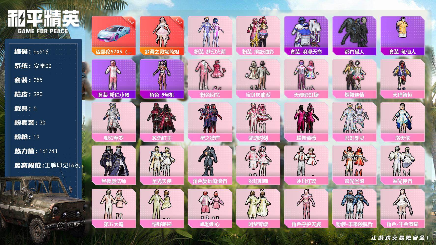 [17274194]安卓 手Q-1神装-30粉装-19特效枪-5载具-8粉色飞行器-161743热力值-16王牌印记-285套装-390枪皮