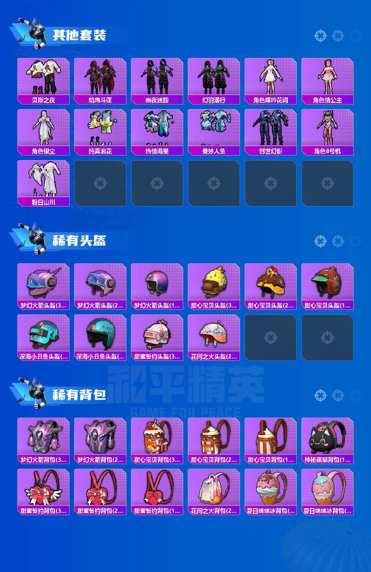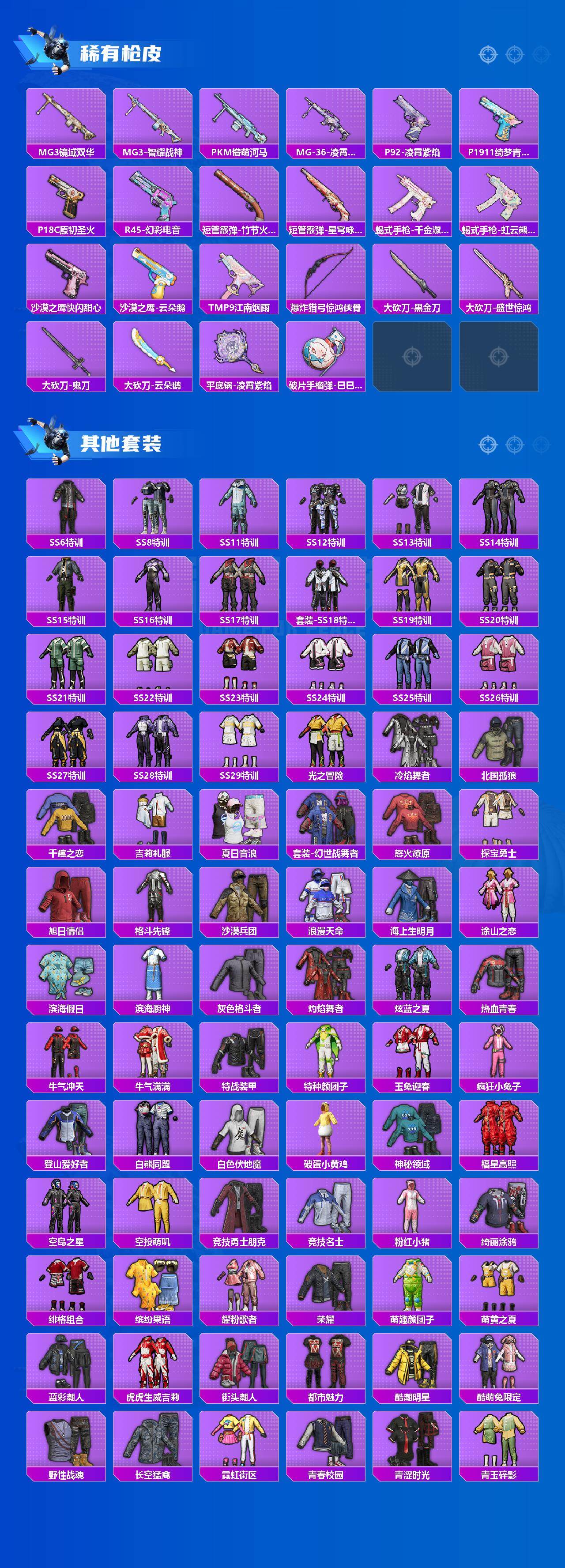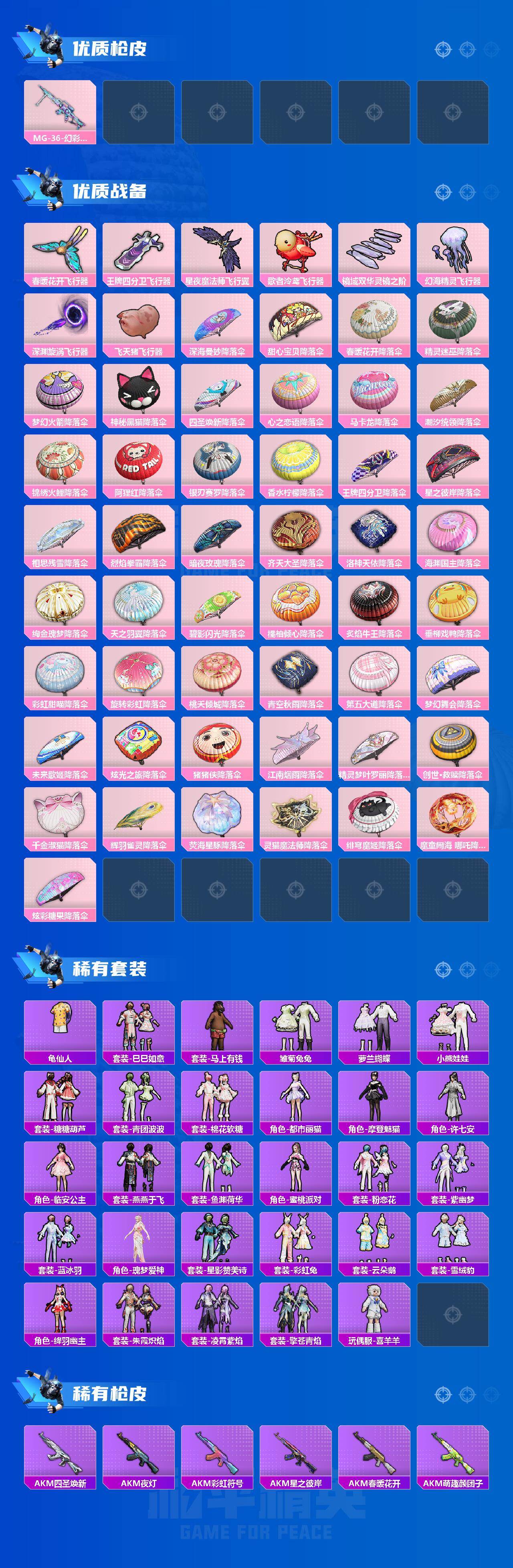 - [12680107]安卓 手Q-10粉装-7特效枪-1载具-3粉色飞行器-82169热力值-15王牌印记-193套装-248枪皮 【热门品类】:套装-龟仙人,角色-Mark.06 【粉色载具】:星梦玉骢 【粉色套装】:粉装-彩虹甜喵,粉装-千面幻镜,粉装-暗夜鎏金,角色-烟云彩露,角色-电磁星,角色-鸢尾晶梦,角色-星梦奇缘,粉装-金丰海韵,角色-智耀战神,角色-冷漠罗丽 【粉色枪皮等级】:M416-电玩时刻(五级),Kar98K-巳巳如意(五级),Mk14-精灵梦叶罗丽(七级),DP-28-暗夜鎏金(七级),DP-28-千金淑猫(一级),DP-28-豹影疾电(一级),PKM-守护天翼(五级) 【粉色枪皮】:M416-电玩时刻,Kar98K-巳巳如意,Mk14-精灵梦叶罗丽,DP-28-暗夜鎏金,DP-28-千金淑猫,DP-28-豹影疾电,PKM-守护天翼 【粉色飞行器】:齐天大圣飞行器,天之羽翼飞行器,星梦奇缘飞行器 【粉色降落伞】:甜蜜誓约降落伞,四圣焕新降落伞,暗夜玫瑰降落伞,齐天大圣降落伞,暗星紫秘降落伞,恐龙拽拽降落伞,庄周梦蝶降落伞,太空嘟嘟降落伞,彩虹甜喵降落伞,暗夜鎏金降落伞,第五大道降落伞,仲夏莫吉托降落伞,圣堂之誓降落伞,精灵梦叶罗丽降落伞,星梦奇缘降落伞,守护天翼降落伞,千金淑猫降落伞,智耀战神降落伞,星穹咏叹调降落伞,冷漠罗丽降落伞 【稀有套装】:套装-龟仙人,玩偶服-憨乐熊二,套装-巳巳如意,套装-雏菊兔兔,套装-萝兰蝴蝶,套装-小熊娃娃,角色-拉斐尔,角色-狂花道·娜可露露,套装-糖糖葫芦,套装-青团波波,套装-棉花软糖,角色-都市丽猫,角色-摩登魅猫,套装-燕燕于飞,套装-鱼渊荷华,套装-晶辉守护,角色-蜜桃派对,套装-风舞幻音,套装-粉恋花,套装-紫幽梦,套装-蓝冰羽,套装-星影赞美诗,套装-星渊小夜曲,套装-彩虹兔,套装-云朵鹅,套装-雪绒豹,角色-灵公主,套装-朱霞炽焰,套装-凌霄紫焰,套装-擎苍青焰 【稀有枪皮】:AKM-夜灯,AKM-彩虹符号,AKM-破晓战魂,AKM-胡桃卫兵,AKM-萌趣颜团子,AKM-虎虎生威,AKM-霓虹街区,AKM-龙的传人,M16A4-幻世战舞者,M16A4-甜心亚梦,M16A4-生命誓言,M16A4-红色方程式,M16A4-千金淑猫,SCAR-L-玉兔迎春,SCAR-L-生命誓言,SCAR-L-红色方程式,SCAR