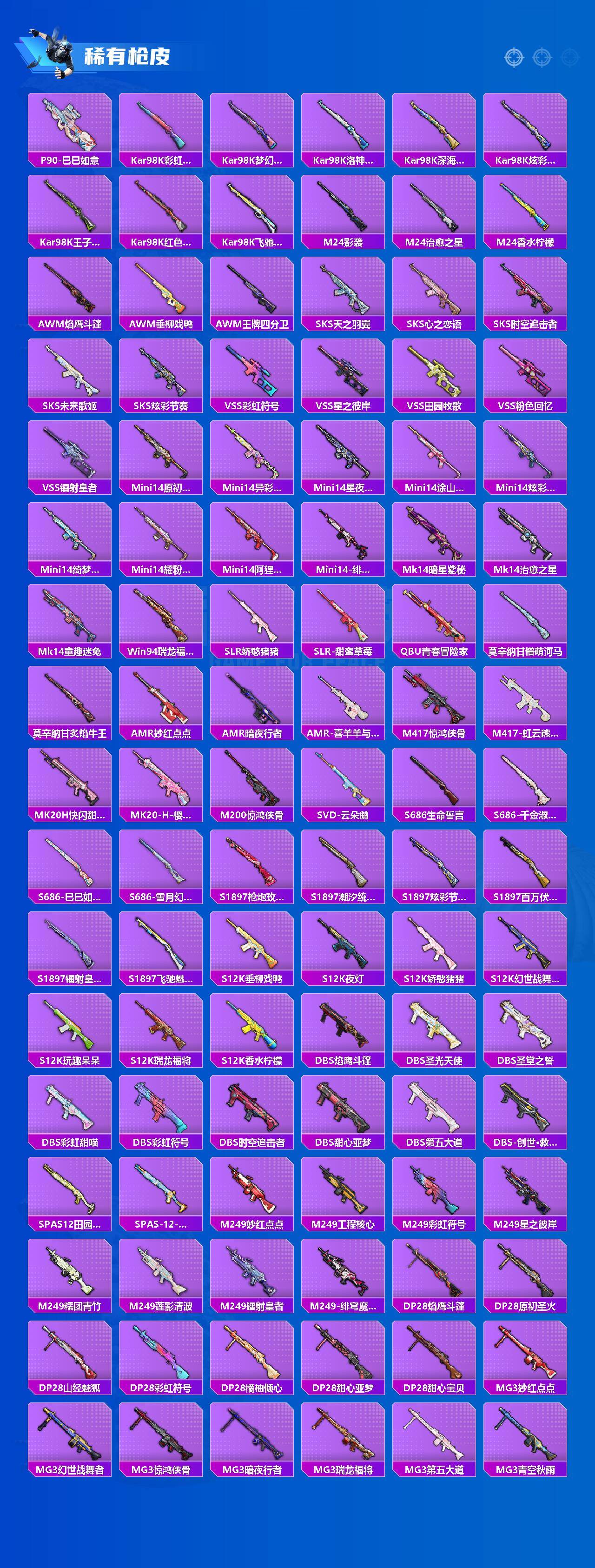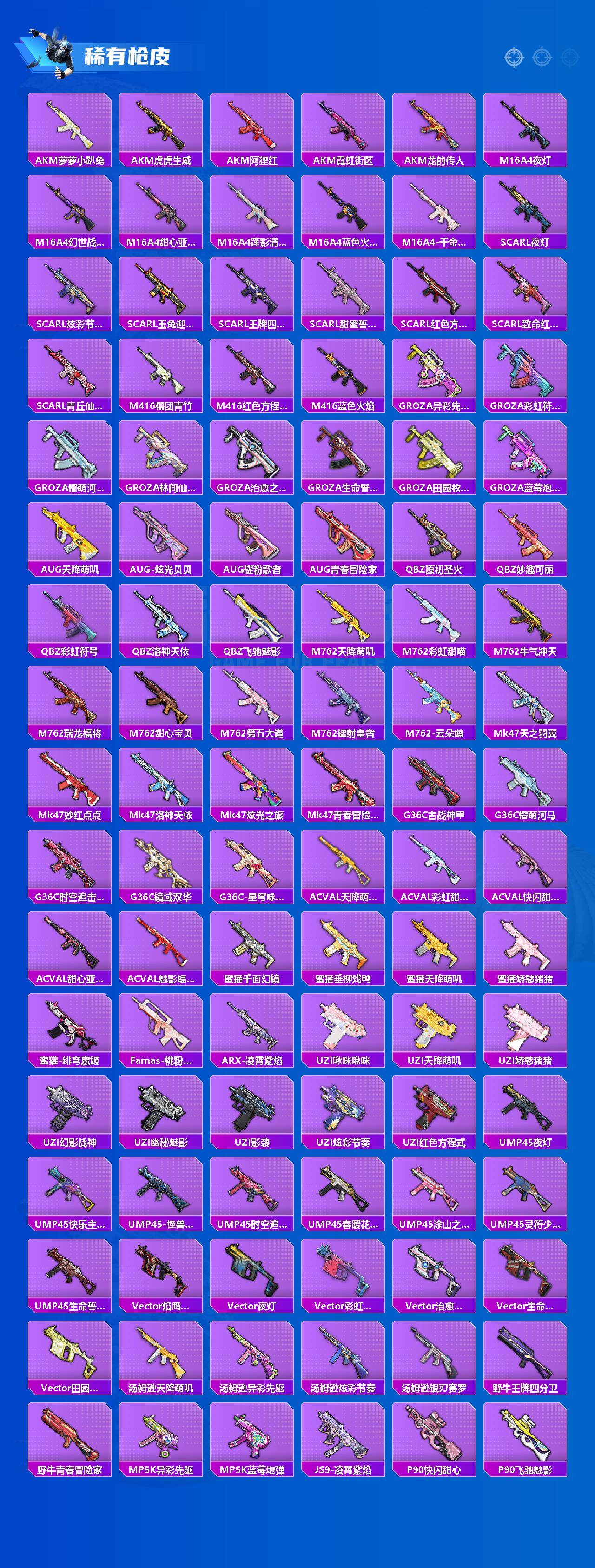 【粉色枪皮】:AKM-梦之光华,AKM-魔法神域,M16A4-垂柳戏鸭,SCAR-L-青春物语,M416-五爪金龙,GROZA-香水柠檬,GROZA-焦糖拿铁,AUG-星之彼岸,M762-甜蜜誓约,UMP45-启明星,Kar98K-巳巳如意,Mk14-闲梦青缨,Mk14-福马献瑞,M417-第五大道,M200-梦海之灵,DP-28-千金淑猫,DP-28-豹影疾电,MG3-洛神天依,MG-36-幻彩电音