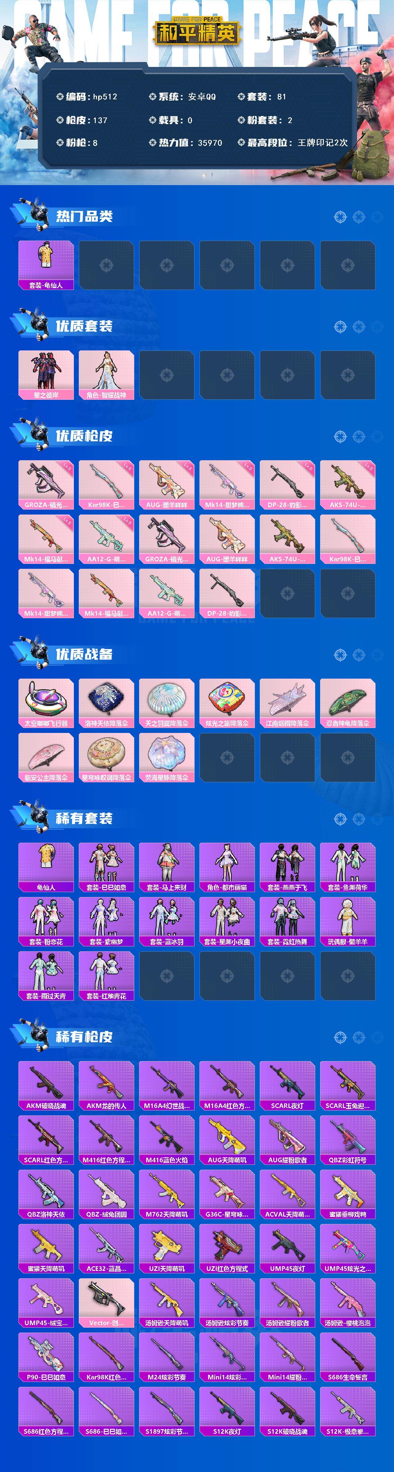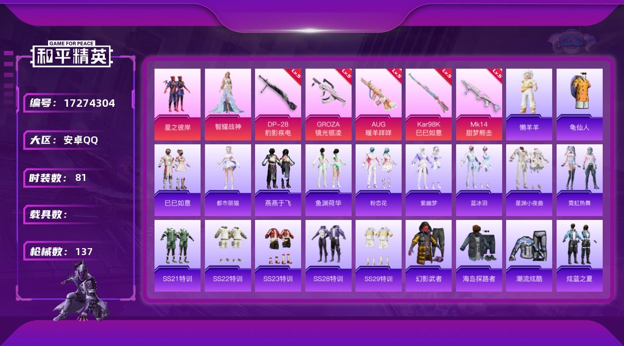 [17274304]安卓 手Q-2粉装-8特效枪-0载具-1粉色飞行器-35970热力值-2王牌印记-81套装-137枪皮 【热门品类】:套装-龟仙人 【粉色套装】:粉装-星之彼岸,角色-智耀战神 【粉色枪皮等级】:GROZA-镜光银凌(五级),AUG-暖羊咩咩(五级),AKS-74U-森灵之息(五级),Kar98K-巳巳如意(五级),Mk14-甜梦熊击(五级),Mk14-福马献瑞(五级),AA12-G-萌骑幻想(五级),DP-28-豹影疾电(五级) 【粉色枪皮】:GROZA-镜光银凌,AUG-暖羊咩咩,AKS-74U-森灵之息,Kar98K-巳巳如意,Mk14-甜梦熊击,Mk14-福马献瑞,AA12-G-萌骑幻想,DP-28-豹影疾电 【粉色飞行器】:太空嘟嘟飞行器 【粉色降落伞】:洛神天依降落伞,天之羽翼降落伞,炫光之旅降落伞,江南烟雨降落伞,忍者神龟降落伞,临安公主降落伞,星穹咏叹调降落伞,荧海星豚降落伞 【稀有套装】:套装-龟仙人,套装-巳巳如意,套装-马上来财,角色-都市丽猫,套装-燕燕于飞,套装-鱼渊荷华,套装-粉恋花,套装-紫幽梦,套装-蓝冰羽,套装-星渊小夜曲,套装-霓虹热舞,玩偶服-懒羊羊,套装-雨过天青,套装-红釉青花 【稀有枪皮】:AKM-破晓战魂,AKM-龙的传人,M16A4-幻世战舞者,M16A4-红色方程式,SCAR-L-夜灯,SCAR-L-玉兔迎春,SCAR-L-红色方程式,M416-红色方程式,M416-蓝色火焰,AUG-天降萌叽,AUG-耀粉歌者,QBZ-彩虹符号,QBZ-洛神天依,QBZ-绒兔团圆,M762-天降萌叽,G36C-星穹咏叹调,AC-VAL-天降萌叽,蜜獾-垂柳戏鸭,蜜獾-天降萌叽,ACE32-蓝晶绮麟,UZI-天降萌叽,UZI-红色方程式,UMP45-夜灯,UMP45-炫光之旅,UMP45-绒宝小鹅,Vector-创世·救赎,汤姆逊-天降萌叽,汤姆逊-炫彩节奏,汤姆逊-耀粉歌者,汤姆逊-樱桃泡泡,P90-巳巳如意,Kar98K-红色方程式,M24-炫彩节奏,Mini14-炫彩节奏,Mini14-耀粉歌者,S686-生命誓言,S686-红色方程式,S686-巳巳如意,S1897-炫彩节奏,S12K-破晓战魂,S12K-夜灯,S12K-极意拳锋,DBS-第五大道,M249-破晓战魂,DP-28-彩虹符号,MG3-妙红点点,MG3-幻世战舞