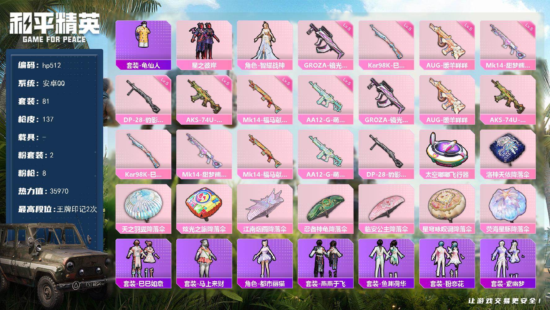 [17274304]安卓 手Q-2粉装-8特效枪-0载具-1粉色飞行器-35970热力值-2王牌印记-81套装-137枪皮