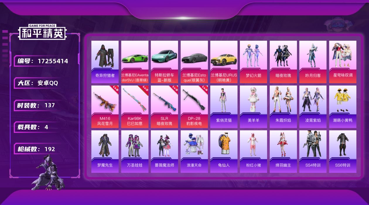 [17255414]【店主推荐捡漏号!可直接换绑】地铁满天赋安卓 手Q-4粉装-4特效枪-4载具-3粉色飞行器-63440热力值-4王牌印记-137套装-192枪皮热门品类】:粉装-梦幻火箭,套装-浪漫天命,套装-奇异狩猎者,套装-龟仙人,套装-潮萌小黄鸭,套装-粉红小猪,小恶魔头饰【粉色载具】:特斯拉Roadster(水滴蓝),兰博基尼Aventador SVJ(翡翠绿),兰博基尼Estoque(银翼灰),兰博基尼URUS(明艳黄)【粉色套装】:粉装-梦幻火箭,粉装-暗夜玫瑰,粉装-吟月归客,粉装-星穹咏叹调【粉色枪皮等级】:M416-风花雪月(六级),Kar98K-巳巳如意(五级),SLR-暗夜玫瑰(五级),DP-28-豹影疾电(四级)【粉色枪皮】:M416-风花雪月,Kar98K-巳巳如意,SLR-暗夜玫瑰,DP-28-豹影疾电【粉色飞行器】:齐天大圣飞行器,风花雪月飞行器,太空嘟嘟飞行器