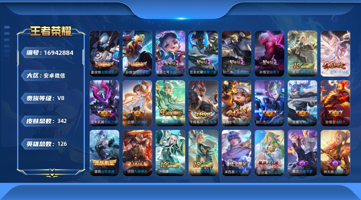 [16942884]安卓WX-V8-最强王者段位-126英雄-341皮肤-2典藏皮肤-11传说-94史诗-3星传-发育路44段