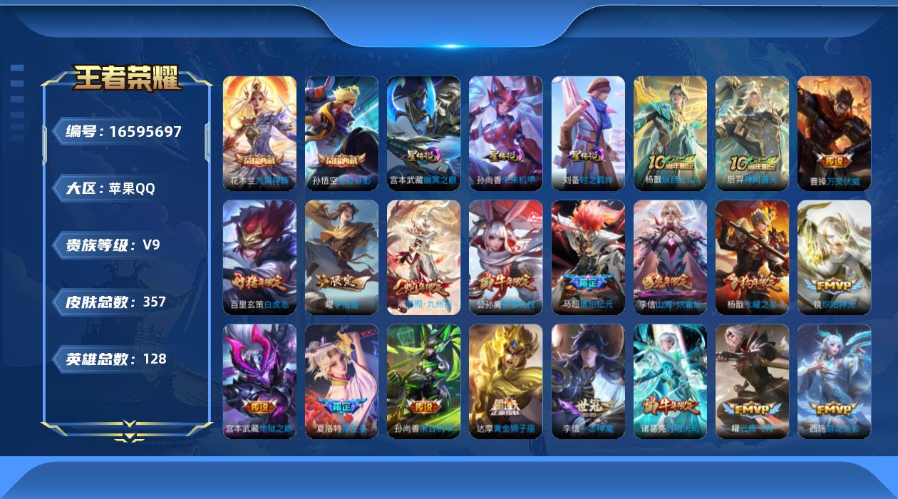 [16595697]苹果Q-V9-最强王者段位-128英雄-357皮肤-2典藏皮肤-30传说-102史诗 【英雄全皮】:达摩全皮,刘邦全皮,孙权全皮,李信全皮,猪八戒全皮,蒙恬全皮,夏洛特全皮,空空儿全皮,影全皮 【荣耀典藏】:孙悟空全息碎影,花木兰九霄神辉 【传说皮肤】:杨戬纵目迁山,后羿神树通天,曹操万灵伏威,澜愿照九州拓,云缨幻光神枪,桑启鸣野蒿,马超琥珀纪元,吕布遇见神鼓,夏洛特浮生妄,花木兰燃星之曲,项羽无限倾心,李信山海炽霜斩,李白诗剑行,赵云淬星耀世,西施游龙清影,曜李逍遥 ,公孙离祈雪灵祝,诸葛亮时雨天司,镜炽阳神光,虞姬启明星使,孙悟空零号赤焰,曜云鹰飞将,李信一念神魔,貂蝉猫影幻舞,达摩黄金狮子座,百里玄策白虎志,花木兰冠军飞将,杨戬永曜之星,孙尚香末日机甲,宫本武藏地狱之眼 【限定皮肤】:姜子牙天穹之誓,狄仁杰阴阳师,赵云皇家上将,赵云引擎之心,赵云龙胆,墨子神迹守卫,嬴政优雅恋人,阿轲迷踪丽影,扁鹊奇幻香踪,芈月白晶晶,芈月幻夜卜梦,吕布御风骁将,吕布遇见神鼓,元歌云间偶戏,元歌无心,夏侯惇朔风刀,马可波罗暗影游猎,马可波罗山海玄木吟,狄仁杰魔术师,狄仁杰万华元夜,达摩星际陆战队,达摩沙漠行僧,项羽海滩派对,项羽霸王别姬,项羽无限倾心,老夫子醍醐杖,老夫子航海奇遇记,程咬金演武夺筹,刘邦夺宝奇兵,韩信逐梦之影,韩信傲雪梅枪,兰陵王金庭之子,花木兰默契交锋,花木兰燃星之曲,亚瑟潮玩骑士王,孙悟空至尊宝,孙悟空大圣娶亲,孙悟空零号赤焰,牛魔御旌,牛魔奔雷神使,李元芳银河之约,李元芳云中旅人,虞姬霸王别姬,虞姬启明星使,钟馗驱傩正仪,杨戬永曜之星,杨戬潮玩骑兵,干将莫邪冰霜恋舞曲,雅典娜单词大作战,雅典娜黎明之约,鬼谷子原初探秘者,鬼谷子五谷丰年,诸葛亮时雨天司,黄忠火炮绅士,苏烈千军破阵,百里玄策白虎志,百里玄策原初追逐者,弈星混沌棋,梦奇顽趣,公孙离蜜橘之夏,公孙离祈雪灵祝,沈梦溪星空之诺,沈梦溪大漠名商,明世隐疑决卦,裴擒虎李小龙,裴擒虎擒涛扼浪,狂铁御狮,米莱狄御霄,云中君纤云弄巧,李信山海炽霜斩,伽罗天狼溯光者,盾山御銮,猪八戒西部大镖客,猪八戒猪悟能,上官婉儿梁祝,嫦娥暖冬兔眠,曜李逍遥 ,西施玲珑珍味,蒙犽狂想玩偶喵,鲁班大师探海日志,桑启海盐诗旅,夏洛特浮生妄,暃星界游侠,戈娅驭风魔法,艾琳女武神,张良古海寻踪,蒙犽百解令,蒙恬荣光圣徽,鬼谷子天穹祈