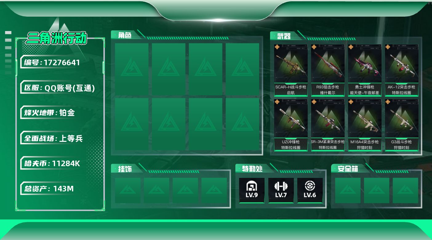 [17276641]143m总资产-11284k哈伏币-60烽火等级-铂金-50战场等级-上等兵 【近战皮肤】:近战-黑鹰 【传说外观】:M4A1突击步枪-阿米娅,M16A4突击步枪-狩猎时刻,AK-12突击步枪-特斯拉线圈,SCAR-H战斗步枪-启航,G3战斗步枪-狩猎时刻,CAR-15突击步枪-阿米娅,Vector冲锋枪-狩猎时刻,UZI冲锋枪-特斯拉线圈,SR-3M紧凑突击步枪-特斯拉线圈,勇士冲锋枪-能天使-午夜邮差,R93狙击步枪-维什戴尔,复合弓-黑·天际线 【史诗外观】:MP7冲锋枪-原型机,AKM突击步枪-林中猎手,M16A4突击步枪-竞赛选手,AUG突击步枪-蝮蛇,SG552突击步枪-深海恐惧,MP5冲锋枪-深海恐惧,MP5冲锋枪-战术竞备,MP5冲锋枪-竞技风,勇士冲锋枪-深海恐惧,勇士冲锋枪-工业狂潮,M1014霰弹枪-林中猎手,PKM通用机枪-蝮蛇,SV-98狙击步枪-林中猎手,SV-98狙击步枪-囚徒,R93狙击步枪-竞赛选手,M700狙击步枪-竞技风,沙漠之鹰-曙光 【稀有外观】:M14射手步枪-天际线,M4A1突击步枪-零点,AKM突击步枪-前沿科技,AKM突击步枪-肃杀,QBZ95-1突击步枪-公平竞技,K416突击步枪-碳纤维,M16A4突击步枪-街头涂鸦,AUG突击步枪-全金属外壳,M7战斗步枪-捣蛋鬼,AK-12突击步枪-零点,AK-12突击步枪-前沿科技,SCAR-H战斗步枪-荣耀列队,PTR-32突击步枪-天网,AS Val突击步枪-哈夫克科技,MP5冲锋枪-弄臣,MP5冲锋枪-虎啸,P90冲锋枪-医疗协议,Vector冲锋枪-先锋,SMG-45-行动开启,SMG-45冲锋枪-幻影结构,SMG-45冲锋枪-天网,MP7冲锋枪-幻影结构,M1014霰弹枪-幻影结构,M1014霰弹枪-童趣,M249轻机枪-战损,M250通用机枪-前沿科技,M250通用机枪-天网,Mini-14射手步枪-荣耀列队,SVD狙击步枪-战术行动,M14射手步枪-出厂配置,SKS射手步枪-弄臣,SR-25射手步枪-开拓,SR-9射手步枪-街头涂鸦,SV-98狙击步枪-星链科技,SV-98狙击步枪-哈夫克航天,SV-98狙击步枪-精英联盟 【普通外观】:CAR-15突击步枪-监察,M4A1突击步枪-粉色涂装,M4A1突击步枪-高雅黑,M4A1突击步枪-海色,QBZ95-1突