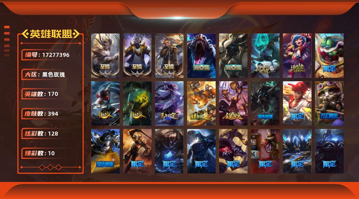 [17277396]【店主推荐捡漏号!可直接换绑】【双区服】白银段位-170英雄-394皮肤-128炫彩-0终极-7神话-61限定-50传说-104史诗 【热门头像】:觅心之翼奎因头像,玉剑传说苍鸾头像 【至臻皮肤】:至臻灵能特工伊泽瑞尔,至臻魔女婕拉,至臻真实伤害亚索 【臻彩皮肤】:天龙之子卡莎飞龙乘云,冠军之刃锐雯2016凯旋圣装,闭月之颜貂蝉炫金莲华,冠军之隐劫凯旋圣装,霸天战士雷恩加尔星啸天火,泳池派对辛德拉荔枝枝连击,泳池派对奥莉安娜优雅珠光鲸,魔女阿卡丽虚荣,净雪之月莫甘娜冬虹,红莲之刃锐雯 【年限皮肤】:龙的传人李青,银龙裁决泰隆,广寒仙子嫦娥,美猴王孙悟空,烈焰美人薇恩 【海克斯皮肤】:海克斯科技雷克顿,零之枪骑赫卡里姆 【情人节限定】:甜心宝贝安妮 【冰雪限定】:圣诞精灵崔丝塔娜,圣诞糖果棒厄运小姐,狂心冰王图奇,阿木木“主人不要我了”,平安夜女神娑娜,喜庆之树茂凯,圣诞玩偶波比,圣诞驯鹿克格莫,圣诞老人布隆,冰雪节辛吉德 【神话皮肤】:十周年纪念安妮,源代码乐芙兰,海克斯科技雷克顿,零之枪骑赫卡里姆,至臻真实伤害亚索,至臻灵能特工伊泽瑞尔,至臻魔女婕拉 【限定皮肤】:钢铁军团拉克丝,养蜂人辛吉德,送披萨的小姐姐希维尔,冠军之隐劫,冠军掠夺者卡兹克,冠军之志瑞兹,Fnatic库奇,暗杀星蒙多,暗杀星努努和威朗普,暗杀星慎,SKTT1李青,SSW辛吉德,SSW图奇,SKTT1瑞兹,SKTT1奥拉夫,iG卡蜜尔,iG卡莎,FPX锤石,星之守护者伊泽瑞尔,暗裔英雄盖伦,胜利女神希维尔,胜利枪神格雷福斯,胜利女神奥莉安娜,胜利之剑亚托克斯,胜利枪神卢锡安,胜利女神瑟庄妮,胜利凤凰艾尼维亚,胜利之运崔斯特,伯爵卡萨丁,鬼影森森茂凯,无头骑士赫卡里姆,泳池派对奥莉安娜,泳池派对厄运小姐,泳池派对李青,泳池派对塔莉垭,机械迷城加里奥,蓝色忧郁崔斯特,密林猎手提莫,外星装甲库奇,暗影沃里克,勇者阿狸,都铎王朝图奇,防暴士兵辛吉德,防暴天使凯尔,警用试作体K9内瑟斯 【传说皮肤】:铁哥们儿奥拉夫,地狱之门卫士加里奥,邪鸦魅影乐芙兰,大天使长米迦勒凯尔,源计划林易,恶魔男爵瑞兹,提莫约德尔人的一大步,约德尔国队长提莫,合金巨兽努努和威朗普,女皇艾希,源计划联合艾希,西部天使艾希,至尊魔女莫甘娜,绅士科加斯,律政大亨蒙多,冰霜之刃艾瑞莉娅,女主播迦娜,冰川巨兽墨菲特,上古战魂魔腾,地狱行