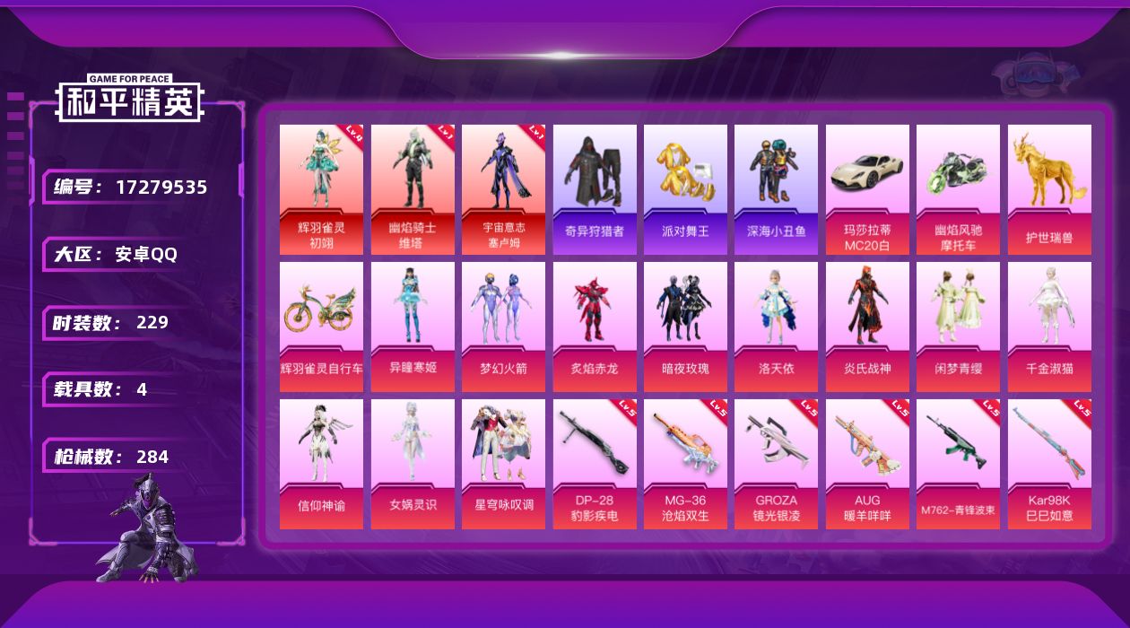 - [15340915]【1670】安卓 手Q-1神装-12粉装-8特效枪-3载具-4粉色飞行器-59077热力值-5王牌印记-111套装-159枪皮 【红色神装等级】:灵猫魔法师-塞维尔(三级) 【红色角色神装】:灵猫魔法师-塞维尔 【热门品类】:粉装-缤纷油彩,套装-浪漫天命,套装-冥河战士,套装-暗影哥特 【粉色套装】:粉装-缤纷油彩,角色-星梦奇缘,角色-樱桃泡泡,角色-智耀战神,角色-智慧纱织,角色-幻海仙踪,角色-狂魅哈莉,角色-冷漠罗丽,角色-花灵,角色-羊梦糖心,角色-异瞳寒姬,角色-震天雷神 【粉色枪皮等级】:AUG-超新星(五级),AUG-星梦奇缘(九级),Kar98K-巳巳如意(五级),Mk14-甜梦熊击(五级),AMR-智耀战神(四级),DP-28-豹影疾电(五级),烟雾弹-电雾迷城(五级),破片手榴弹-瓶中星球(七级) 【粉色载具】:宝马M4(圣保罗黄),星梦玉骢,黑曜夜骑 【粉色枪皮】:AUG-超新星,AUG-星梦奇缘,Kar98K-巳巳如意,Mk14-甜梦熊击,AMR-智耀战神,DP-28-豹影疾电,烟雾弹-电雾迷城,破片手榴弹-瓶中星球 【粉色飞行器】:幻海仙踪飞行器,灵猫魔法师飞行器,无垠阁飞行器 【粉色降落伞】:绝对恒星降落伞,第五大道降落伞,星梦奇缘降落伞,金丰海韵降落伞,临安公主降落伞,樱桃泡泡降落伞,智耀战神降落伞,幻海仙踪降落伞,星穹咏叹调降落伞,辉羽雀灵降落伞,幻彩电音降落伞,双重狂想降落伞,灵猫魔法师降落伞,异瞳寒姬降落伞,天象三御降落伞,炫彩糖果降落伞 【稀有套装】:套装-巳巳如意,套装-小鸟芋圆,套装-雪国风尚,角色-许七安,角色-临安公主,角色-怀庆长公主,套装-燕燕于飞,套装-鱼渊荷华,角色-蜜桃派对,套装-粉恋花,套装-紫幽梦,套装-蓝冰羽,角色-猎影月神,角色-瑰梦爱神,角色-幽澜祭司,角色-鲛海歌灵,套装-星影赞美诗,套装-霓虹热舞,套装-极速光影,套装-彩虹兔,套装-云朵鹅,套装-雪绒豹,套装-混沌火种,套装-蜜露汐语,角色-绛羽幽主,套装-朱霞炽焰,套装-凌霄紫焰,套装-擎苍青焰,玩偶服-喜羊羊,角色-绯色魅影,角色-紫俏灵猫,角色-紫霄电母,角色-玄霖雨神,套装-画境星梦,套装-琴音绮想,套装-炫彩糖果 【稀有枪皮】:AUG-冰晶雪宝,AKM-灵猫魔法师,M16A4-冥河战士,SCAR-L-夜灯,SCAR-L-玉兔迎春,