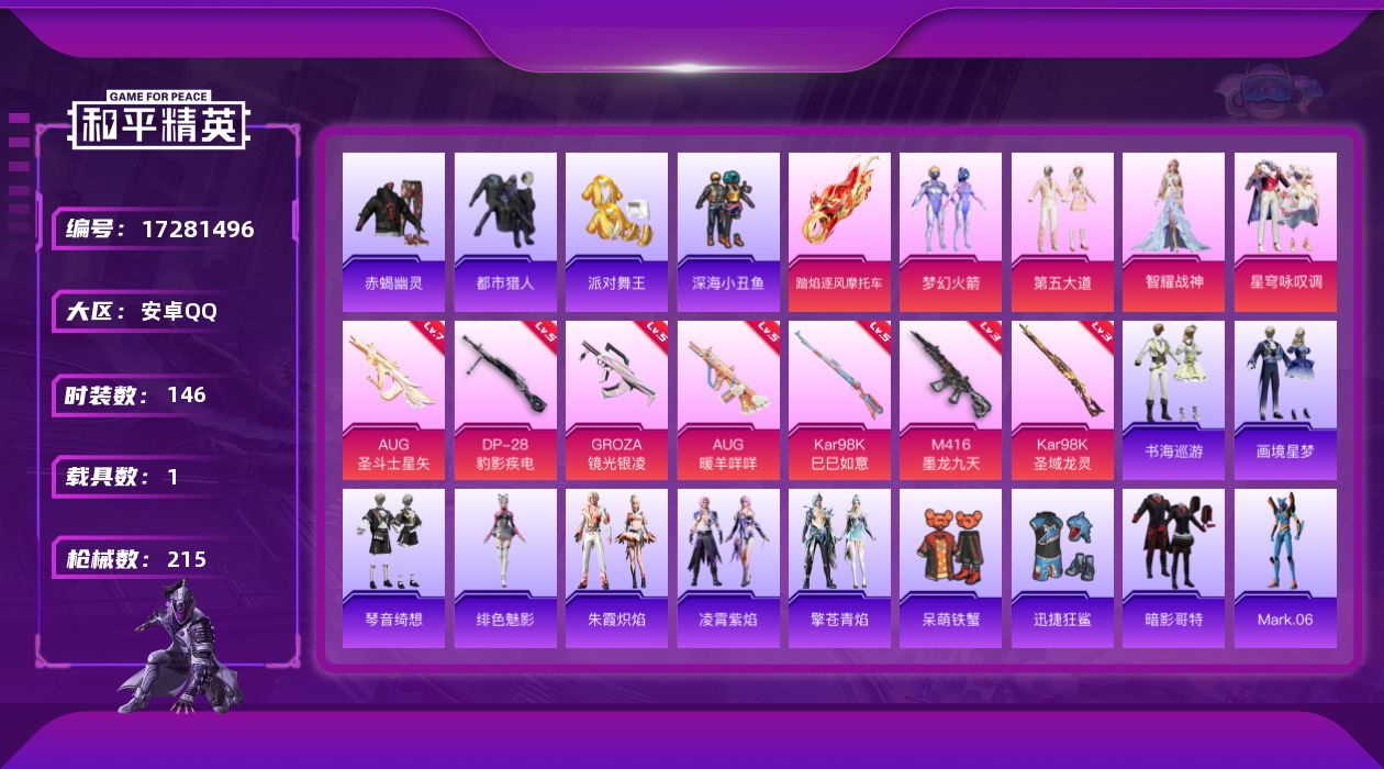 - PX_2091016- 安卓手Q-12王牌印记-16粉装-9特效枪-2载具-79332热力值-147套装-223枪皮-4卓越印记-2传奇印记 【16粉装】,梦幻火箭,宝贝奶油派,天使彩虹糖,小叽联名款,新星烈龙,第五大道,洛天依,幻彩电音,雪月幻音,翎光蝶翼,傲傲奶龙,橘柚倾心,金属狂野,圣堂之誓,未来歌姬,烟云彩露 【9特效枪】AKM-炫紫旋律-7级 SCAR-L-锦绣绵绵-5级 SCAR-L-