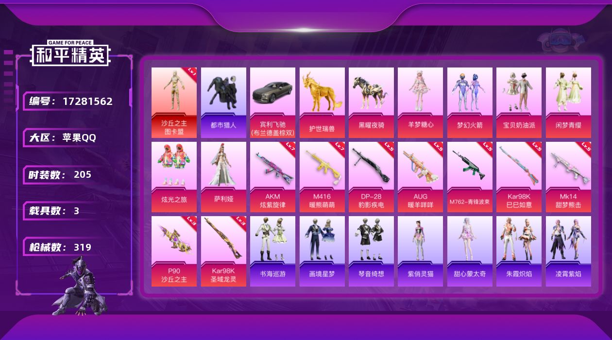 [17281562]苹果 手Q-1神装-6粉装-12特效枪-3载具-14粉色飞行器-98844热力值-17王牌印记-205套装-319枪皮