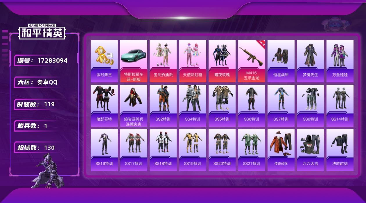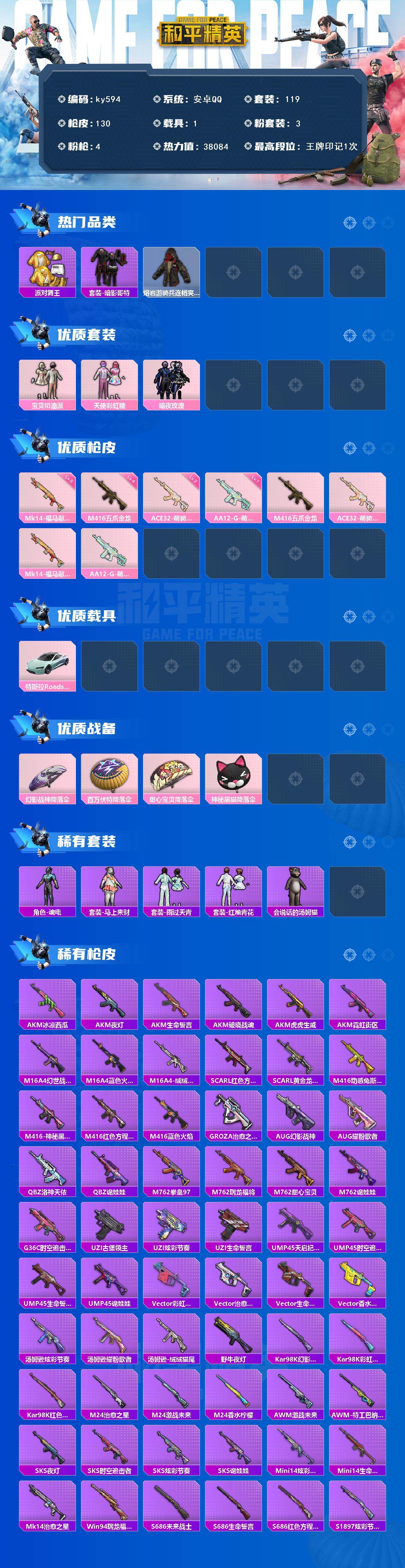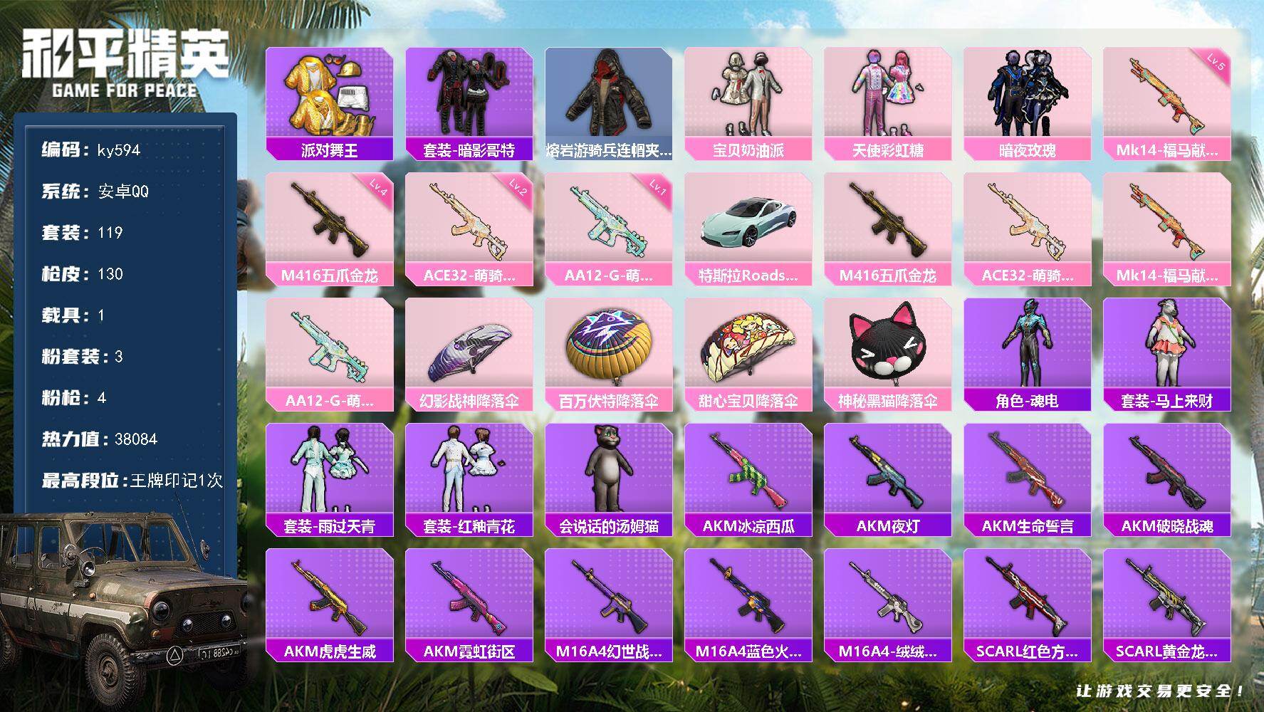 [17283094]安卓 手Q-3粉装-4特效枪-1载具-0粉色飞行器-38084热力值-1王牌印记-119套装-130枪皮 【热门品类】:套装-派对舞王,套装-暗影哥特,熔岩游骑兵连帽夹克 【粉色套装】:粉装-宝贝奶油派,粉装-天使彩虹糖,粉装-暗夜玫瑰 【粉色枪皮等级】:M416-五爪金龙(四级),ACE32-萌骑漫游(二级),Mk14-福马献瑞(五级),AA12-G-萌骑幻想(一级) 【粉色载具】:特斯拉Roadster(水滴蓝) 【粉色枪皮】:M416-五爪金龙,ACE32-萌骑漫游,Mk14-福马献瑞,AA12-G-萌骑幻想 【粉色降落伞】:幻影战神降落伞,百万伏特降落伞,甜心宝贝降落伞,神秘黑猫降落伞 【稀有套装】:角色-魂电,套装-马上来财,套装-雨过天青,套装-红釉青花,玩偶服-会说话的汤姆猫 【稀有枪皮】:AKM-冰凉西瓜,AKM-夜灯,AKM-生命誓言,AKM-破晓战魂,AKM-虎虎生威,AKM-霓虹街区,M16A4-幻世战舞者,M16A4-蓝色火焰,M16A4-绒绒猫尾,SCAR-L-红色方程式,SCAR-L-黄金龙骨,M416-动感兔斯基,M416-神秘黑猫,M416-红色方程式,M416-蓝色火焰,GROZA-治愈之星,AUG-幻影战神,AUG-耀粉歌者,QBZ-洛神天依,QBZ-诡娃娃,M762-拳皇97,M762-瑞龙福将,M762-甜心宝贝,M762-诡娃娃,G36C-时空追击者,UZI-古堡领主,UZI-炫彩节奏,UZI-生命誓言,UMP45-天启纪元,UMP45-时空追击者,UMP45-生命誓言,UMP45-诡娃娃,Vector-彩虹符号,Vector-治愈之星,Vector-生命誓言,Vector-香水柠檬,汤姆逊-炫彩节奏,汤姆逊-耀粉歌者,汤姆逊-绒绒猫尾,野牛-夜灯,Kar98K-幻影战神,Kar98K-彩虹符号,Kar98K-红色方程式,M24-治愈之星,M24-激战未来,M24-香水柠檬,AWM-激战未来,AWM-特工巴纳纳,SKS-夜灯,SKS-时空追击者,SKS-炫彩节奏,SKS-诡娃娃,Mini14-炫彩节奏,Mini14-生命誓言,Mk14-治愈之星,Win94-瑞龙福将,S686-未来战士,S686-生命誓言,S686-红色方程式,S1897-炫彩节奏,S1897-百万伏特,S12K-瑞龙福将,S12K-破晓战魂,S12K-龙