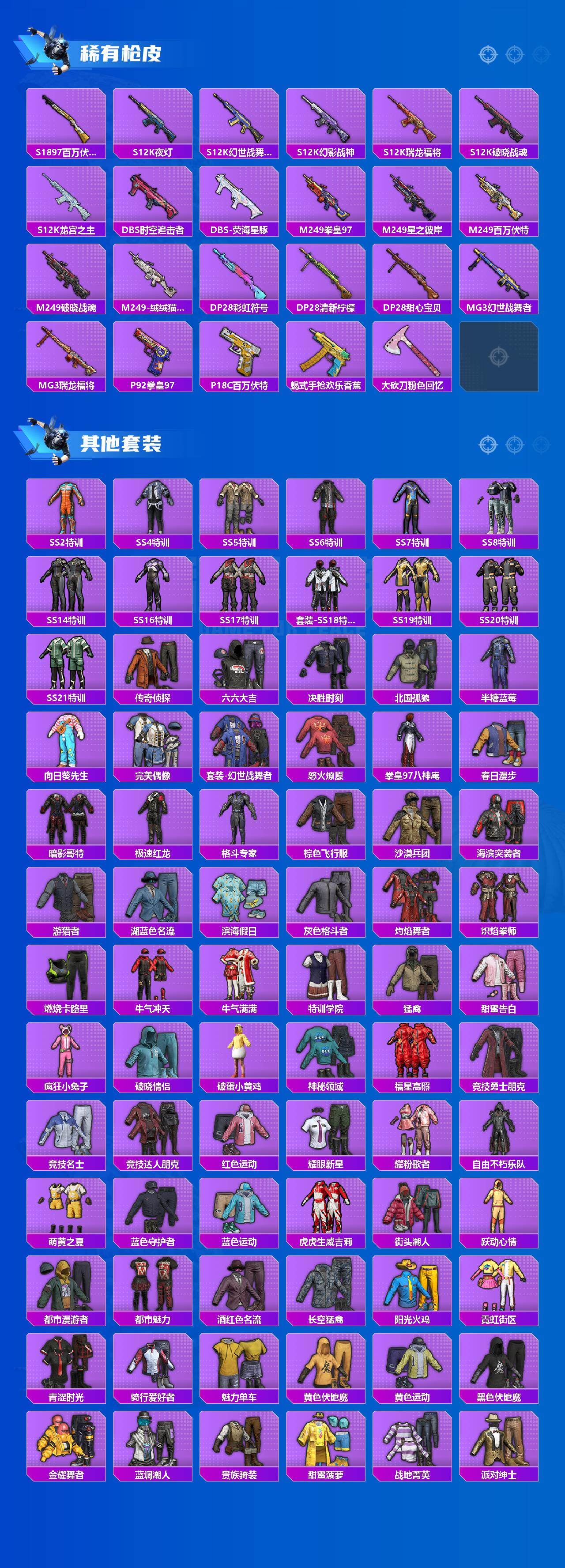【稀有枪皮】:AKM-冰凉西瓜,AKM-夜灯,AKM-生命誓言,AKM-破晓战魂,AKM-虎虎生威,AKM-霓虹街区,M16A4-幻世战舞者,M16A4-蓝色火焰,M16A4-绒绒猫尾,SCAR-L-红色方程式,SCAR-L-黄金龙骨,M416-动感兔斯基,M416-神秘黑猫,M416-红色方程式,M416-蓝色火焰,GROZA-治愈之星,AUG-幻影战神,AUG-耀粉歌者,QBZ-洛神天依,QBZ-诡娃娃,M762-拳皇97,M762-瑞龙福将,M762-甜心宝贝,M762-诡娃娃,G36C-时空追击者,UZI-古堡领主,UZI-炫彩节奏,UZI-生命誓言,UMP45-天启纪元,UMP45-时空追击者,UMP45-生命誓言,UMP45-诡娃娃,Vector-彩虹符号,Vector-治愈之星,Vector-生命誓言,Vector-香水柠檬,汤姆逊-炫彩节奏,汤姆逊-耀粉歌者,汤姆逊-绒绒猫尾,野牛-夜灯,Kar98K-幻影战神,Kar98K-彩虹符号,Kar98K-红色方程式,M24-治愈之星,M24-激战未来,M24-香水柠檬,AWM-激战未来,AWM-特工巴纳纳,SKS-夜灯,SKS-时空追击者,SKS-炫彩节奏,SKS-诡娃娃,Mini14-炫彩节奏,Mini14-生命誓言,Mk14-治愈之星,Win94-瑞龙福将,S686-未来战士,S686-生命誓言,S686-红色方程式,S1897-炫彩节奏,S1897-百万伏特,S12K-瑞龙福将,S12K-破晓战魂,S12K-龙