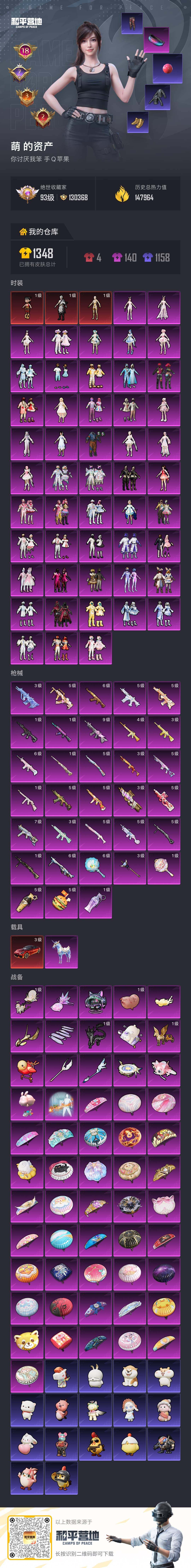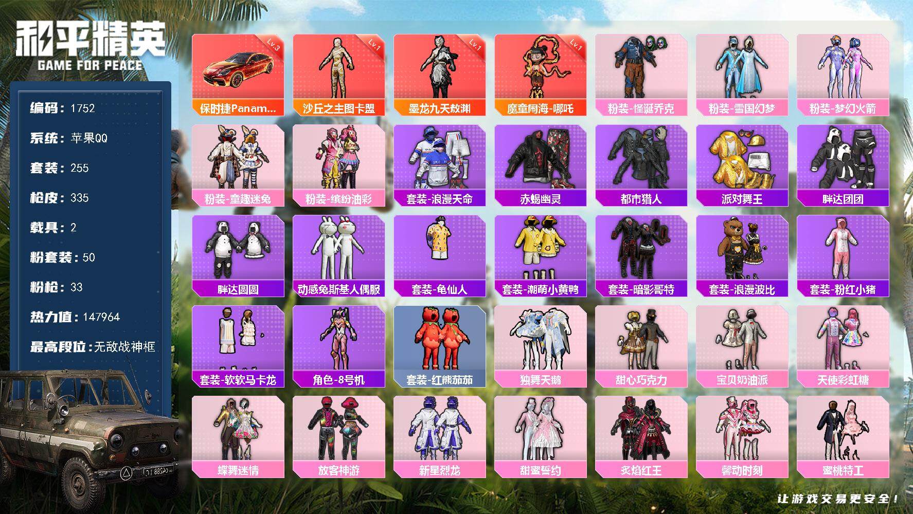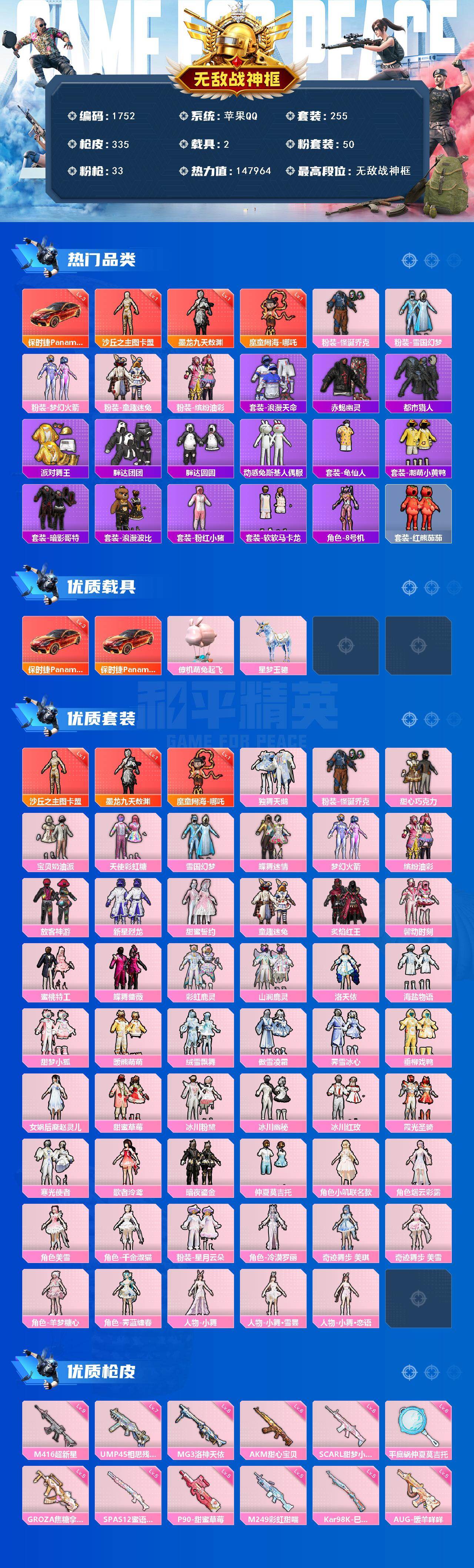 [17283279]【1752】苹果 手Q-无敌战神框-3神装-50粉装-33特效枪-2载具-15粉色飞行器-147964热力值-18王牌印记-255套装-335枪皮