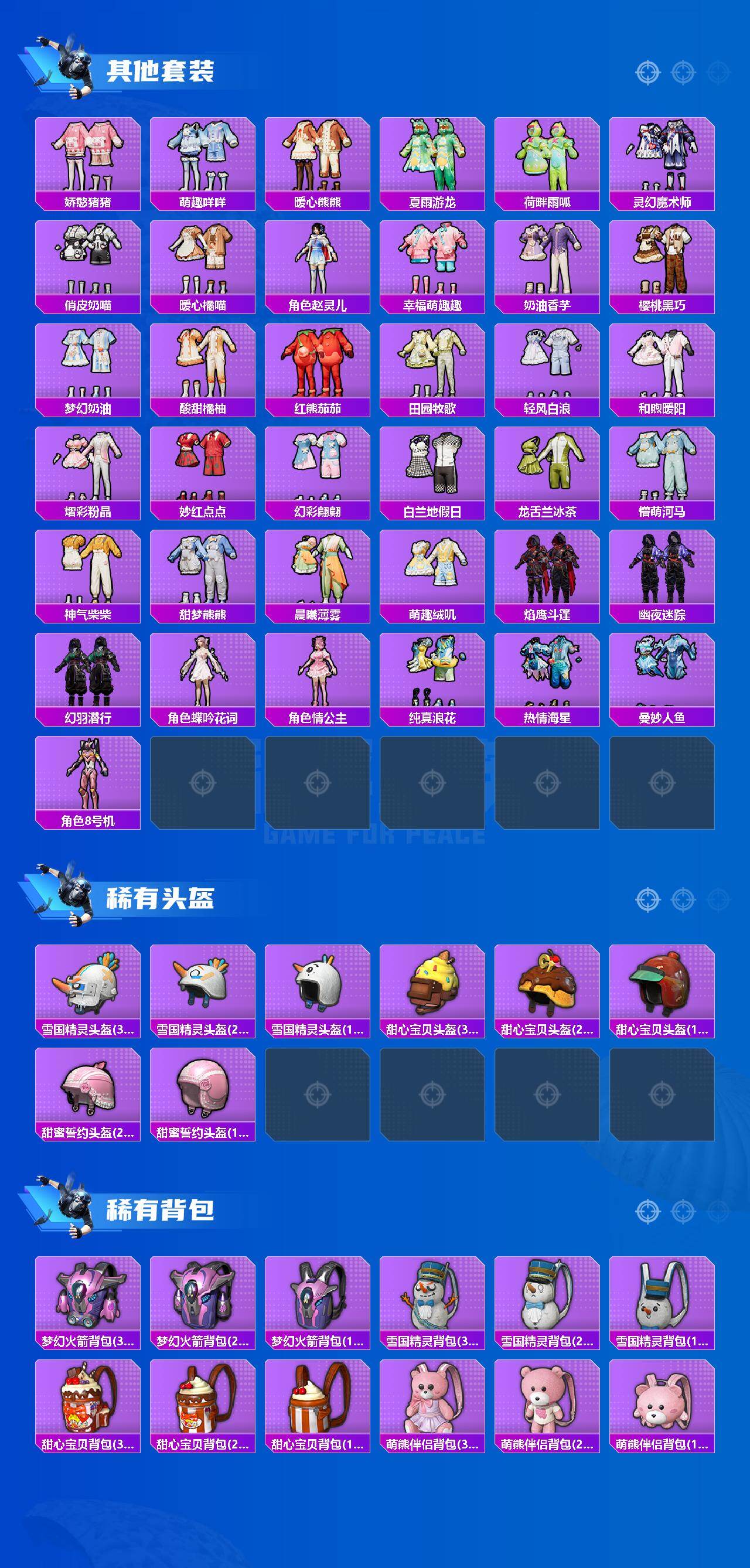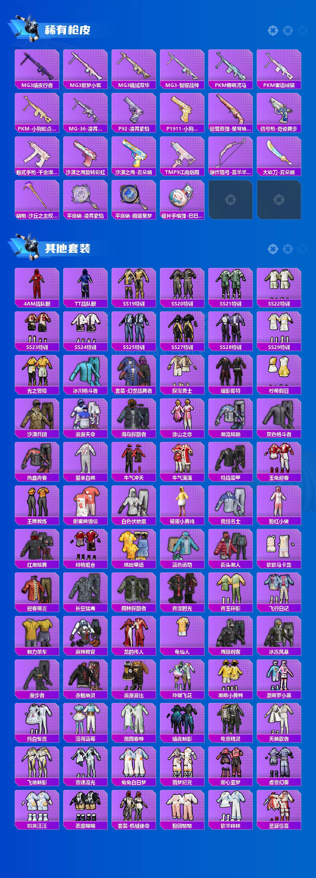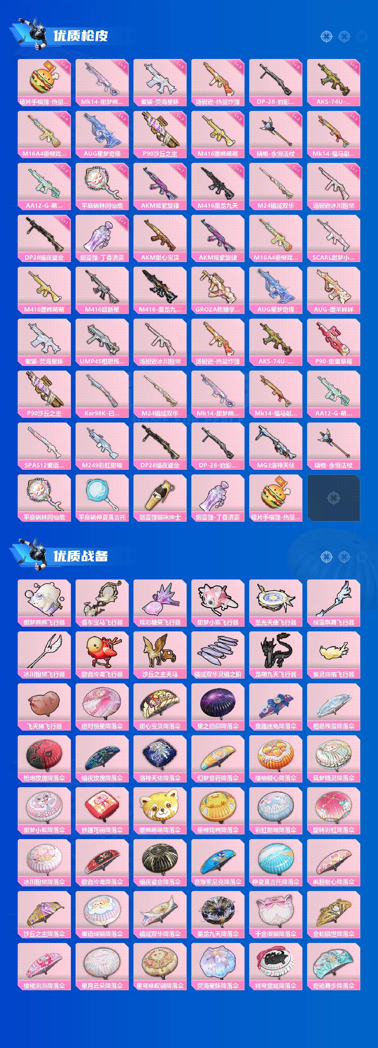 AKM-甜心宝贝,AKM-炫紫旋律,M16A4-垂柳戏鸭,SCAR-L-甜梦小狐,M416-暖熊萌萌,M416-超新星,M416-墨龙九天,GROZA-焦糖拿铁,AUG-星梦奇缘,AUG-暖羊咩咩,UMP45-相思残雪,汤姆逊-冰川粉黛,P90-甜蜜草莓,P90-沙丘之主,Kar98K-巳巳如意,M24-镜域双华,SPAS-12-蜜语绒猫,M249-彩虹甜喵,DP-28-暗夜鎏金,MG3-洛神天依,平底锅-林间仙鹿,平底锅-仲夏莫吉托,烟雾弹-猫咪绅士,烟雾弹-丁香清露,破片手榴弹-热量炸弹