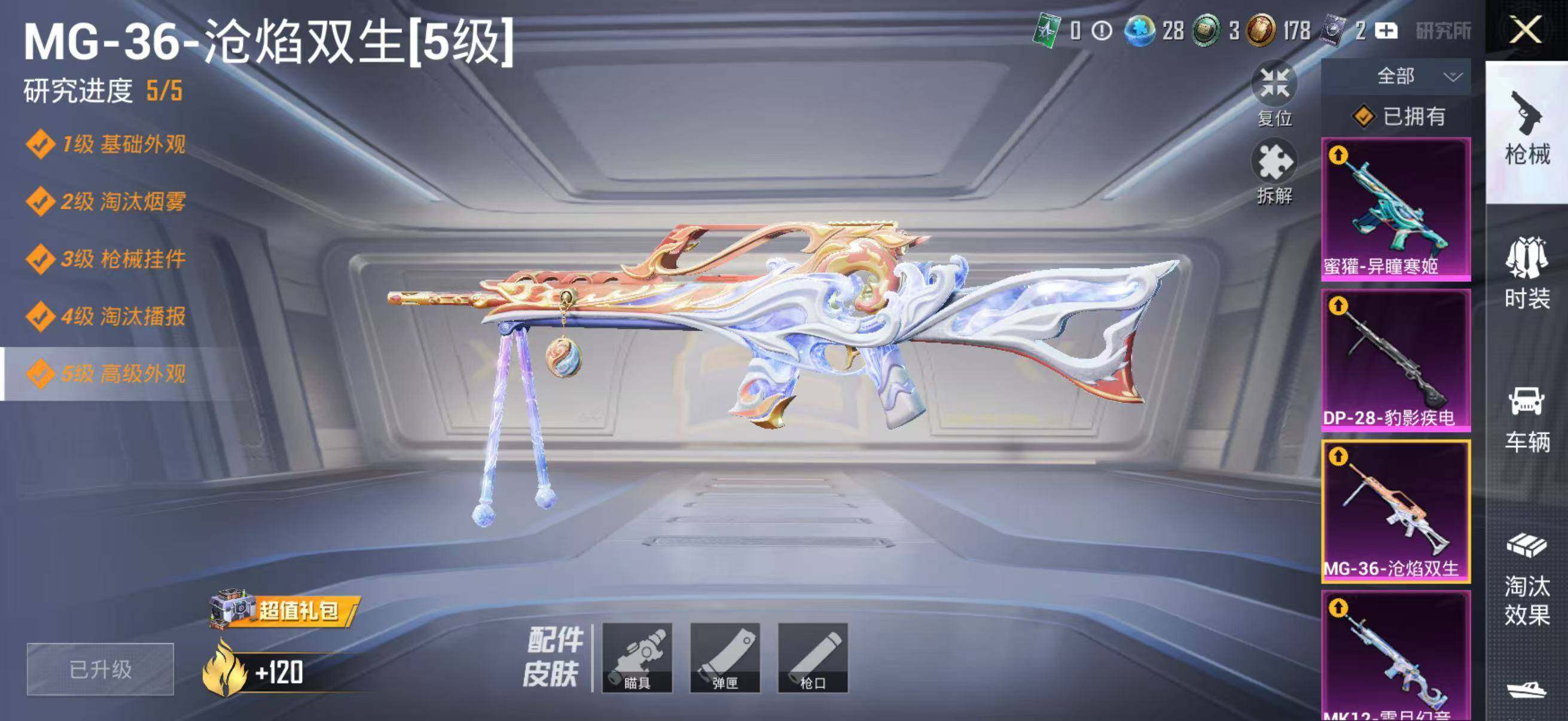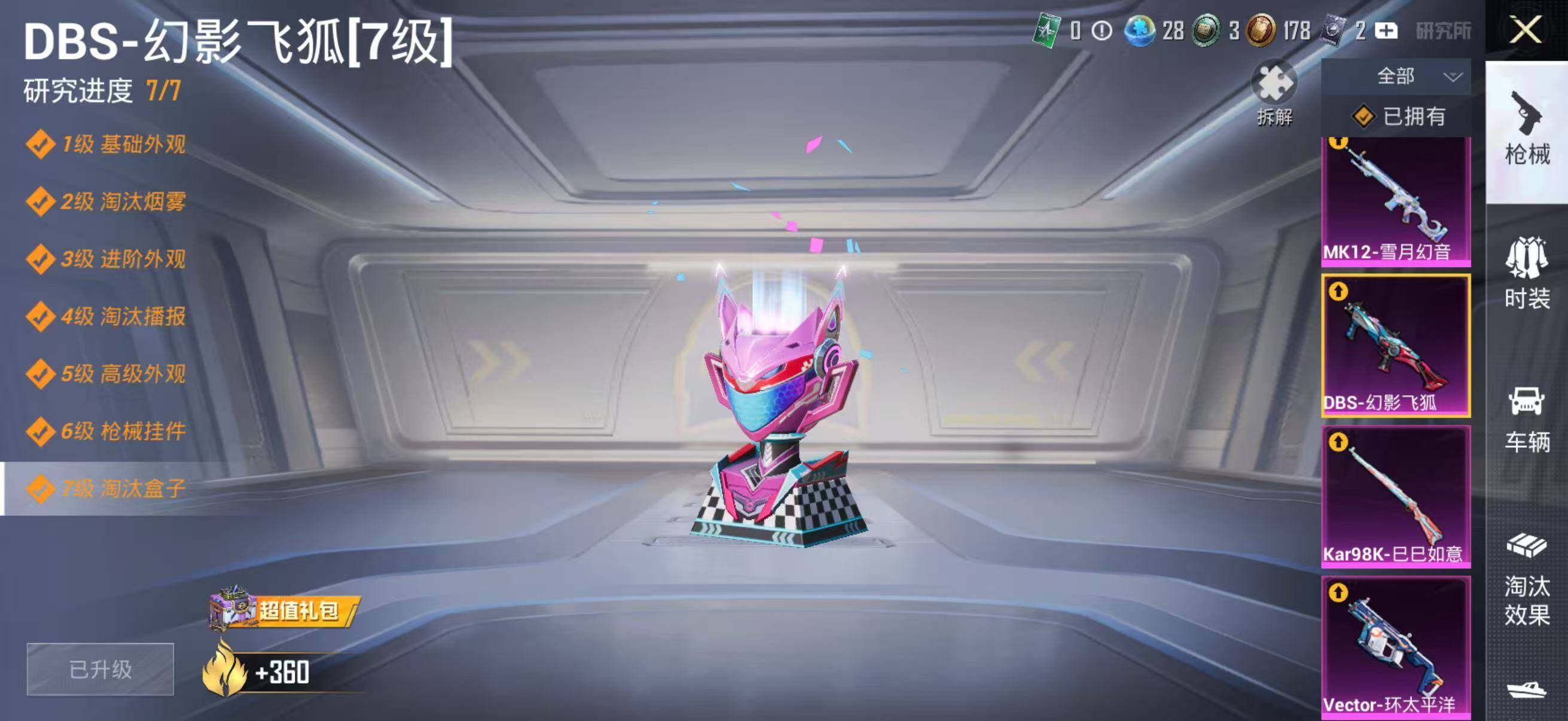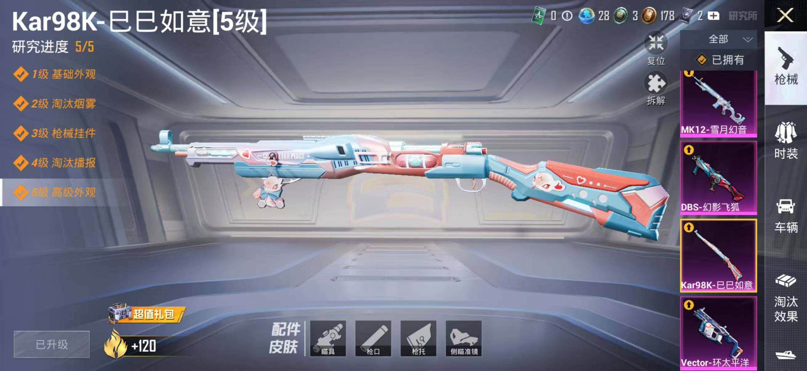 【粉色枪皮等级】:蜜獾-异瞳寒姬(四级),Vector-环太平洋(七级),Kar98K-巳巳如意(五级),MK12-雪月幻音(六级),DBS-幻影飞狐(七级),DP-28-豹影疾电(五级),MG-36-沧焰双生(五级)