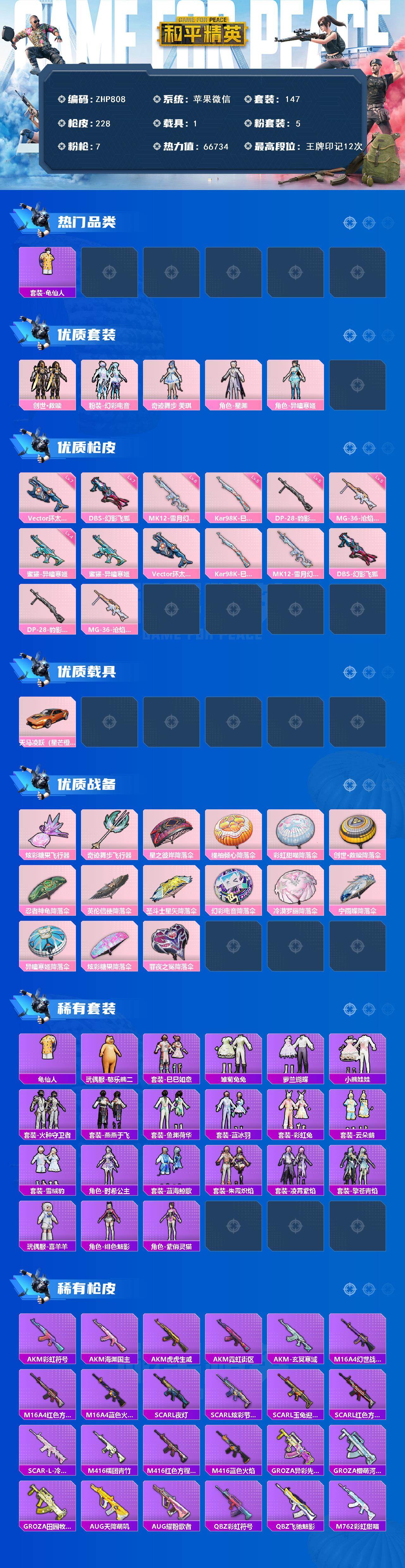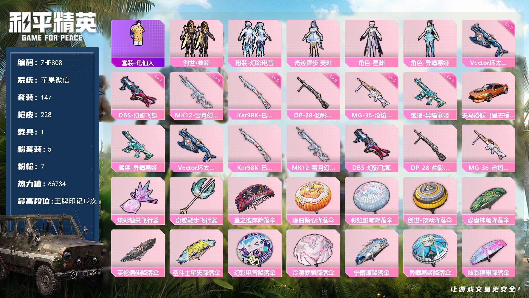 [17283923]苹果 微信-5粉装-7特效枪-1载具-2粉色飞行器-66734热力值-12王牌印记-147套装-228枪皮 【热门品类】:套装-龟仙人 【粉色套装】:套装-创世·救赎,粉装-幻彩电音,角色-奇迹舞步 美琪,角色-星渊,角色-异瞳寒姬 【粉色枪皮等级】:蜜獾-异瞳寒姬(四级),Vector-环太平洋(七级),Kar98K-巳巳如意(五级),MK12-雪月幻音(六级),DBS-幻影飞狐(七级),DP-28-豹影疾电(五级),MG-36-沧焰双生(五级) 【粉色载具】:天马凌跃(星芒橙) 【粉色枪皮】:蜜獾-异瞳寒姬,Vector-环太平洋,Kar98K-巳巳如意,MK12-雪月幻音,DBS-幻影飞狐,DP-28-豹影疾电,MG-36-沧焰双生 【粉色飞行器】:炫彩糖果飞行器,奇迹舞步飞行器 【粉色降落伞】:星之彼岸降落伞,橘柚倾心降落伞,彩虹甜喵降落伞,创世·救赎降落伞,忍者神龟降落伞,英伦信使降落伞,圣斗士星矢降落伞,幻彩电音降落伞,冷漠罗丽降落伞,宁雨蝶降落伞,异瞳寒姬降落伞,炫彩糖果降落伞,罪夜之冕降落伞 【稀有套装】:套装-龟仙人,玩偶服-憨乐熊二,套装-巳巳如意,套装-炫彩糖果,套装-雏菊兔兔,套装-萝兰蝴蝶,套装-小熊娃娃,套装-火种守卫者,套装-燕燕于飞,套装-鱼渊荷华,套装-蓝冰羽,套装-彩虹兔,套装-云朵鹅,套装-雪绒豹,角色-时希公主,套装-蓝海鲸歌,套装-朱霞炽焰,套装-凌霄紫焰,套装-擎苍青焰,玩偶服-喜羊羊,角色-绯色魅影,角色-紫俏灵猫 【稀有枪皮】:AKM-彩虹符号,AKM-海渊国主,AKM-虎虎生威,AKM-霓虹街区,AKM-玄冥寒域,M16A4-幻世战舞者,M16A4-红色方程式,M16A4-蓝色火焰,SCAR-L-夜灯,SCAR-L-炫彩节奏,SCAR-L-玉兔迎春,SCAR-L-红色方程式,SCAR-L-冷漠罗丽,M416-糯团青竹,M416-红色方程式,M416-蓝色火焰,GROZA-异彩先驱,GROZA-懵萌河马,GROZA-田园牧歌,AUG-天降萌叽,AUG-耀粉歌者,QBZ-彩虹符号,QBZ-飞驰魅影,M762-彩虹甜喵,M762-瑞龙福将,M762-云朵鹅,G36C-懵萌河马,AC-VAL-天降萌叽,AC-VAL-彩虹甜喵,蜜獾-娇憨猪猪,蜜獾-绯穹魔姬,ACE32-蓝晶绮麟,ARX-凌霄紫焰,UZI-啾咪啾咪,UZI-