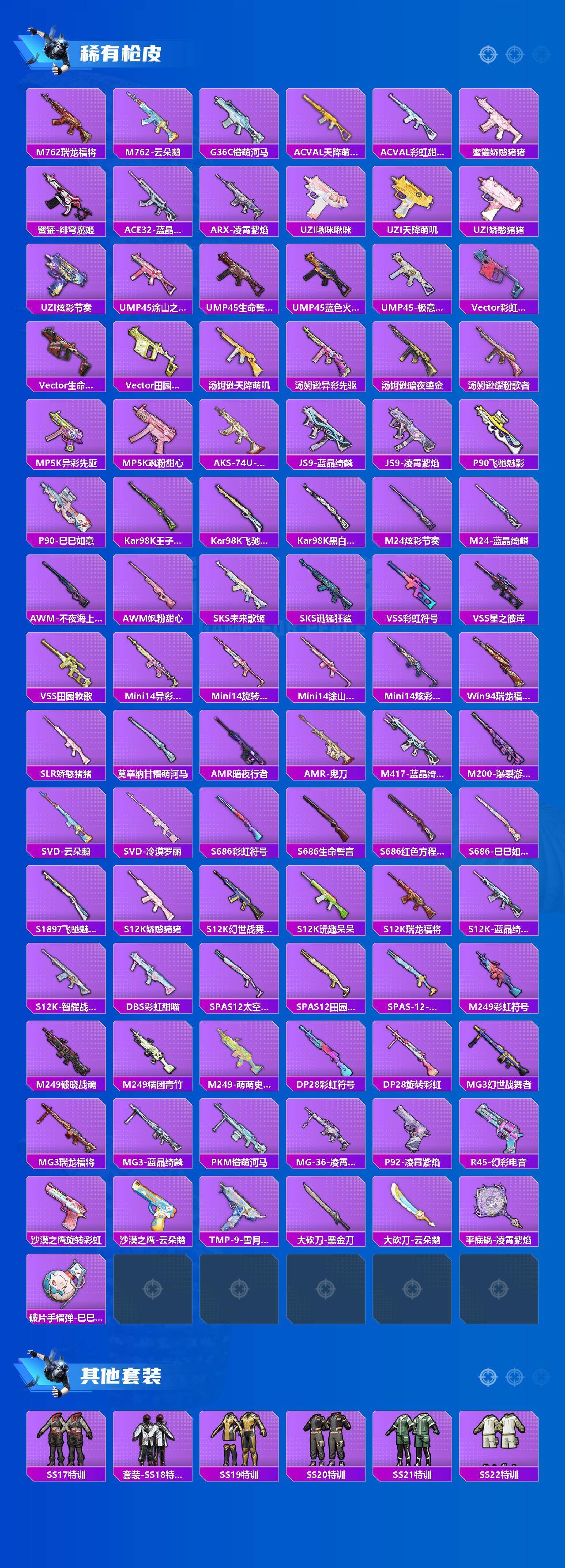 【稀有枪皮】:AKM-彩虹符号,AKM-海渊国主,AKM-虎虎生威,AKM-霓虹街区,AKM-玄冥寒域,M16A4-幻世战舞者,M16A4-红色方程式,M16A4-蓝色火焰,SCAR-L-夜灯,SCAR-L-炫彩节奏,SCAR-L-玉兔迎春,SCAR-L-红色方程式,SCAR-L-冷漠罗丽,M416-糯团青竹,M416-红色方程式,M416-蓝色火焰,GROZA-异彩先驱,GROZA-懵萌河马,GROZA-田园牧歌,AUG-天降萌叽,AUG-耀粉歌者,QBZ-彩虹符号,QBZ-飞驰魅影,M762-彩虹甜喵,M762-瑞龙福将,M762-云朵鹅,G36C-懵萌河马,AC-VAL-天降萌叽,AC-VAL-彩虹甜喵,蜜獾-娇憨猪猪,蜜獾-绯穹魔姬,ACE32-蓝晶绮麟,ARX-凌霄紫焰,UZI-啾咪啾咪,UZI-