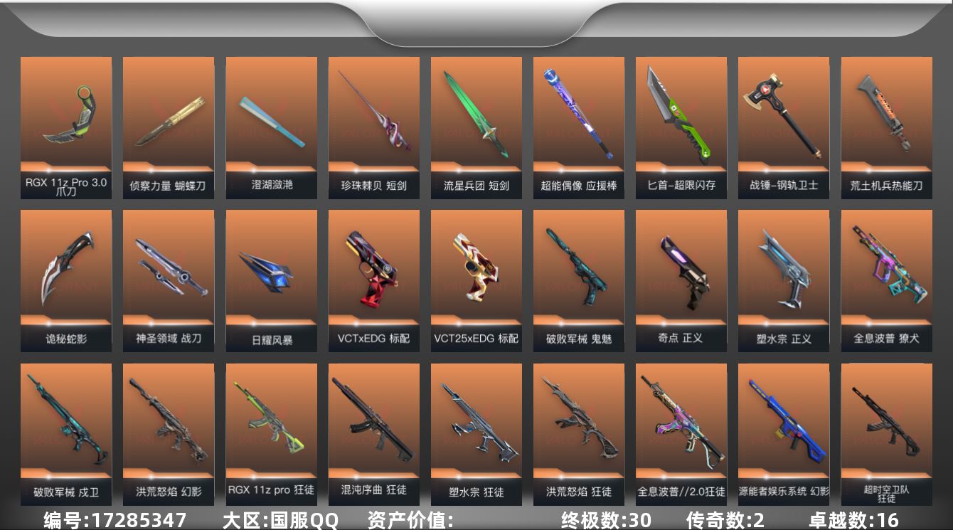 [17285347]【套装】:VCTxEDG 队伍套装 【英雄】:幻棱,炼狱,维斯,暮蝶,钛狐,壹决,铁臂,捷风,雷兹,幽影,不死鸟,贤者,猎枭,蝰蛇,零,芮娜,奇乐,尚勃勒,霓虹,斯凯,夜露,星礈,K/O,海神,盖可,黑梦,钢锁 【近战武器】:近战武器-魔术火花,近战武器-侦察力量 蝴蝶刀,近战武器-紫金爪刀,近战武器-RGX 11z Pro//3.0 爪刀,近战武器-落英飞旋,近战武器-威龙之刃,近战武器-澄湖潋滟,近战武器-珍珠棘贝 短剑,近战武器-流星兵团 短剑,近战武器-超能偶像 应援棒,近战武器-超限闪存 匕首,近战武器-盖亚之愠,近战武器-钢轨卫士 战锤,近战武器-荒土机兵 热能刀,近战武器-诡秘蛇影 军刀,近战武器-神圣领域 战刀,近战武器-日耀风暴 遗器,近战武器-魔术火花 【狂徒】:狂徒-超时空卫队,狂徒-洪荒怒焰,狂徒-混沌序曲,狂徒-全息波普//2.0,狂徒-塑水宗,狂徒-RGX 11z Pro,狂徒-堕天遗武,狂徒-掠影,狂徒-盖亚的复仇,狂徒-日冕雄师,狂徒-紫阙金琅,狂徒-超能偶像,狂徒-钢轨卫士,狂徒-荒土机兵,狂徒-流星兵团,狂徒-诡秘蛇影 【幻影】:幻影-源能者娱乐系统,幻影-洪荒怒焰,幻影-般若假面,幻影-侦察力量,幻影-异鳞魔蛇,幻影-超限闪存,幻影-珍珠棘贝,幻影-神圣领域,幻影-聚合之力,幻影-纳米打击,幻影-战术小伙伴,幻影-末日之翼 【戍卫】:戍卫-破败军械,戍卫-超能偶像,戍卫-钢轨卫士,戍卫-珍珠棘贝,戍卫-浮光跃金,戍卫-逆冲蛮牛,戍卫-战术熊与伙伴们,戍卫-月球哨兵,戍卫-折光棱晶 【獠犬】:獠犬-全息波普,獠犬-冰点凝冻,獠犬-神圣领域,獠犬-采蜜小蜂队,獠犬-复古浪潮,獠犬-模拟赫兹,獠犬-逆冲蛮牛,獠犬-战术小伙伴 【冥驹】:冥驹-堕天遗武,冥驹-荒土机兵,冥驹-复古浪潮,冥驹-模拟赫兹,冥驹-星云暗涌 【飞将】:飞将-聚合之力,飞将-光导纤维,飞将-战术熊与伙伴们,飞将-末日之翼 【莽侠】:莽侠-超限闪存,莽侠-诡秘蛇影,莽侠-深海水族,莽侠-纤云弄巧,莽侠-月球哨兵 【战神】:战神-神圣领域,战神-采蜜小蜂队,战神-浮光跃金,战神-深海水族 【奥丁】:奥丁-流星兵团,奥丁-纳米打击,奥丁-战术小伙伴,奥丁-末日之翼 【判官】:判官-超能偶像,判官-诡秘蛇影,判官-采蜜小蜂队,判官-纳米打击x 【雄鹿】:雄鹿-复古浪潮,